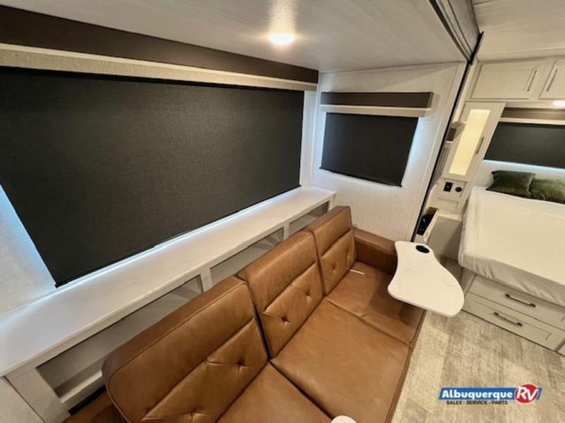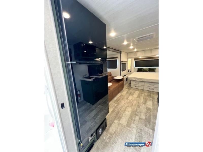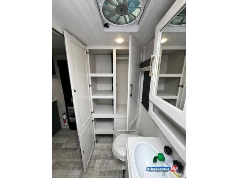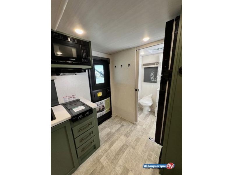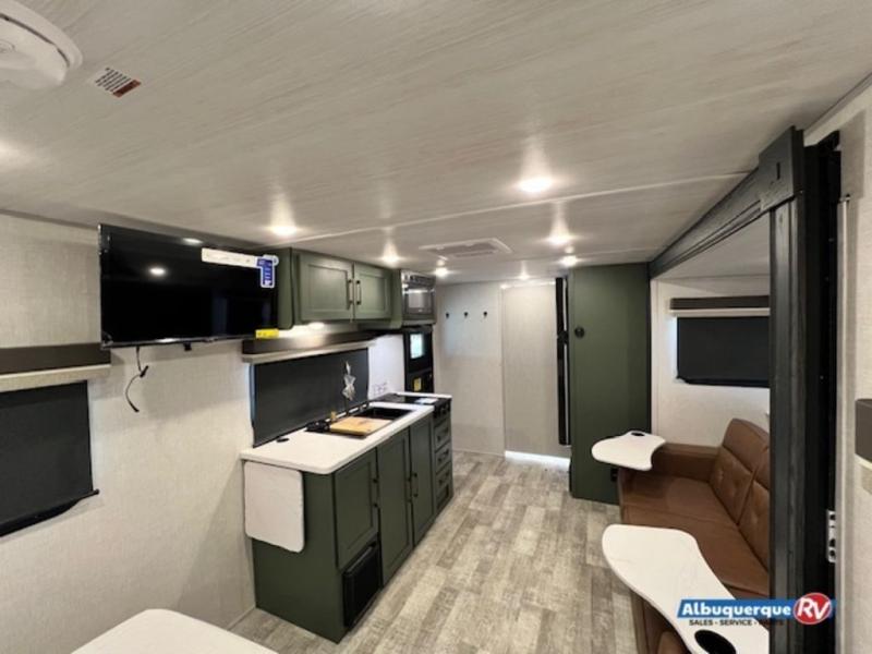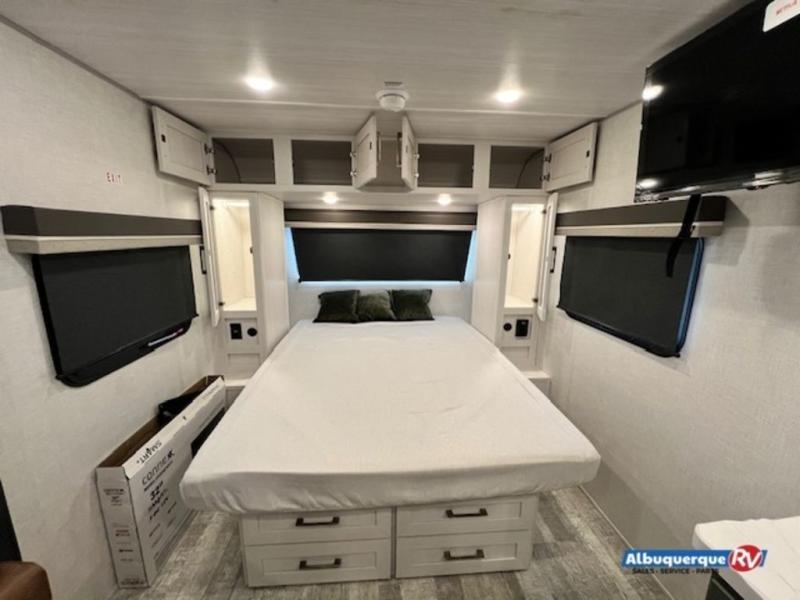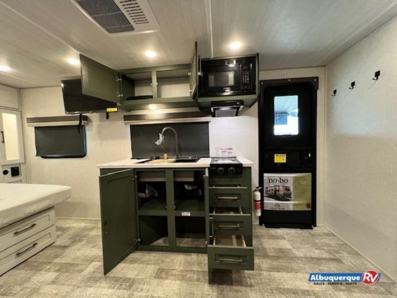 Make your camping dreams come true with this No Boundaries travel trailer! The kitchen has great amenities, like an all-in-one microwave and air fryer, a refrigerator, and a sink to clean up, but you may just find yourselves cooking on the outside kitchen. A jackknife sofa slide will provide seating and sleeping space for a guest, while you take the front queen bed. There are dual bedside wardrobes to keep your clothes organized, and the exterior slam latch cargo doors include pass-thru lighting so you can easily find what you're looking for even at night! The Beast Mode Package on this model comes with an additional 200W solar panel, a 2,000W inverter, and an independent suspension for better clearance and handling!