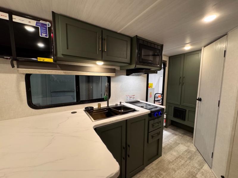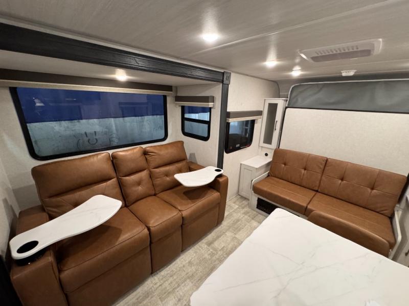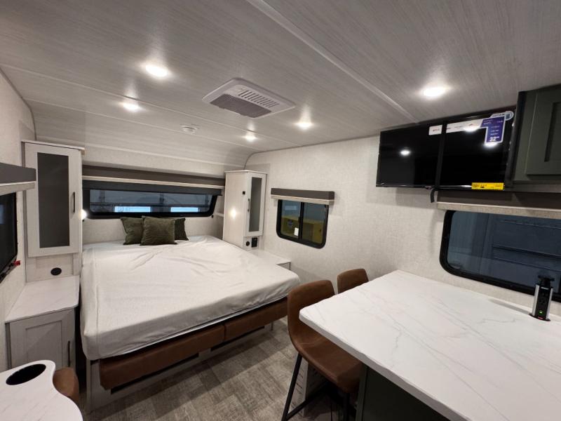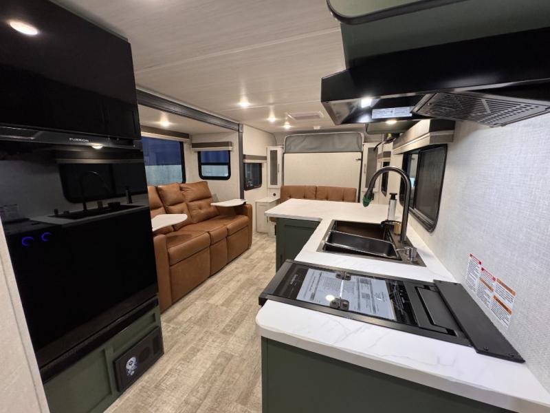 Make your camping dreams come true with this No Boundaries travel trailer! As you enter this unit, you'll notice an entryway pantry that you can use to store your coats and scarves, and the full bathroom is also right in front of the entry door for easy access when you need it. The kitchen has great amenities, like an all-in-one microwave and air fryer, a refrigerator, and a sink, and there is a breakfast bar with two stools to enjoy your coffee at each morning. When you fold away the Murphy bed in the morning, you'll have a sofa to rest on throughout the day, plus an additional sofa within the slide out.