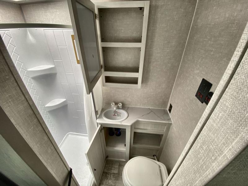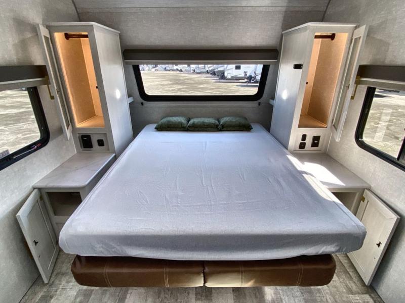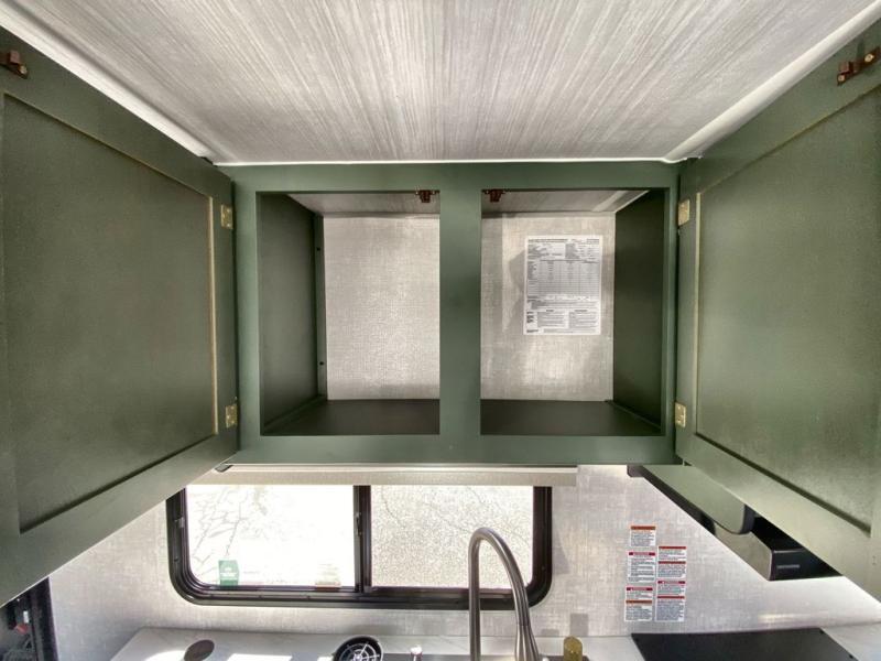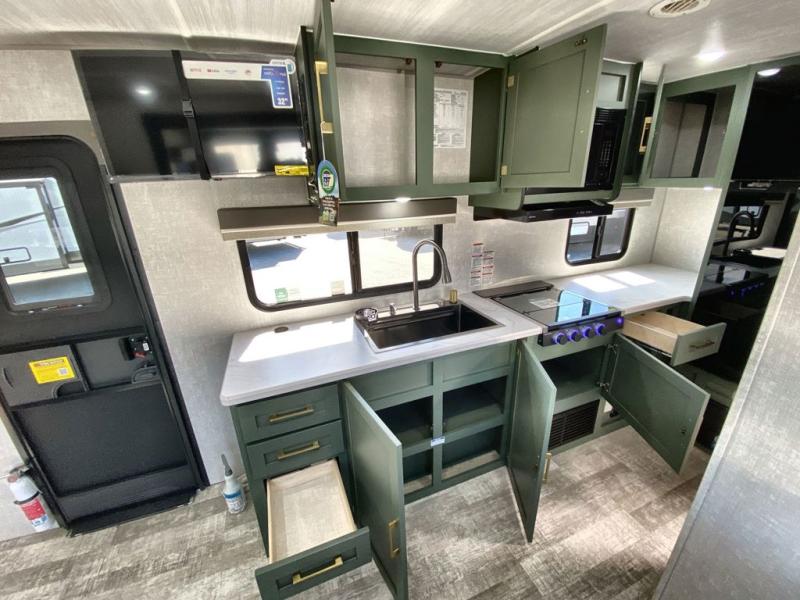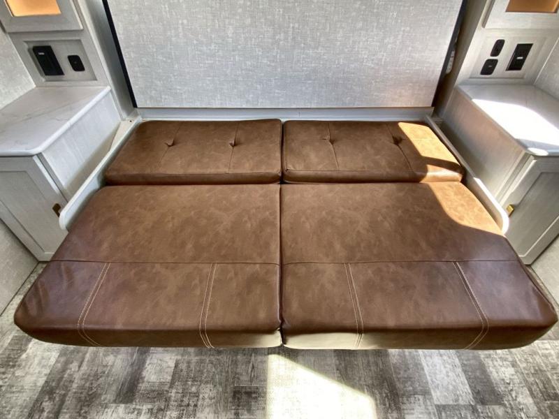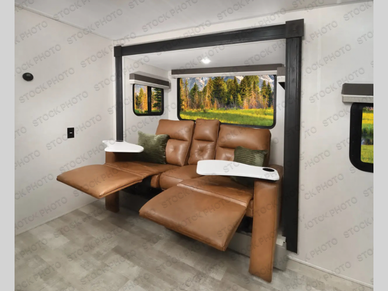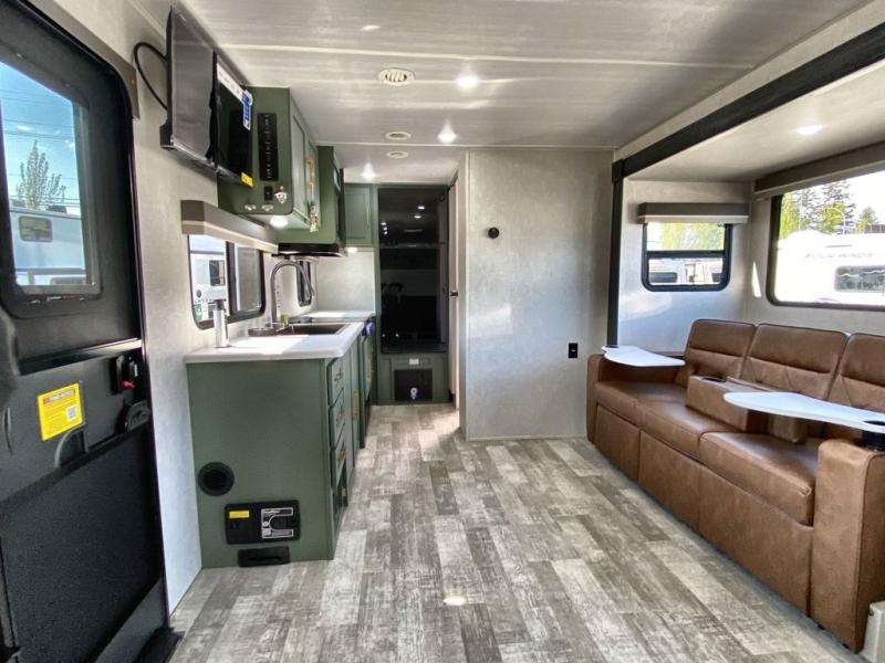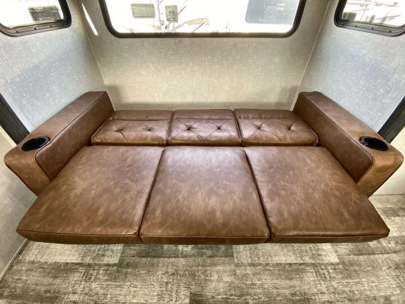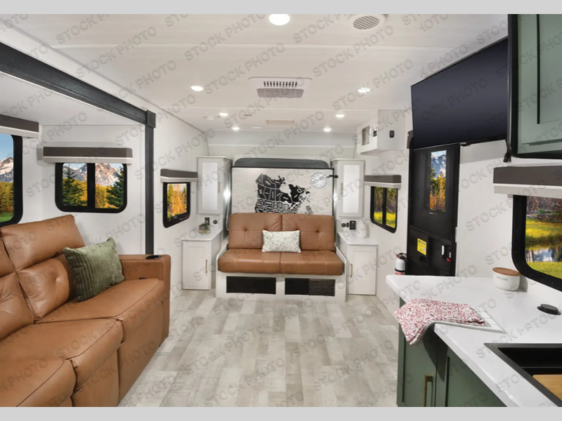 You'll love the versatility and space you'll have in this couple's trailer! The front Murphy bed provides seating and sleeping space, and the wardrobes will help keep your items organized. There is theater seating across from the TV so you can relax each evening, or you may just find yourselves outdoors under the patio awning. A full kitchen lets you cook and store meals while at the campground, and the full bath on board means you won't have to use the camp's facilities!