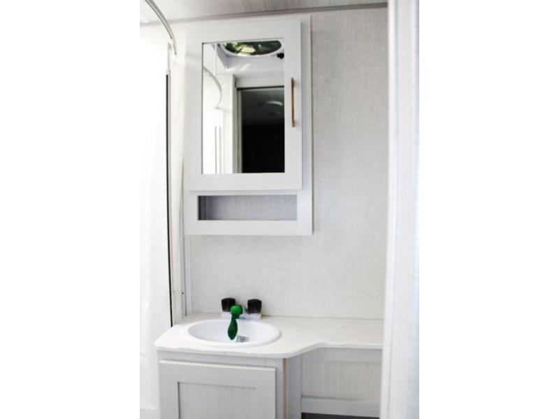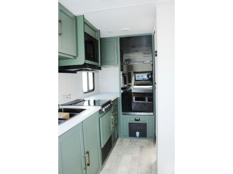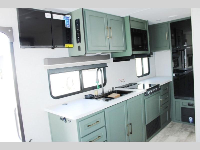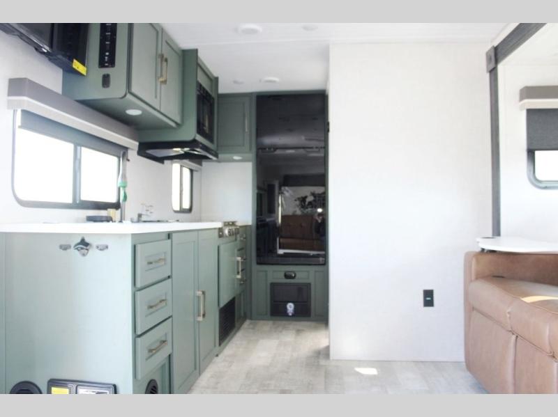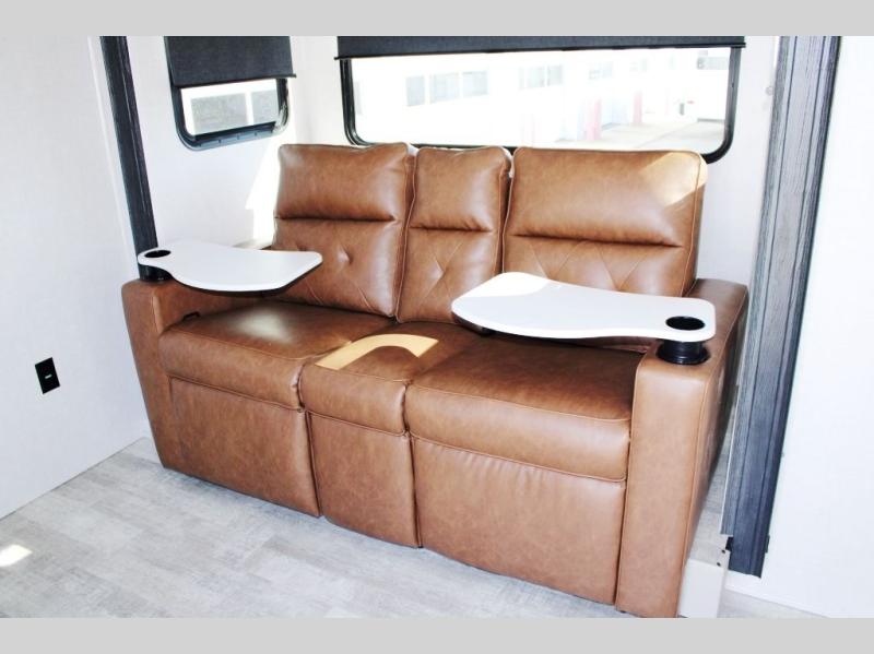 You'll love the versatility and space you'll have in this couple's trailer! The front Murphy bed provides seating and sleeping space, and the wardrobes will help keep your items organized. There is theater seating across from the TV so you can relax each evening, or you may just find yourselves outdoors under the patio awning. A full kitchen lets you cook and store meals while at the campground, and the full bath on board means you won't have to use the camp's facilities!