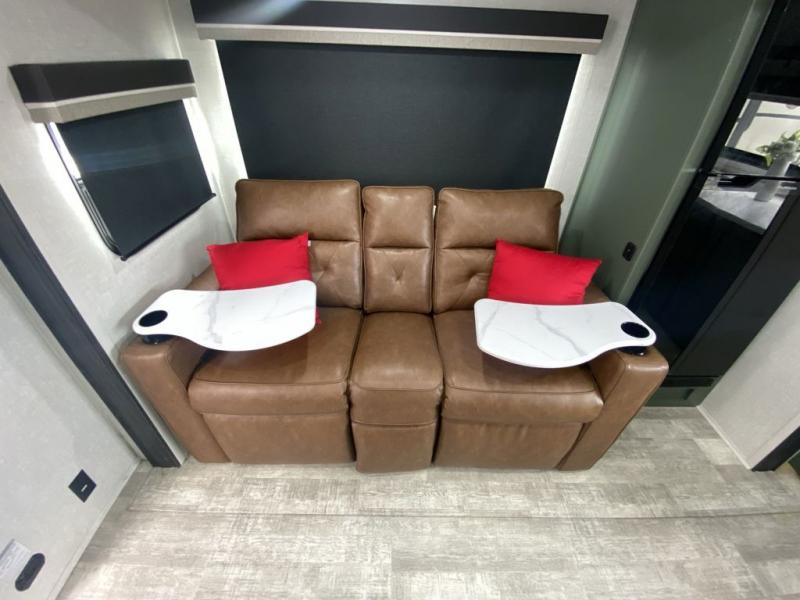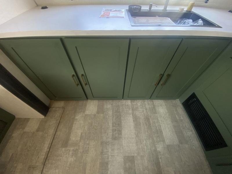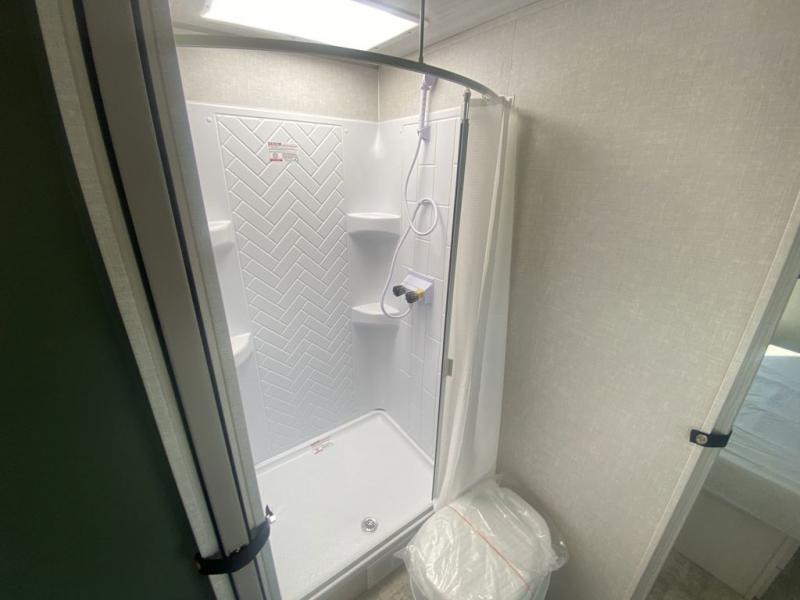 This couple's trailer is perfect for weekend trips or extended stays at the campground. A front kitchen includes generous counter space, along with a bar top and two seats. You can relax on the jackknife sofa slide after breakfast, or head outdoors to sit under the patio awning. The walk-thru bath will lead to the rear master bedroom where you'll find a queen bed and dual wardrobes for your clothes.
