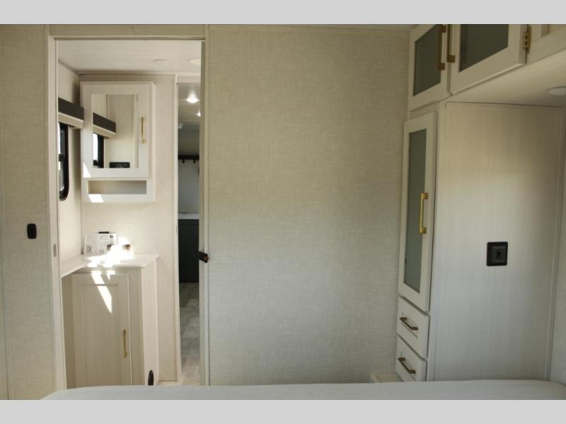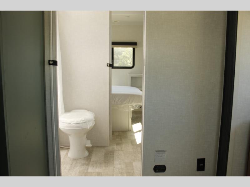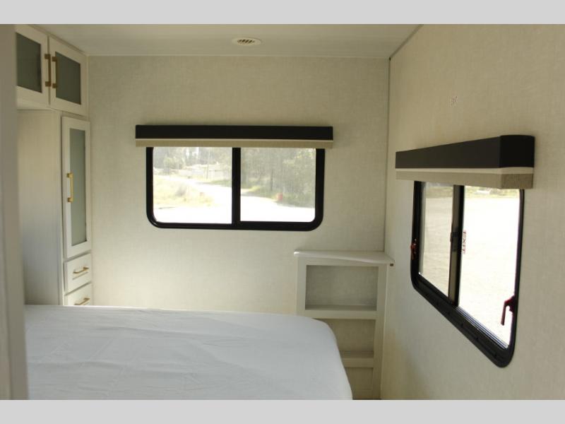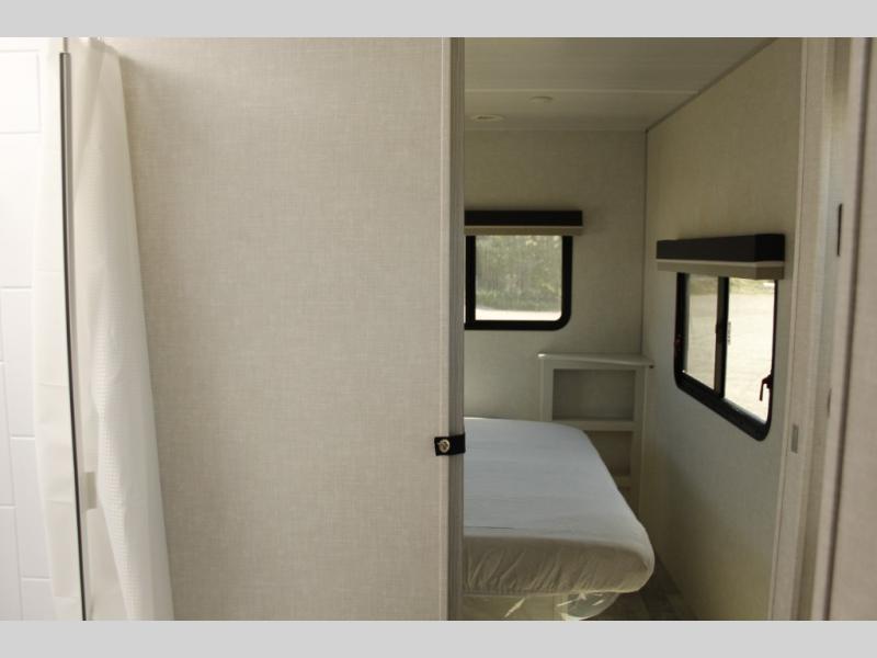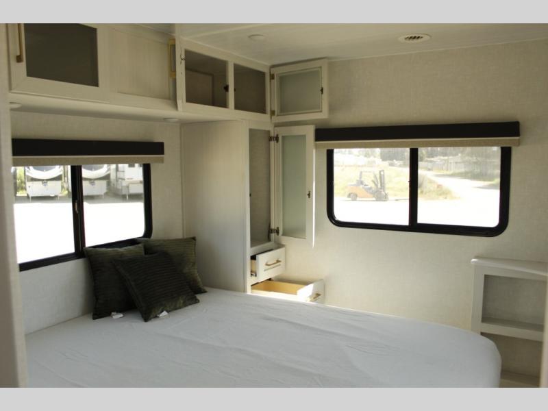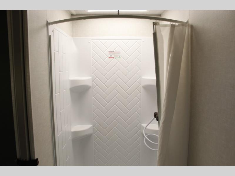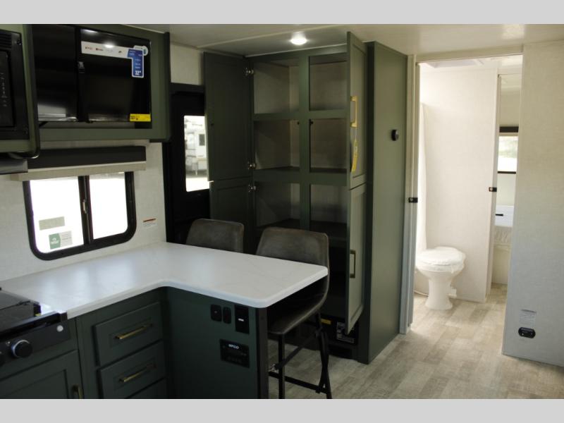 This couple's trailer is perfect for weekend trips or extended stays at the campground. A front kitchen includes generous counter space, along with a bar top and two seats. You can relax on the jackknife sofa slide after breakfast, or head outdoors to sit under the patio awning. The walk-thru bath will lead to the rear master bedroom where you'll find a queen bed and dual wardrobes for your clothes.
