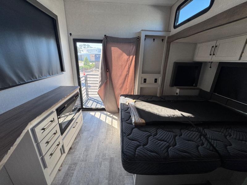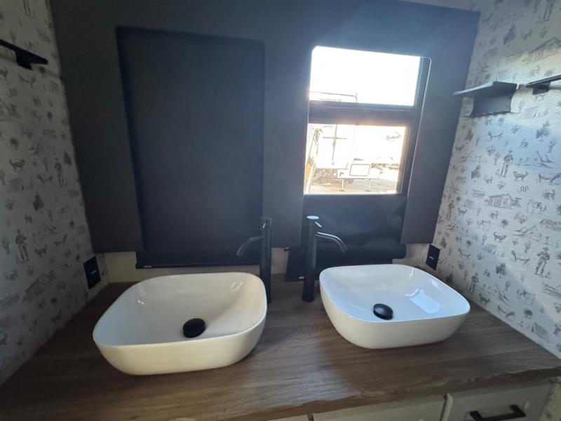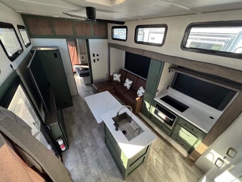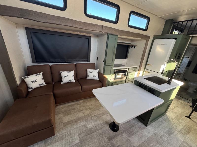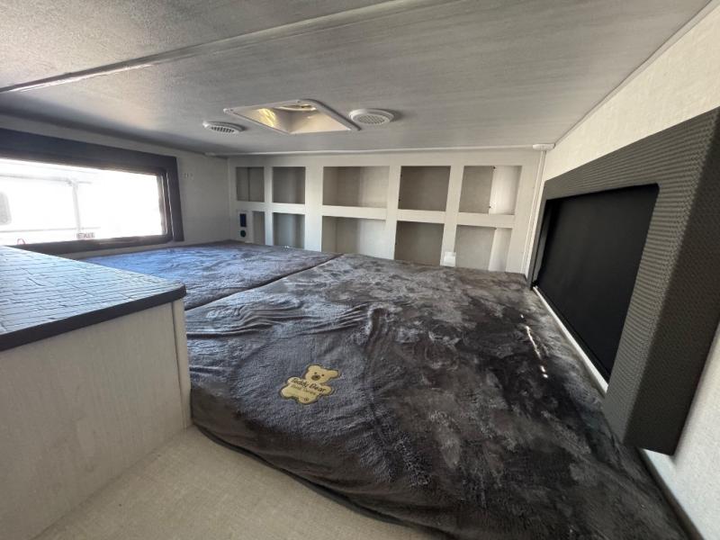 This travel trailer with a loft will be perfect for those who love to camp with friends and family! There are dual entry doors, one of which leads onto the rear sun deck and into the rear bedroom. Here, you'll find a king bed slide out with storage, a dresser and a desk with a chair, plus a bedroom fireplace. Your crew will love to sit around the kitchen island with four chairs, plus there is a luxury lounge here for more seating space. The kitchen pantry lets you store all your favorite goodies, and the entertainment center gives the option to watch movies. At night, your guests can head up the stairs to the loft with two 40" x 74" bunks and a dresser, and the front bath will let everyone stay clean throughout your trip. Dual bath sinks and a waterfall shower add luxury to this space, plus there is an optional washer/dryer combo if you want the option to make laundry day easier!