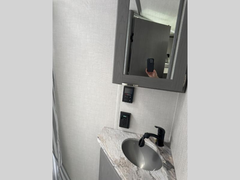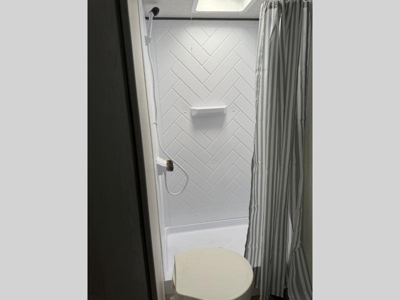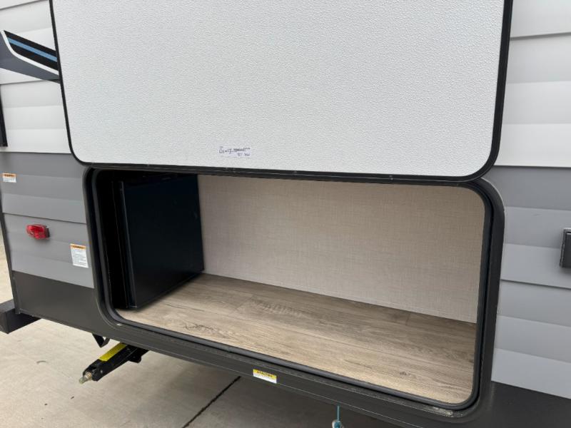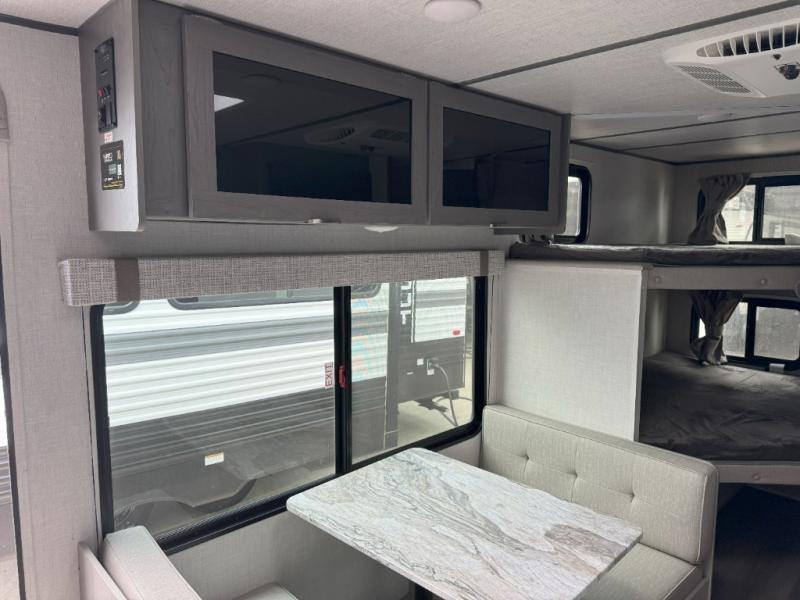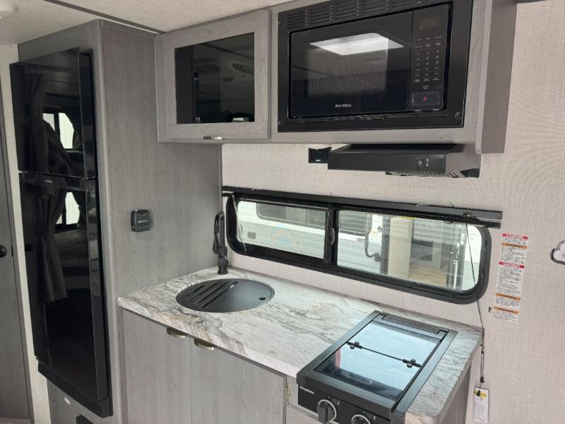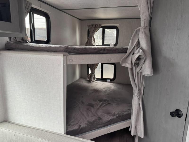 If you crave adventure, this Ozark travel trailer is ready to help you get your next fix! From the queen bed at the front to the double-size bunks in the back, you'll have comfortable sleeping accommodations for you and your fellow adventure junkies. You can also find space for one more tired camper on the both dinette. The full bathroom comes equipped with a shower, foot-flush toilet, and sink to help you clean up after you've spent all day outside. The kitchen will also be a big help after you've exerted all of your energy because it will provide you with a hearty meal when you use the two-burner cooktop to create something delicious. There is also a refrigerator for cold drinks and perishables, and the microwave will let you heat up something fast.