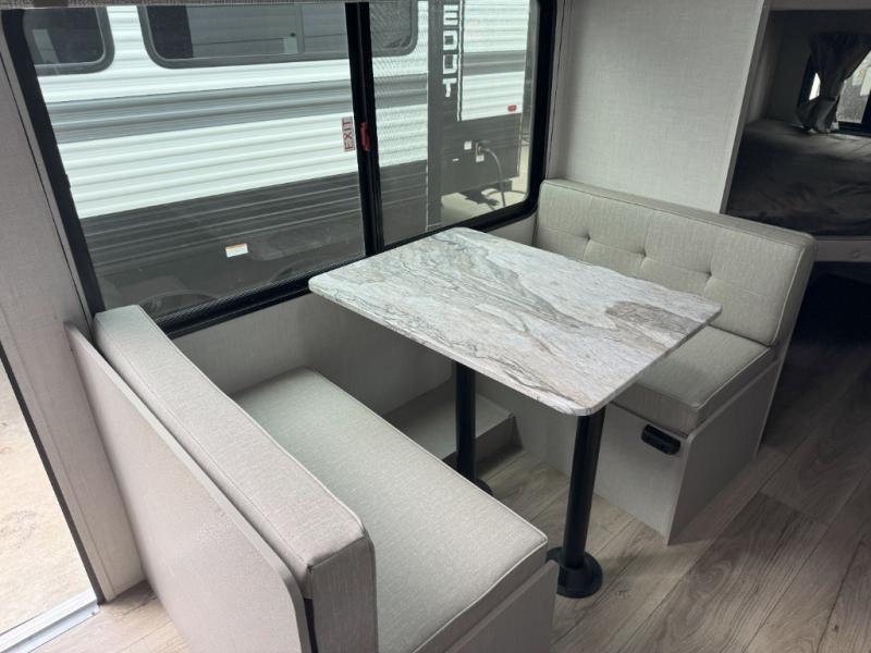 If you crave adventure, this Ozark travel trailer is ready to help you get your next fix! From the queen bed at the front to the double-size bunks in the back, you'll have comfortable sleeping accommodations for you and your fellow adventure junkies. You can also find space for one more tired camper on the both dinette. The full bathroom comes equipped with a shower, foot-flush toilet, and sink to help you clean up after you've spent all day outside. The kitchen will also be a big help after you've exerted all of your energy because it will provide you with a hearty meal when you use the two-burner cooktop to create something delicious. There is also a refrigerator for cold drinks and perishables, and the microwave will let you heat up something fast.