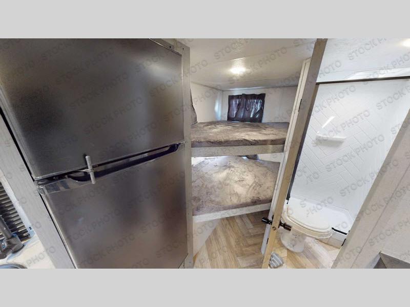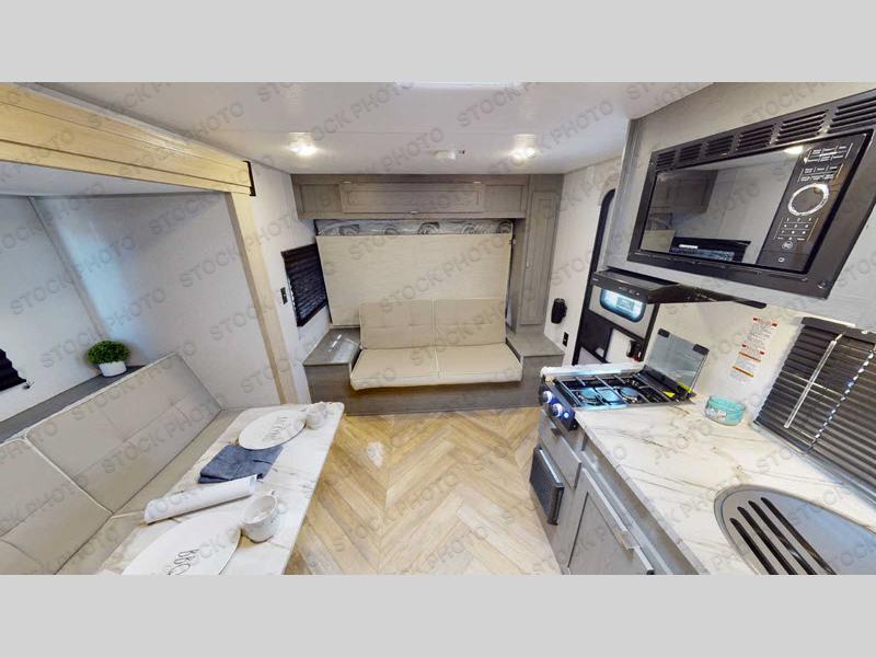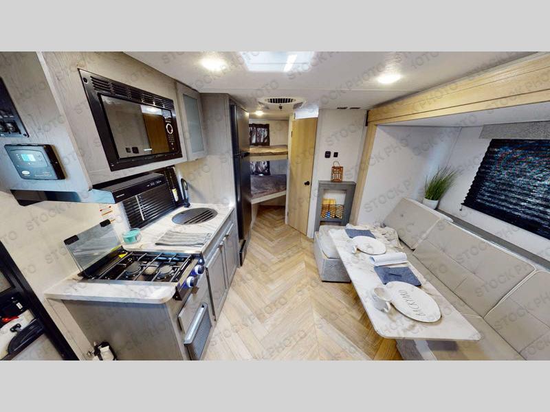 You can create the perfect oasis with this Ozark travel trailer! The exterior is outfitted with a 14' power awning to protect you from the hot summer sun and rain. On the interior, there is extra roominess thanks to the single slide. This slide holds the convertible chaise lounge with a table where you can dine at. The Murphy bed is especially useful when you are trying to be frugal with your space because it can fold away to reveal a sofa during the day allowing more space to move about. The double-size bunks provide plenty of sleeping space, and the panoramic window and shower skylight let the sunshine in.
