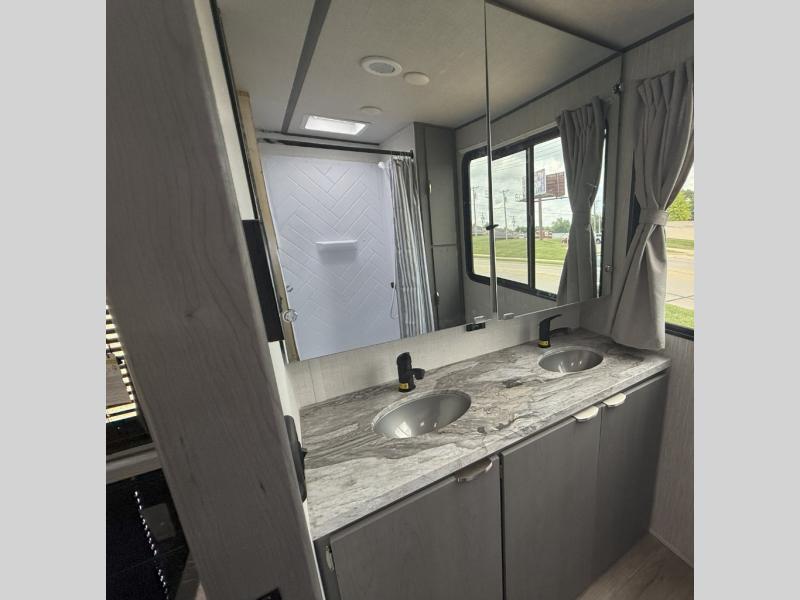 Escape the city life for weekends at the campground in this travel trailer for four. You will be pleased to find a king bed in the front private bedroom, along with dual bedroom wardrobes to keep your clothes tidy. The full rear bath includes dual bath sinks so you both can get ready at the same time, and there is a shower with a linen closet to keep clean towels close by. Your crew can relax on the L-shaped open lounge and removable table, and the chef of your group can keep themselves busy in the kitchen. There is a 3-in-1 cooktop with a convection oven, a pantry and 12V refrigerator for food storage.