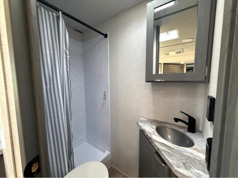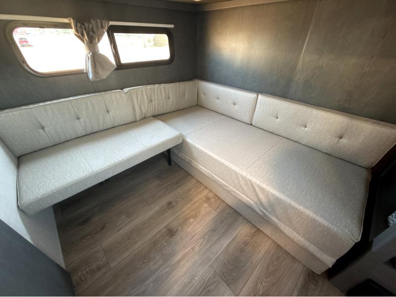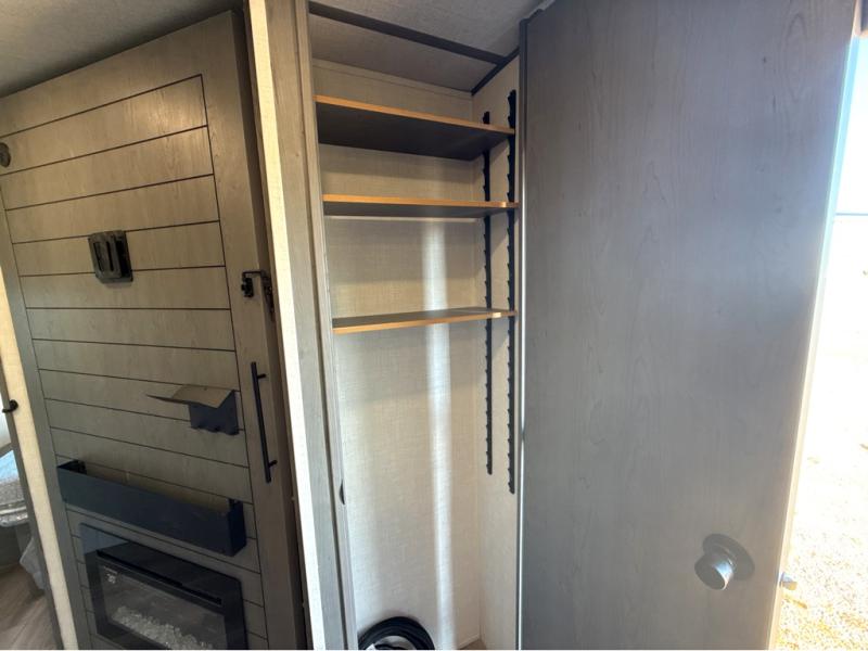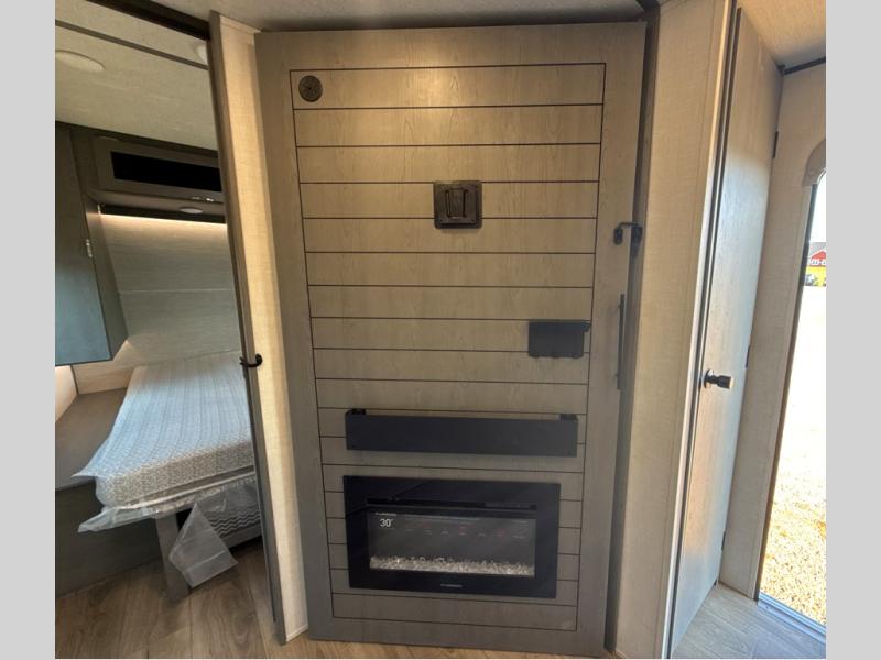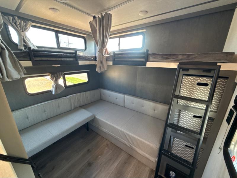 Trips to the lake just got sweeter in this travel trailer with a large slide for more space. Here, you'll find an L-shaped open lounge with a removable table, and the entertainment center with a fireplace will make it feel a little more like home. A full bath with a 24' x 36" shower will let you clean up each day without having to use the camp's facilities, and the rear bunkhouse will provide sleeping space for your guests or kids. There are two bunk beds here, along with an open lounge/queen bed combo and storage space to keep this room tidy. Head up front to enjoy the private bedroom all to yourselves with a king bed and dual wardrobes for wrinkle-free clothes!