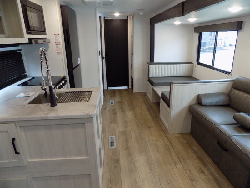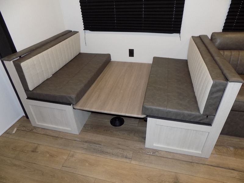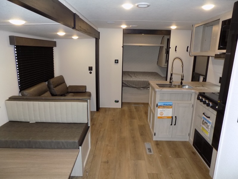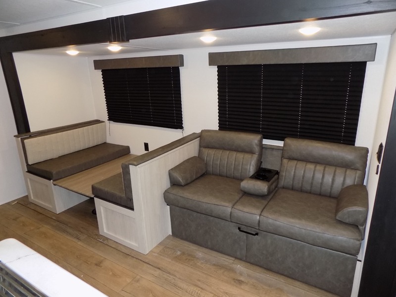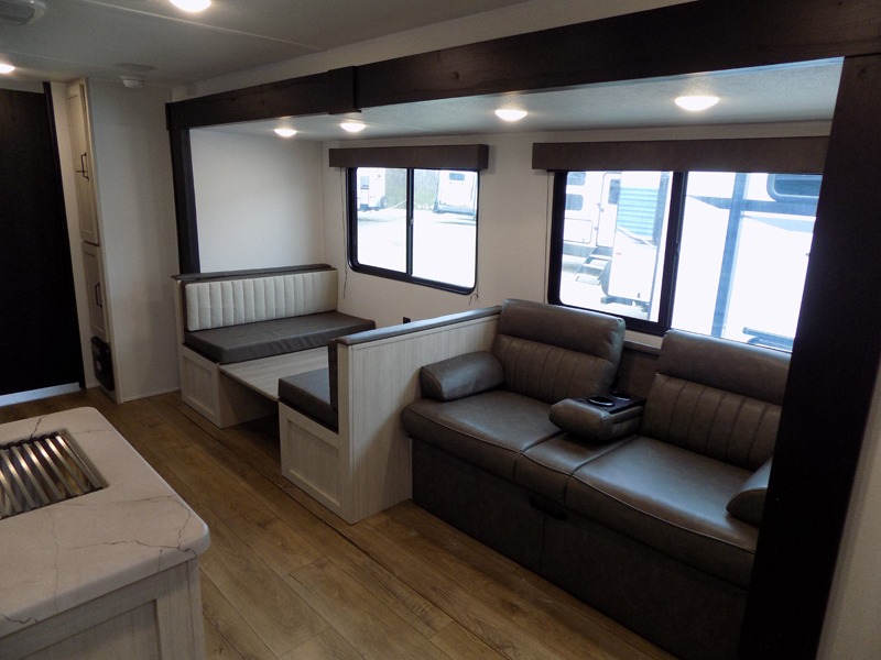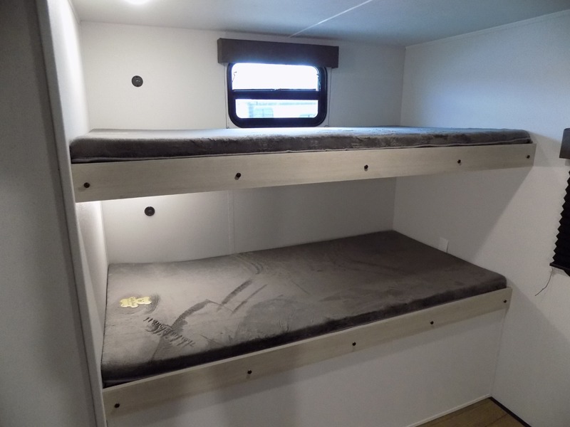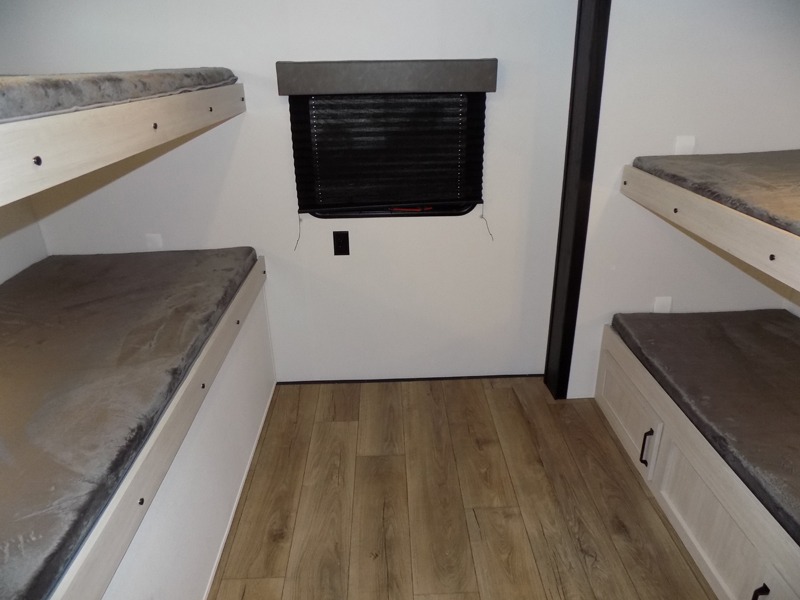 If you're looking for more space, this double axle, double slide out unit is perfect for your group of eight. Within the large slide in the living room, you'll find the booth dinette and sofa, which sit across from the optional TV if you want to enjoy movie nights. The full kitchen includes a stainless microwave and three burner cooktop to make meals, plus a pantry and 12V refrigerator for food storage. And an optional outside kitchen with a griddle can be added if you enjoy cooking outdoors! Your guests or littles are sure to enjoy the rear private bunkhouse that features a set of 38" x 76" bunks across from the third bunk and jiffy sofa within a slide out!