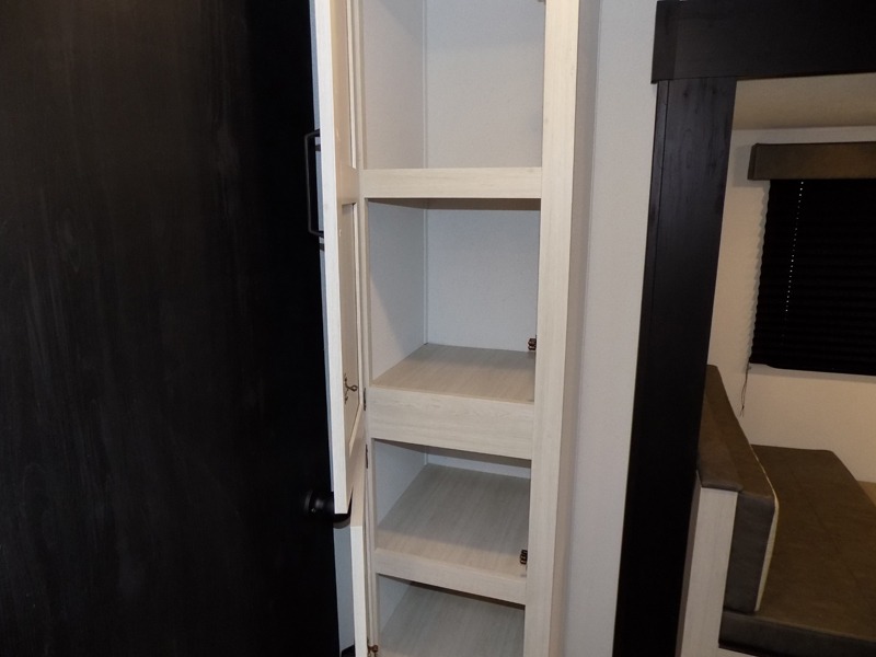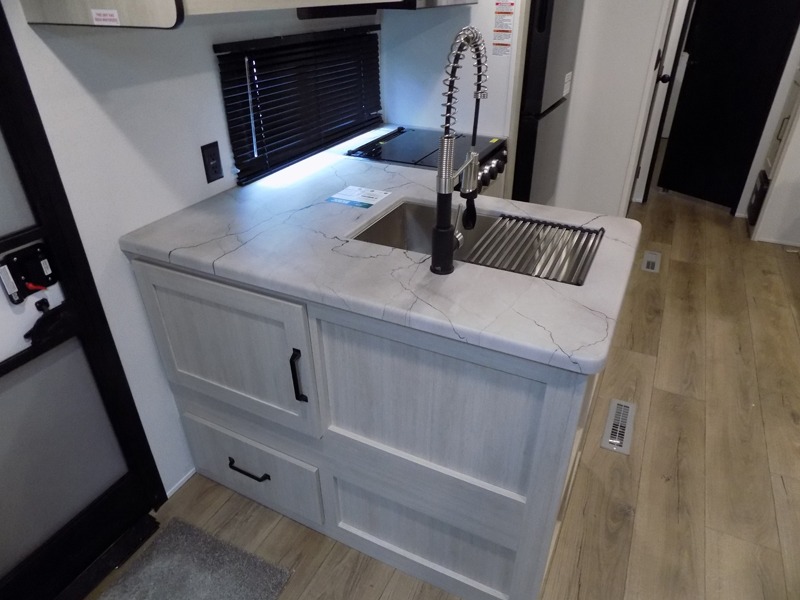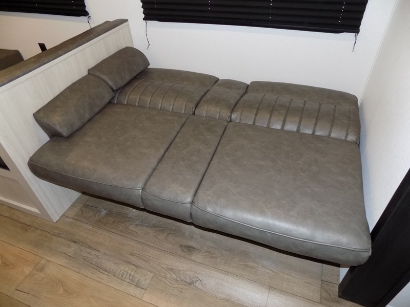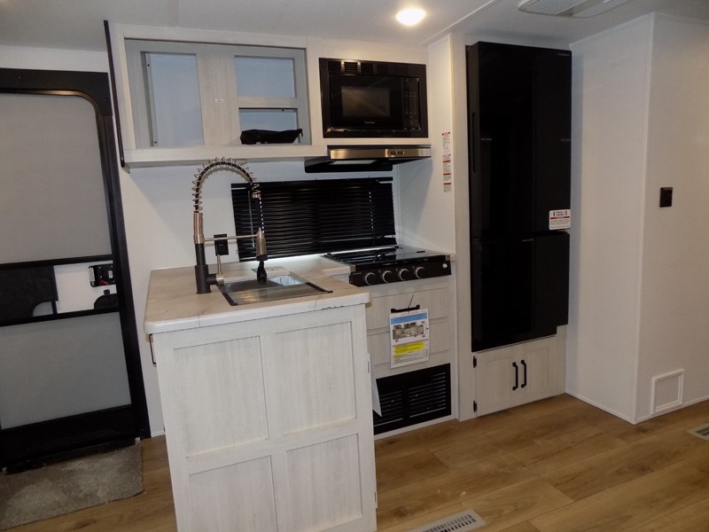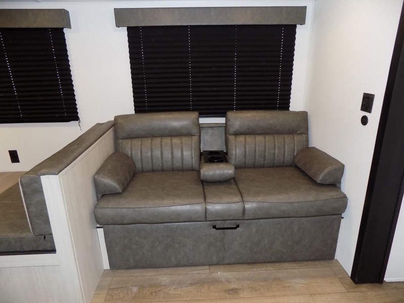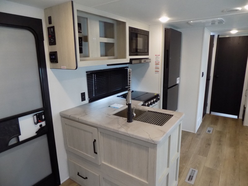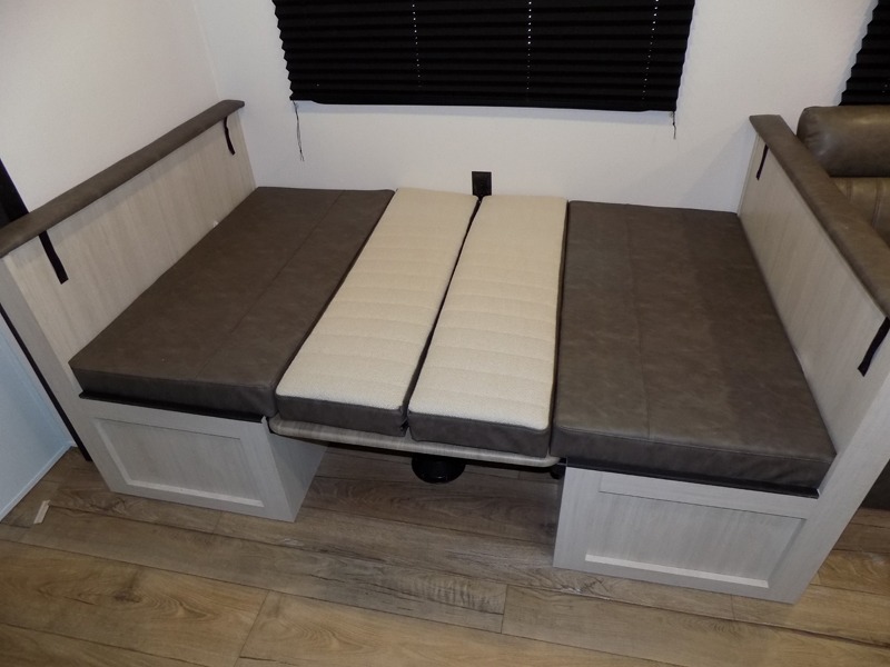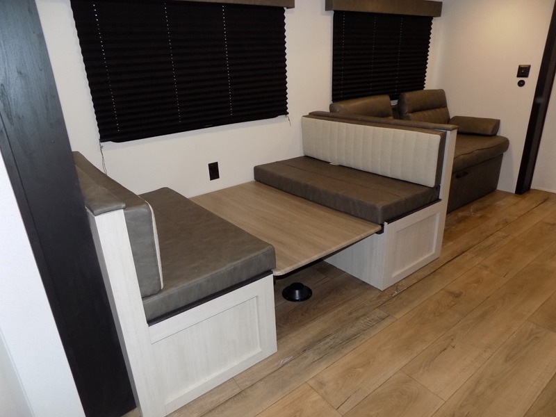 If you're looking for more space, this double axle, double slide out unit is perfect for your group of eight. Within the large slide in the living room, you'll find the booth dinette and sofa, which sit across from the optional TV if you want to enjoy movie nights. The full kitchen includes a stainless microwave and three burner cooktop to make meals, plus a pantry and 12V refrigerator for food storage. And an optional outside kitchen with a griddle can be added if you enjoy cooking outdoors! Your guests or littles are sure to enjoy the rear private bunkhouse that features a set of 38" x 76" bunks across from the third bunk and jiffy sofa within a slide out!