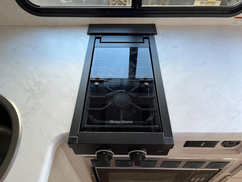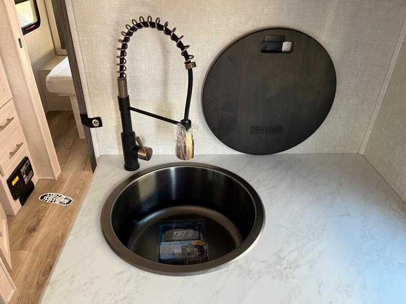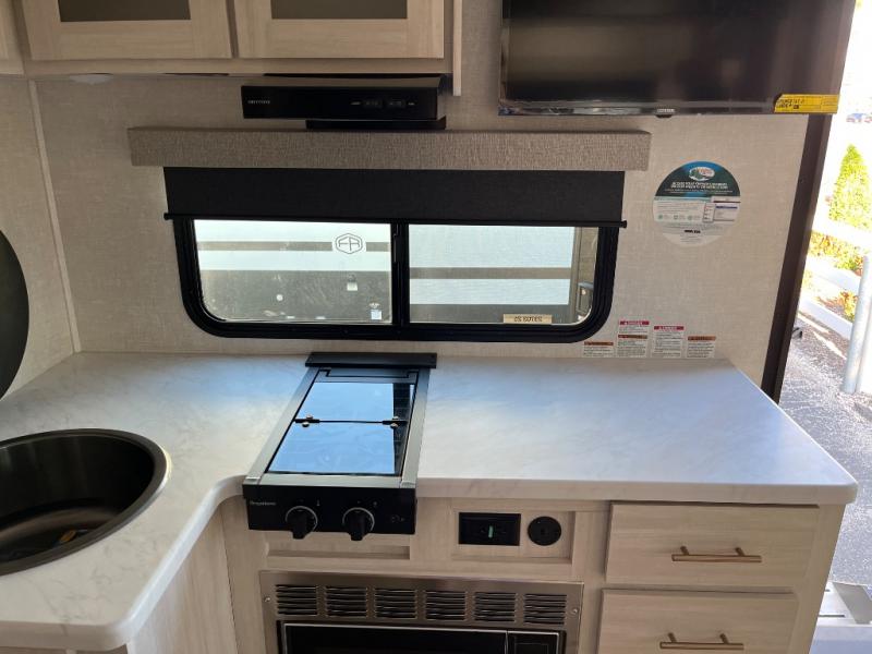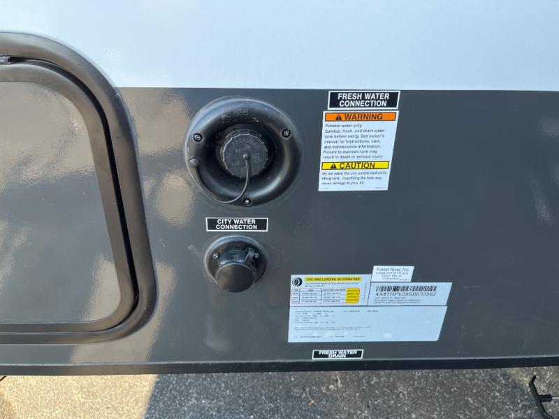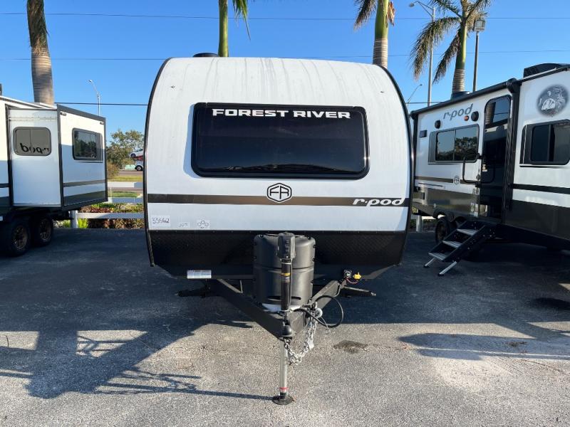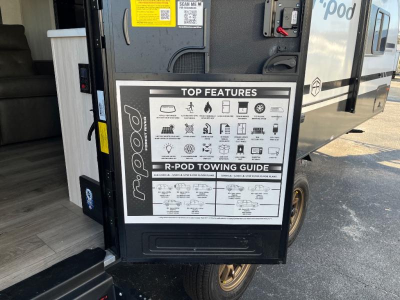 With any R-Pod travel trailer by Forest River, you will enjoy affordable luxury at the lowest tow weight in its class! There is a sealed underbelly with forced heat, a curved dual-pane acrylic front window with a bug screen and night shade, plus a large roof mounted solar panel for off-grid capabilities. The 15K A/C unit will keep you comfortable during the summer camping months, and the tankless water heater will provide endless hot showers after hiking, biking, swimming and more! Each model also includes a black glass friction hinge entrance door, roof ladder prep, exterior motion lighting, plus a hot and cold exterior spray port to wash off sand from the beach. Inside, you'll enjoy seamless Surf-X kitchen countertops, blackout roller shades, and a central vacuum system for hassle-free cleaning!