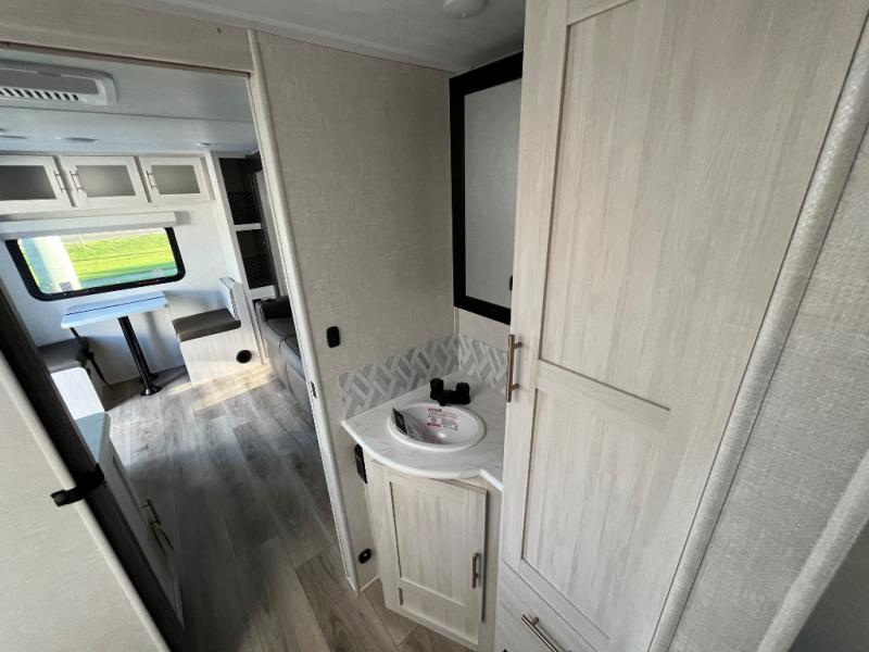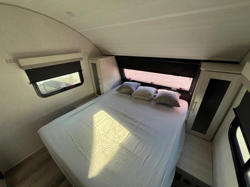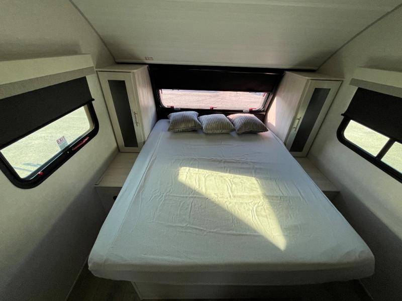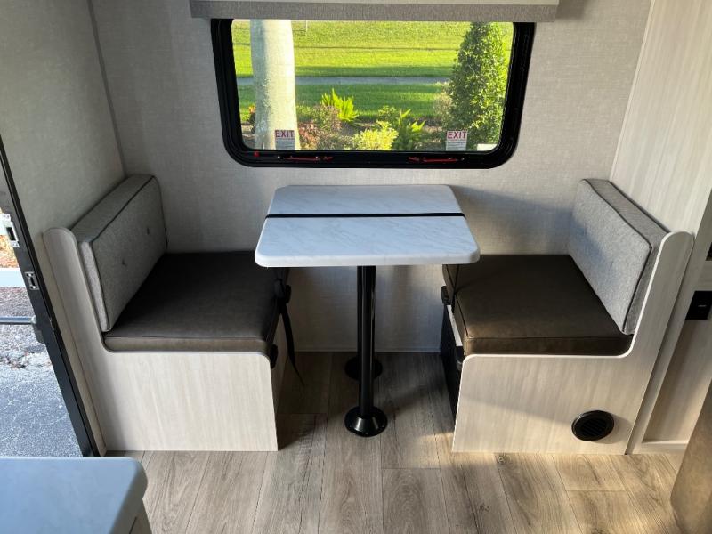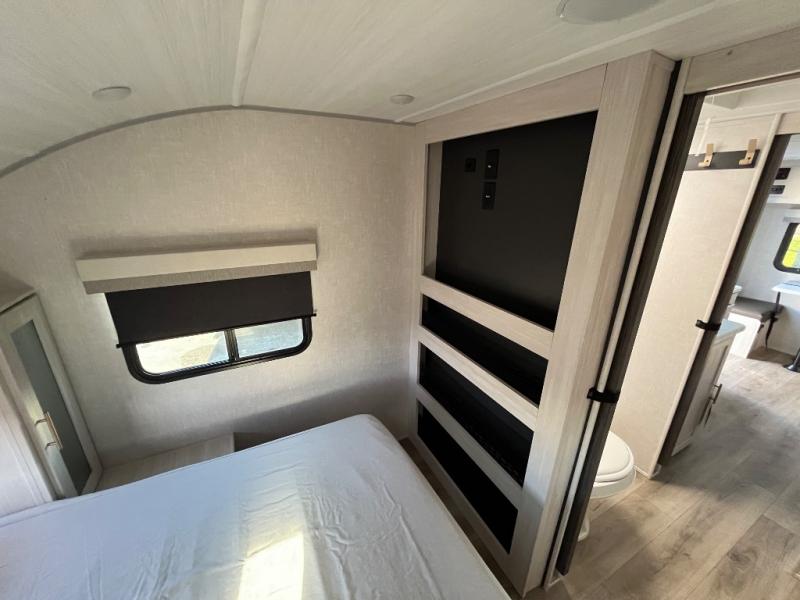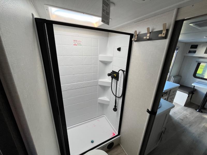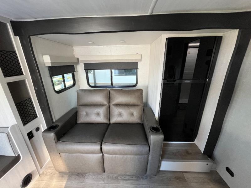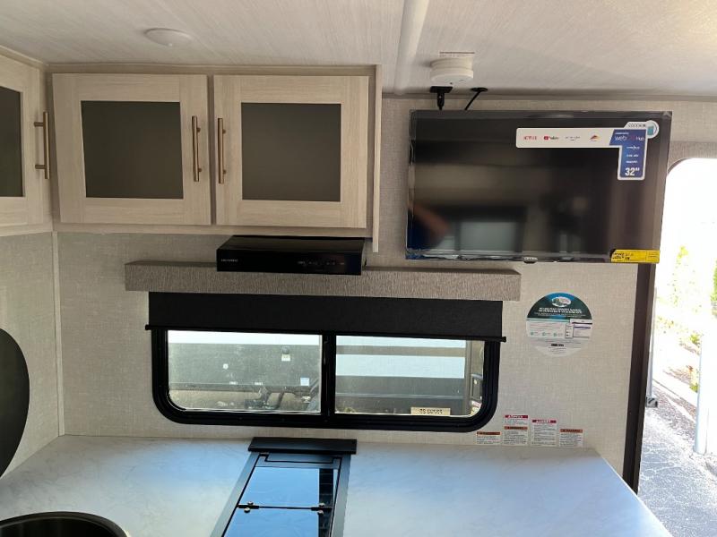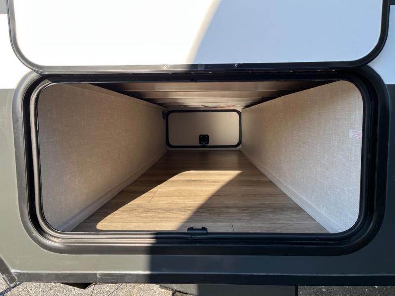 Whether you spend your days at the lake or in the woods, you'll be met with comfort in this spacious travel trailer. There is a rear dinette where you can enjoy your meals together, a 56" theater seat across from a 12V TV, and a slide out for added space. The walk-through bath includes a night light for easy nighttime use, and the front master bedroom includes a queen bed just like at home. There are also dual wardrobes and end tables plus an entertainment center if you want to add a TV. Outside, you'll find a rear accessory hitch, upgraded tires with TPMS, a 14' awning, and a slam latch cargo doors to keep your gear secure.