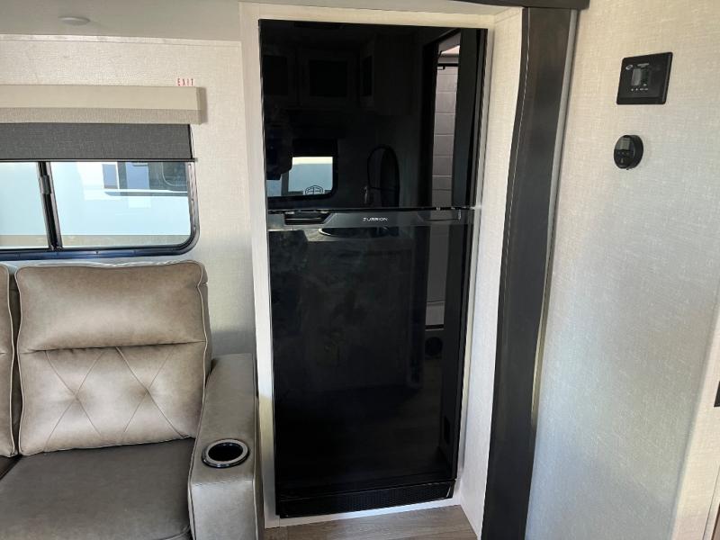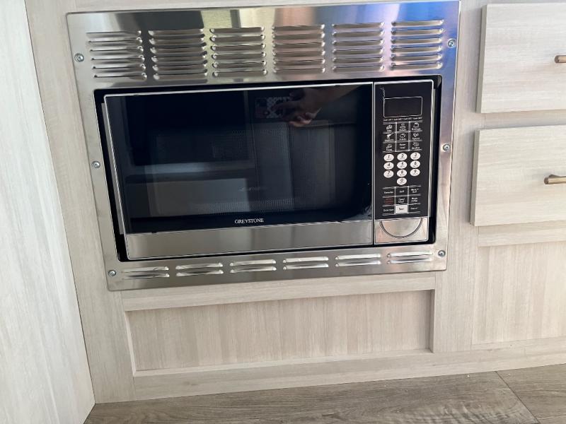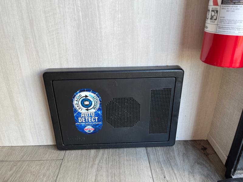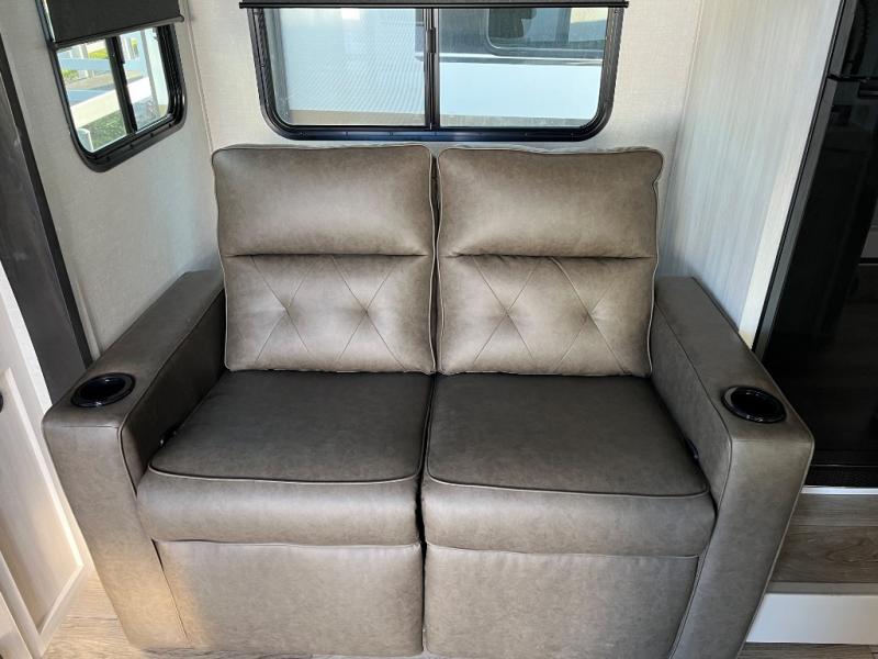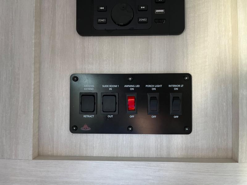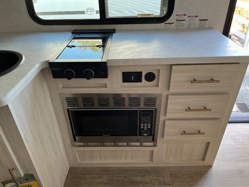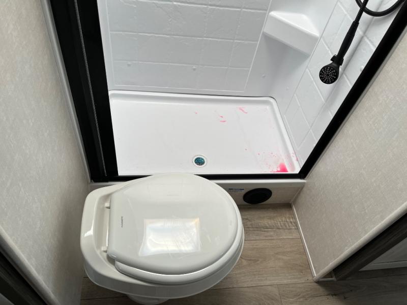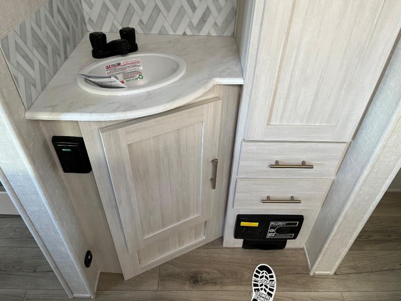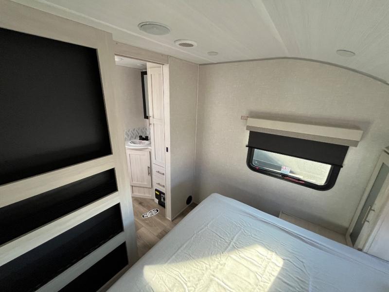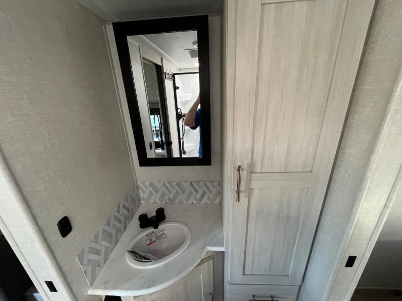 Whether you spend your days at the lake or in the woods, you'll be met with comfort in this spacious travel trailer. There is a rear dinette where you can enjoy your meals together, a 56" theater seat across from a 12V TV, and a slide out for added space. The walk-through bath includes a night light for easy nighttime use, and the front master bedroom includes a queen bed just like at home. There are also dual wardrobes and end tables plus an entertainment center if you want to add a TV. Outside, you'll find a rear accessory hitch, upgraded tires with TPMS, a 14' awning, and a slam latch cargo doors to keep your gear secure.