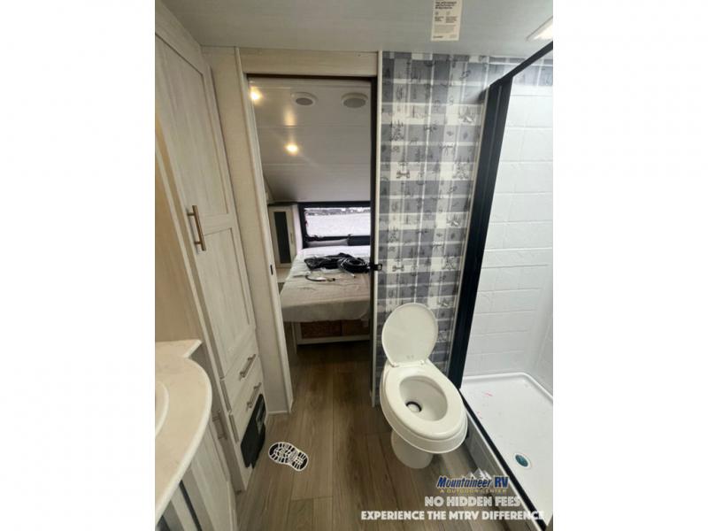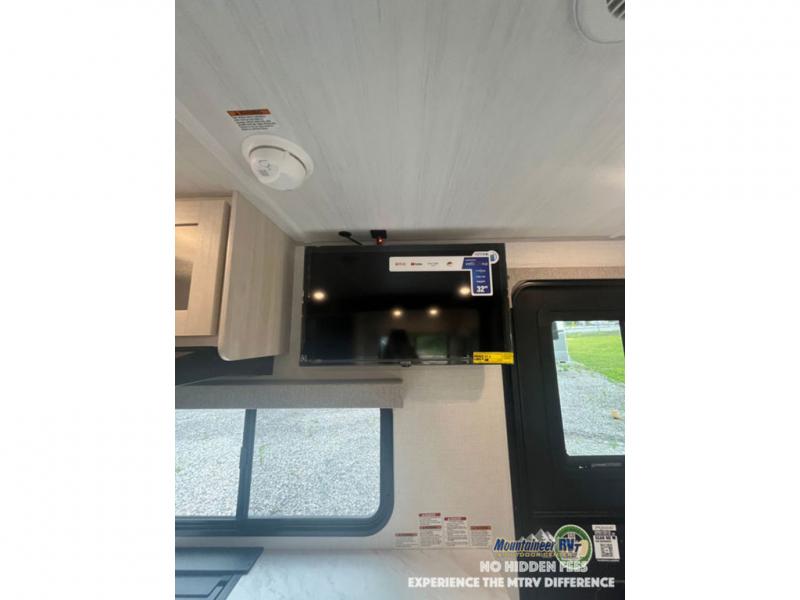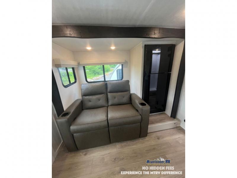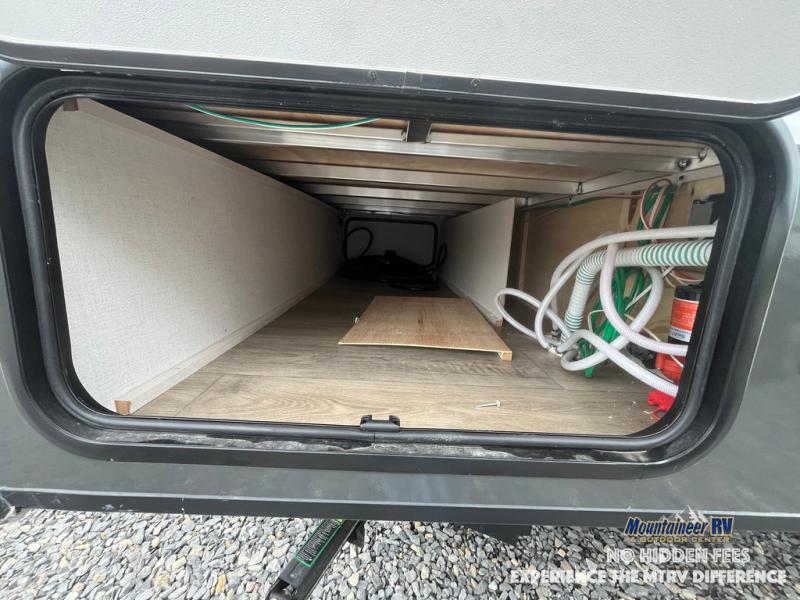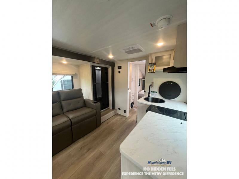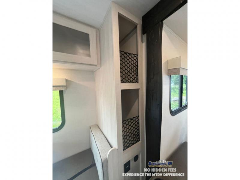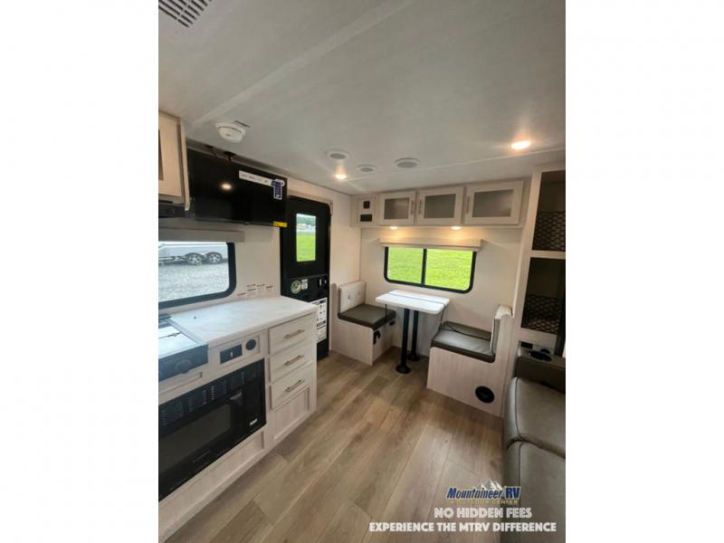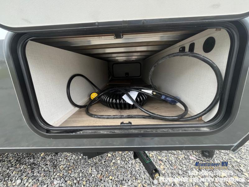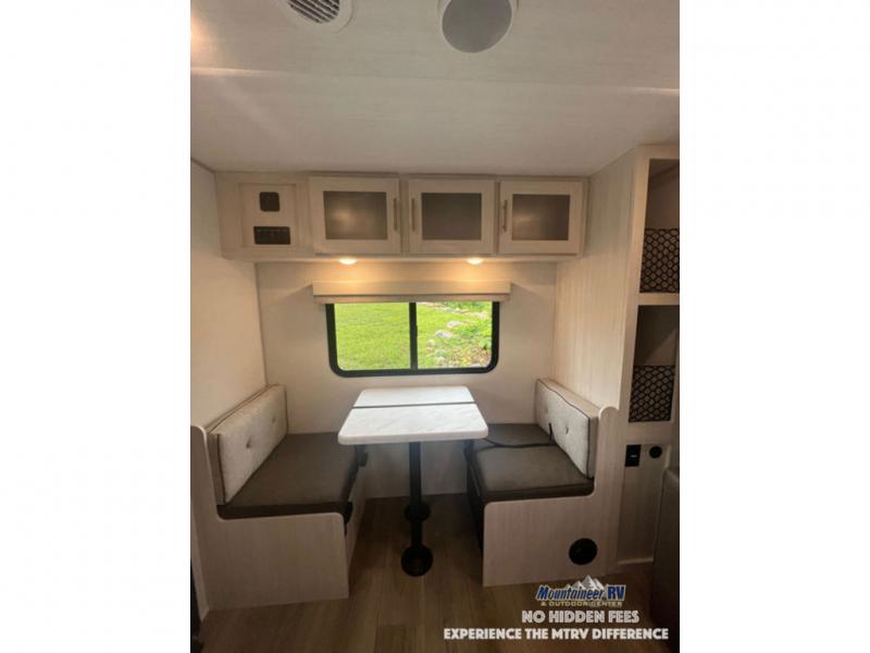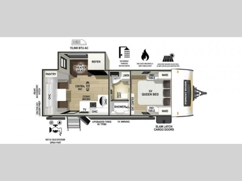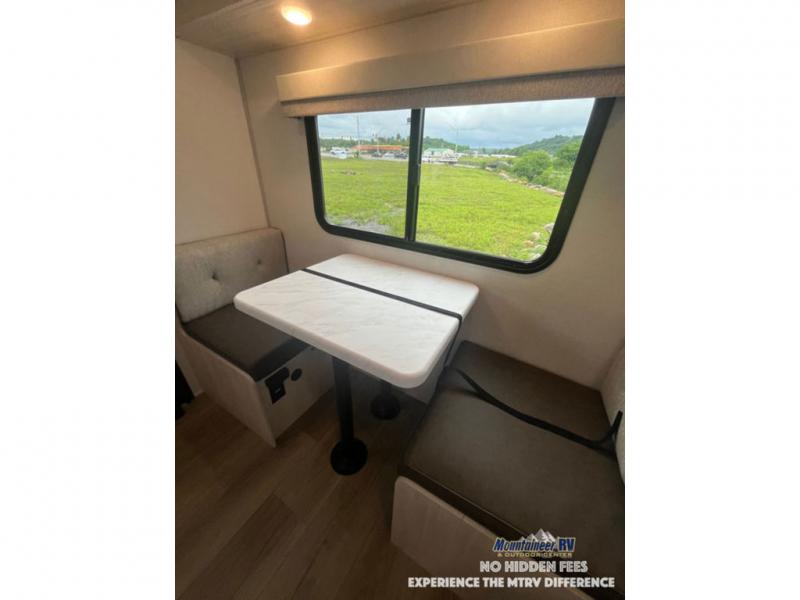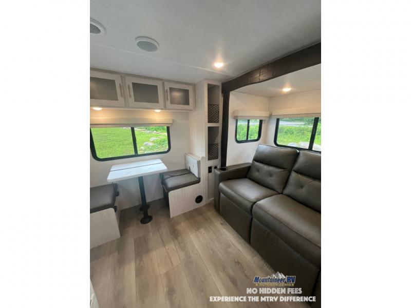 Whether you spend your days at the lake or in the woods, you'll be met with comfort in this spacious travel trailer. There is a rear dinette where you can enjoy your meals together, a 56" theater seat across from a 12V TV, and a slide out for added space. The walk-through bath includes a night light for easy nighttime use, and the front master bedroom includes a queen bed just like at home. There are also dual wardrobes and end tables plus an entertainment center if you want to add a TV. Outside, you'll find a rear accessory hitch, upgraded tires with TPMS, a 14' awning, and a slam latch cargo doors to keep your gear secure.