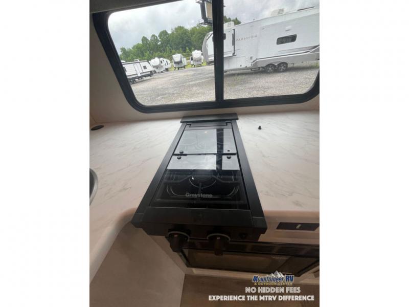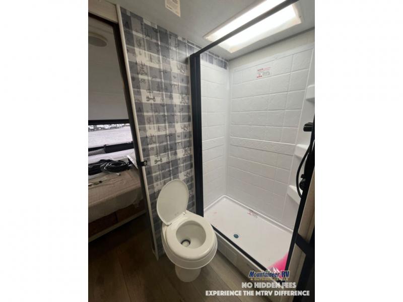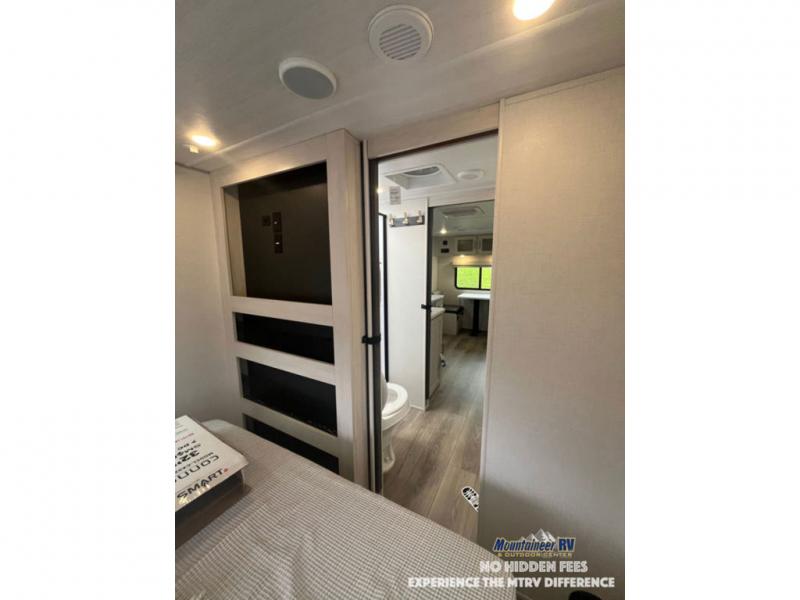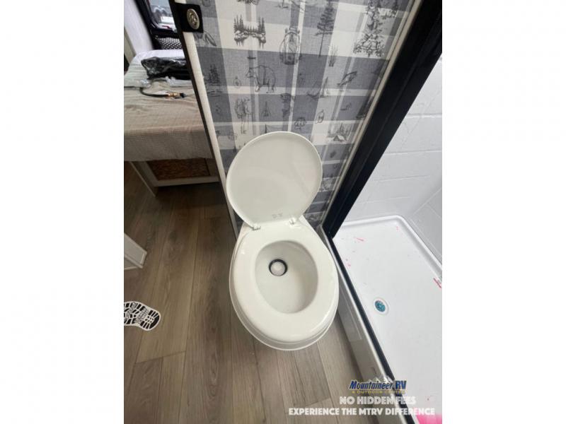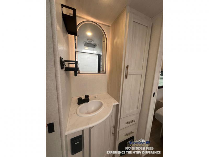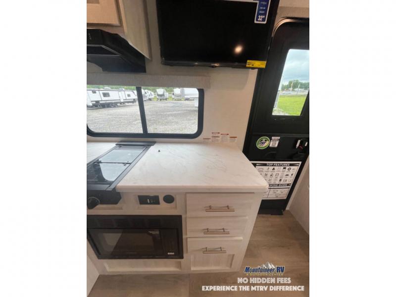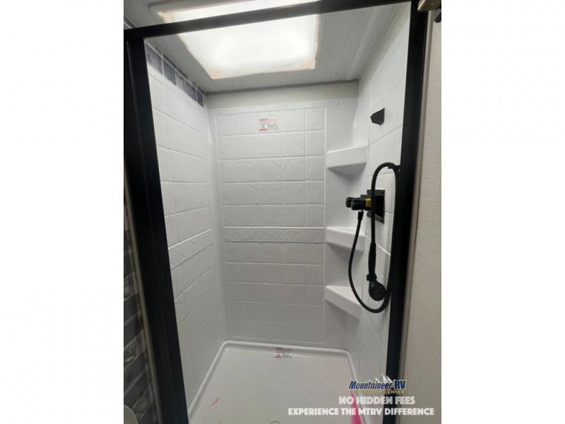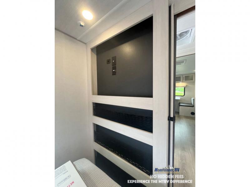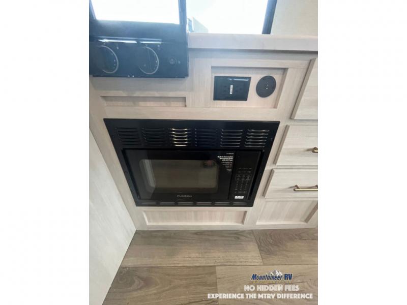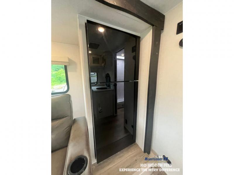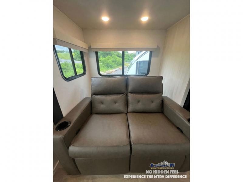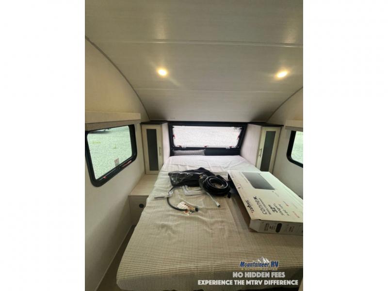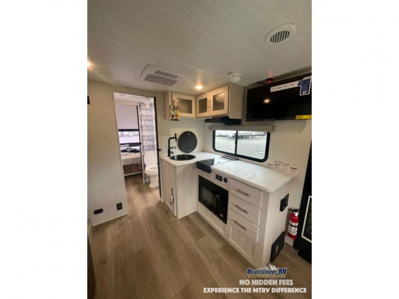 Whether you spend your days at the lake or in the woods, you'll be met with comfort in this spacious travel trailer. There is a rear dinette where you can enjoy your meals together, a 56" theater seat across from a 12V TV, and a slide out for added space. The walk-through bath includes a night light for easy nighttime use, and the front master bedroom includes a queen bed just like at home. There are also dual wardrobes and end tables plus an entertainment center if you want to add a TV. Outside, you'll find a rear accessory hitch, upgraded tires with TPMS, a 14' awning, and a slam latch cargo doors to keep your gear secure.