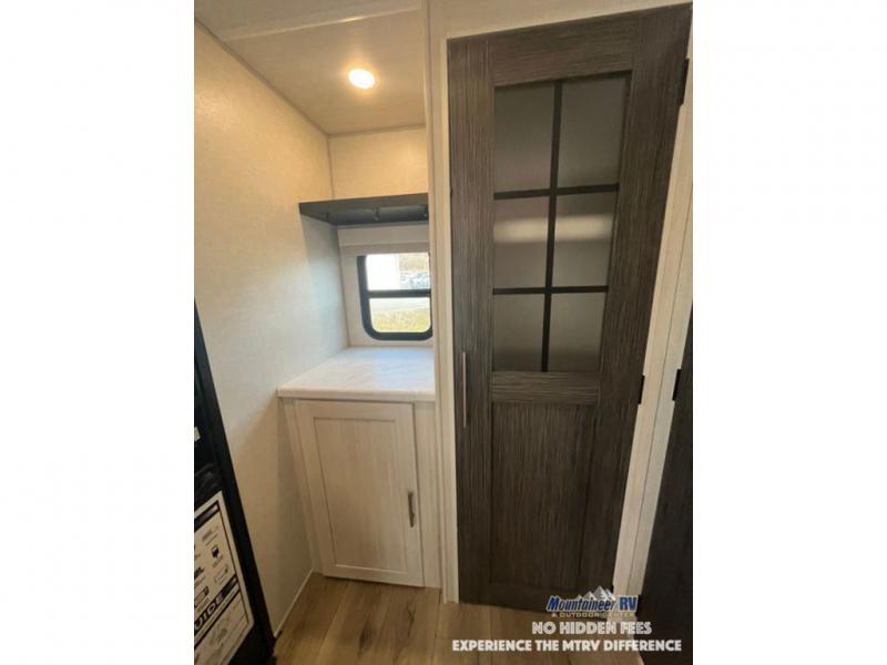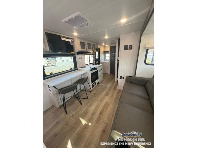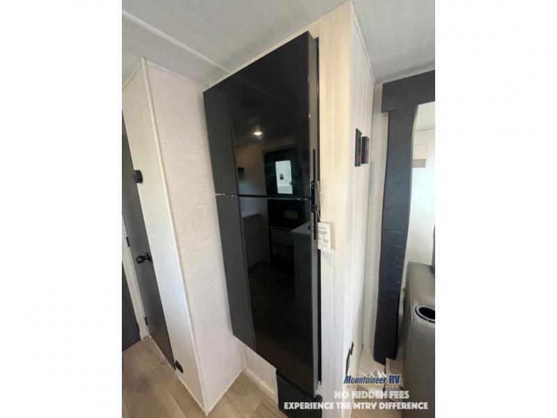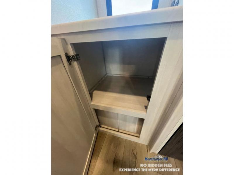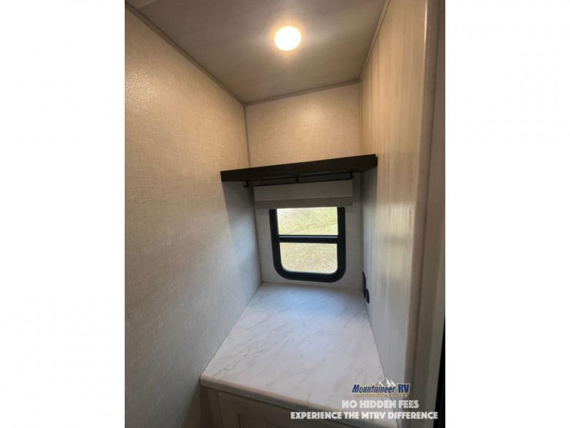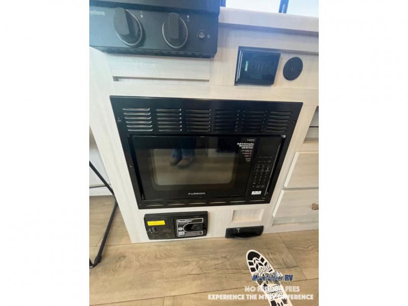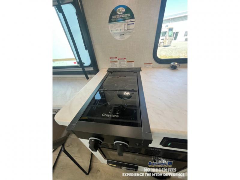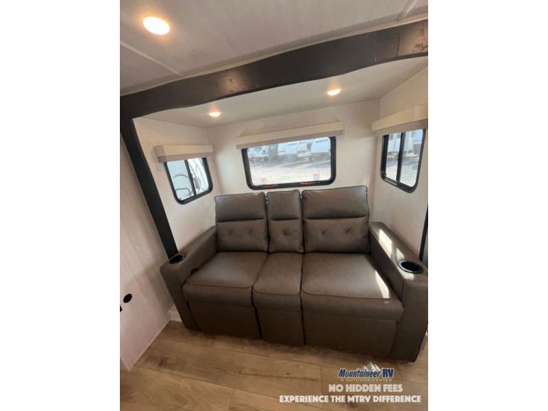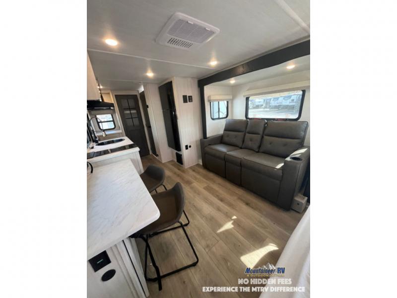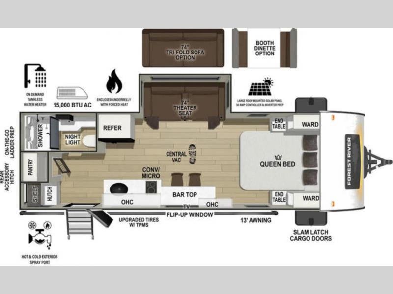 A front bedroom with a walk-around queen bed, a full bath, and a theater seat slide out are a few of the features that you are sure to want in your next RV! You can rest comfortably each night, plus all your clothing can be stored in the dual wardrobes to keep everything tidy. If you're needing more sleeping space, just choose the optional tri-fold sofa or optional booth dinette in place of the theater seat! The chef of your group can make meals on the two burner cooktop or in the convection microwave, and there is a 12V black glass refrigerator for perishables. And the bar top with two seats and the flip-up window provide a great view outdoors as you dine together.