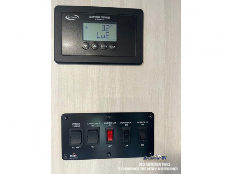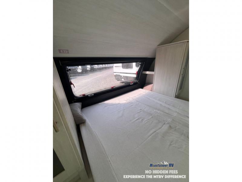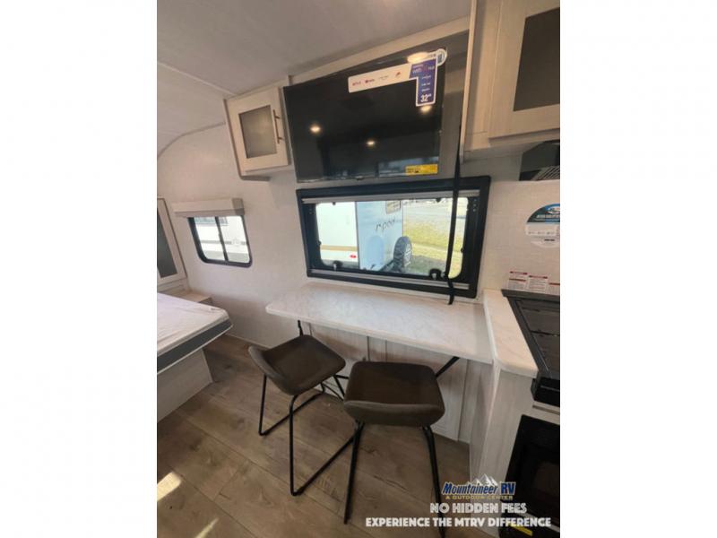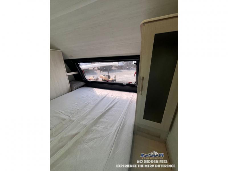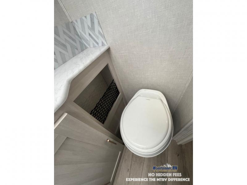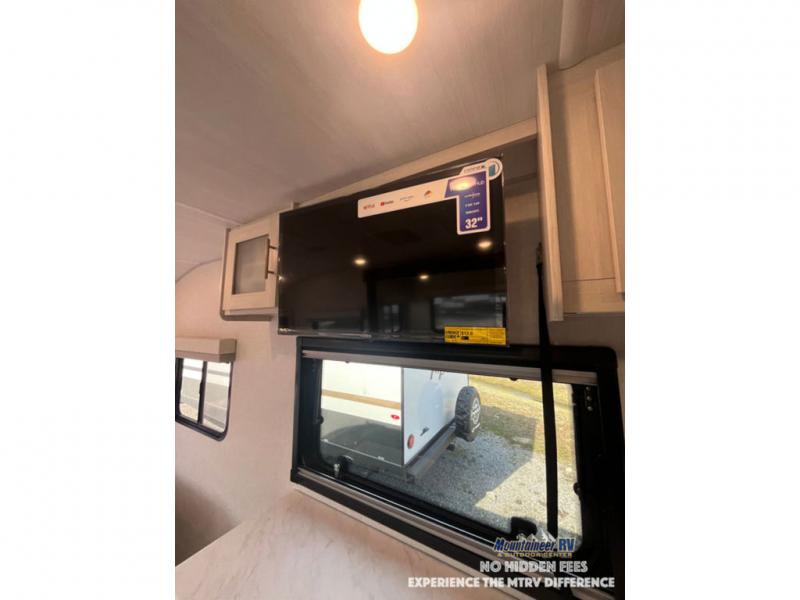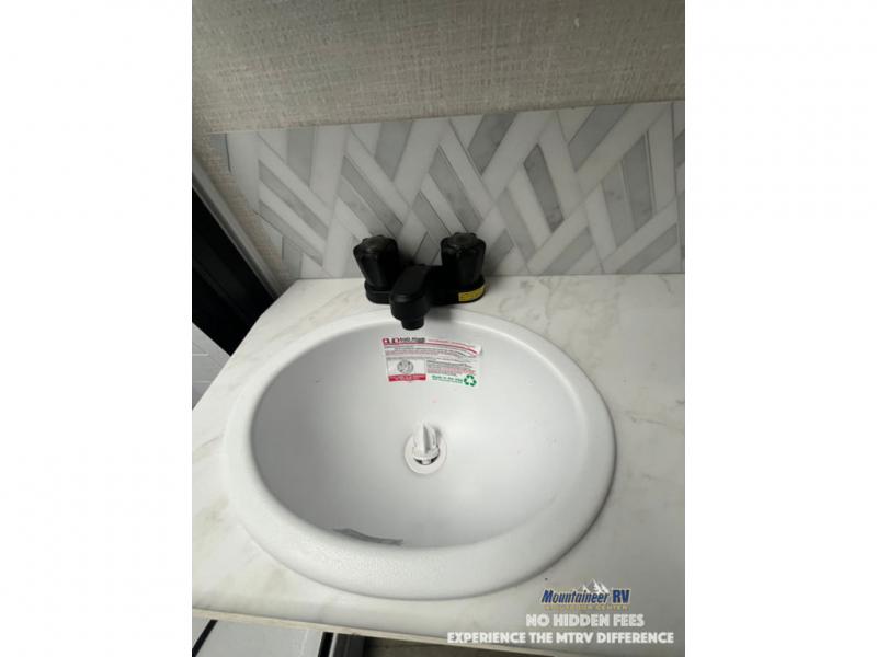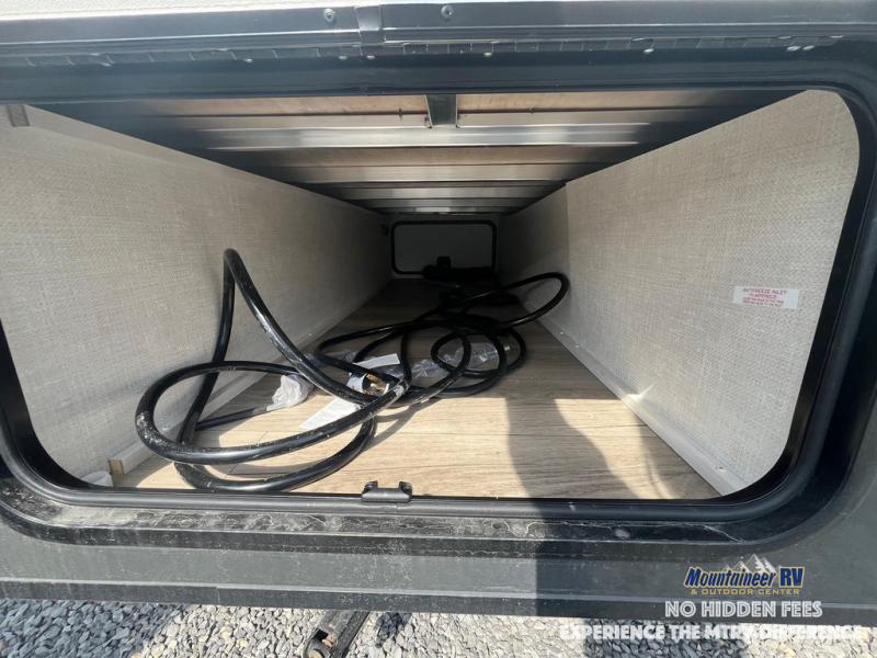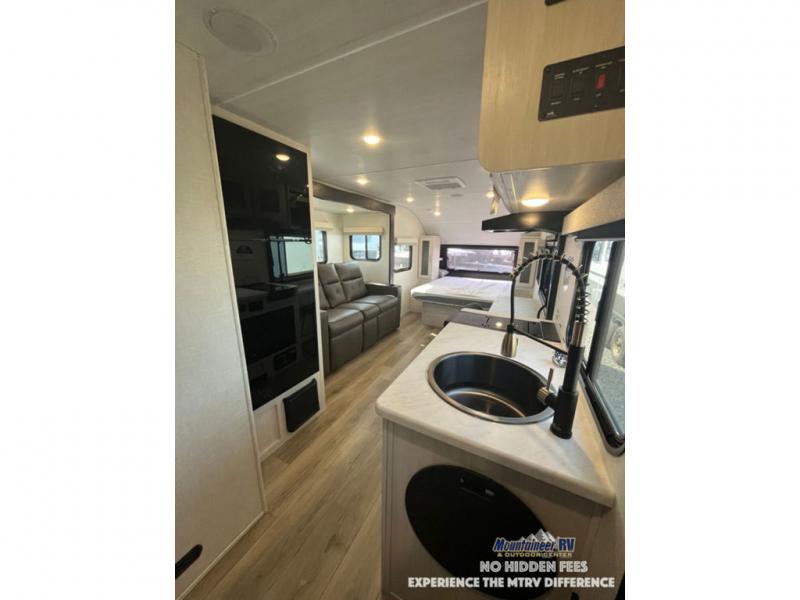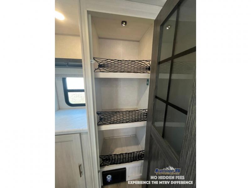 A front bedroom with a walk-around queen bed, a full bath, and a theater seat slide out are a few of the features that you are sure to want in your next RV! You can rest comfortably each night, plus all your clothing can be stored in the dual wardrobes to keep everything tidy. If you're needing more sleeping space, just choose the optional tri-fold sofa or optional booth dinette in place of the theater seat! The chef of your group can make meals on the two burner cooktop or in the convection microwave, and there is a 12V black glass refrigerator for perishables. And the bar top with two seats and the flip-up window provide a great view outdoors as you dine together.