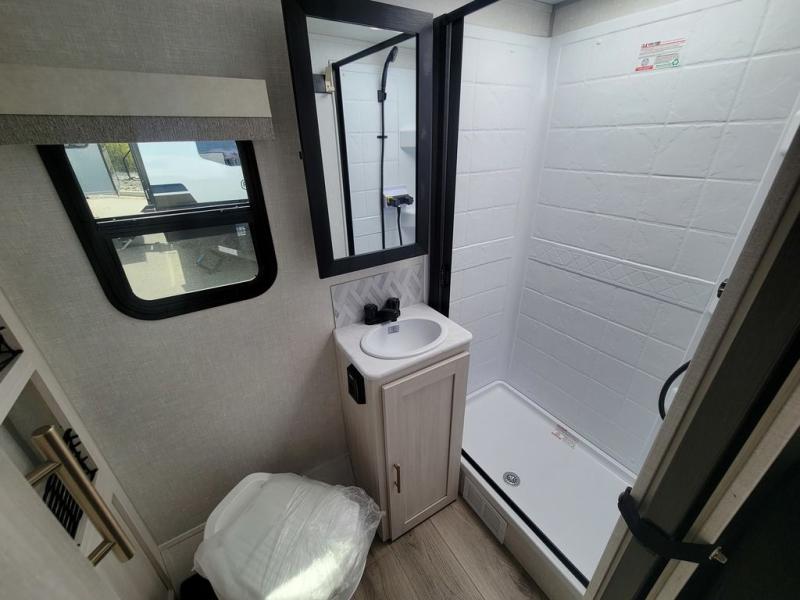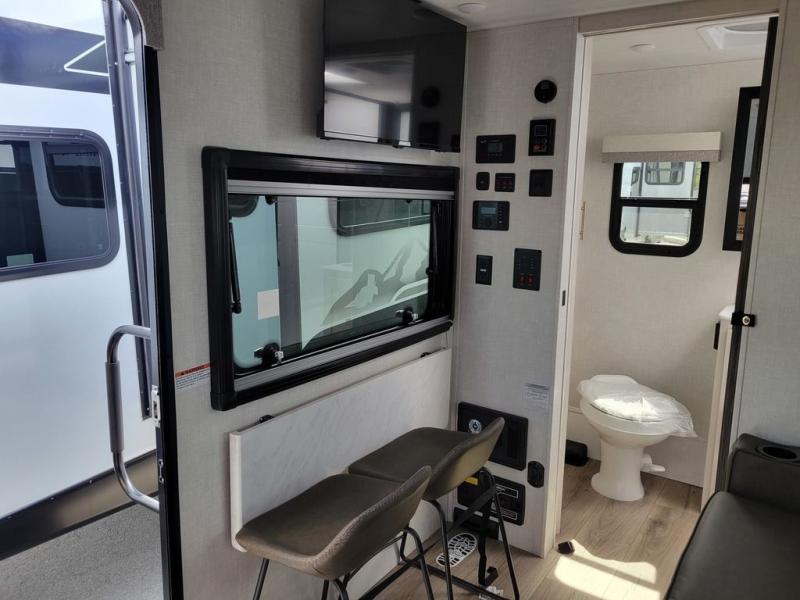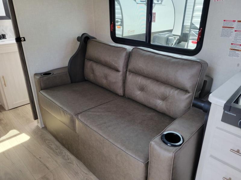 You'll love camping in this compact, yet cozy travel trailer. The full rear bath features a bath night light, a shower, toilet, sink, and linen closet to keep towels close by. You can cook meals in the front kitchen with ample counter space, a cooktop, and a convection microwave. The flip-up bar with two seats provides a place to dine together, and there is a flip-up window here for a great view outdoors. And a 64" tri-fold sofa will double as your seating and sleeping space!