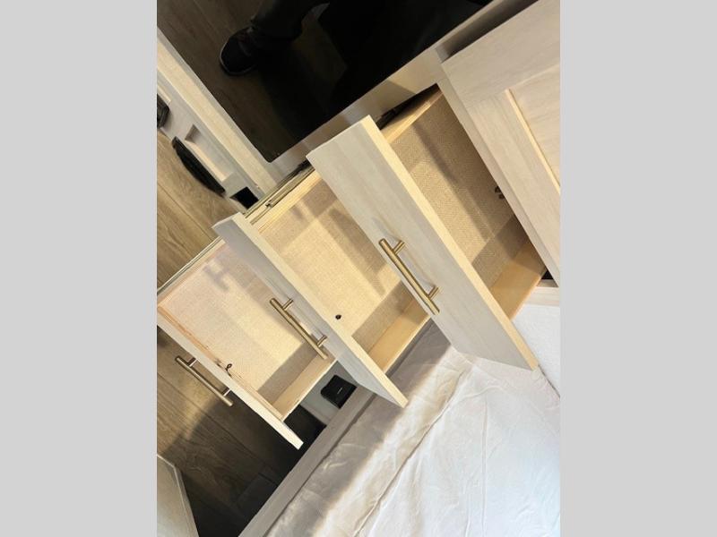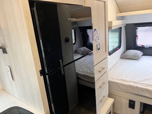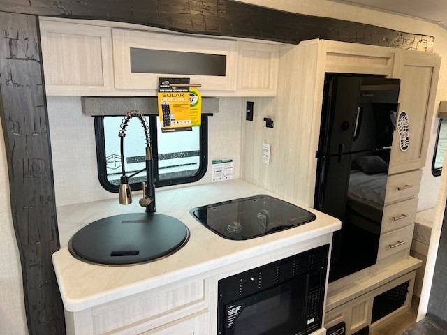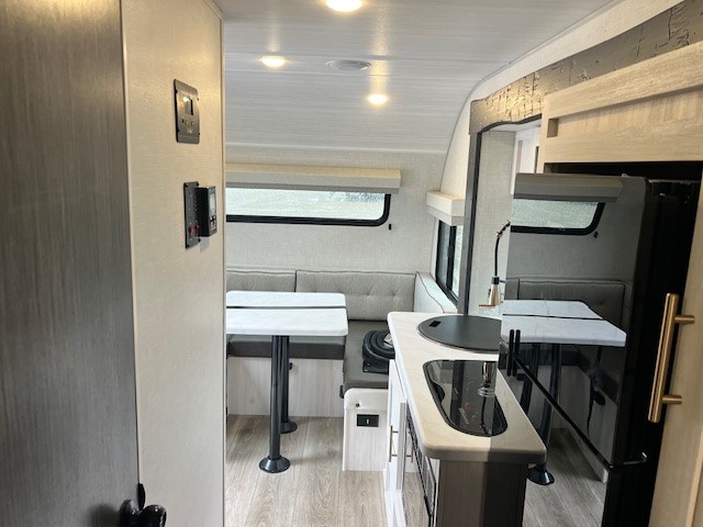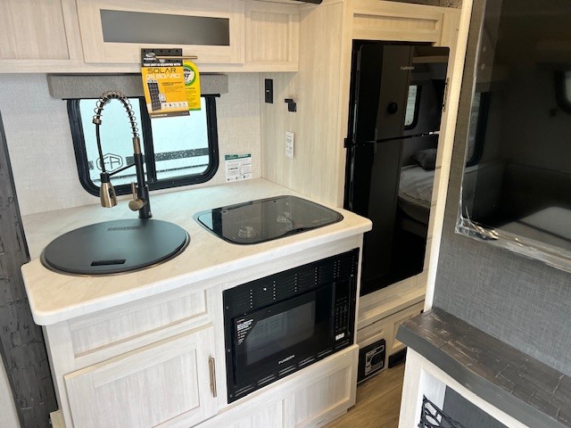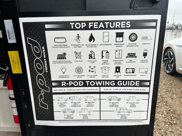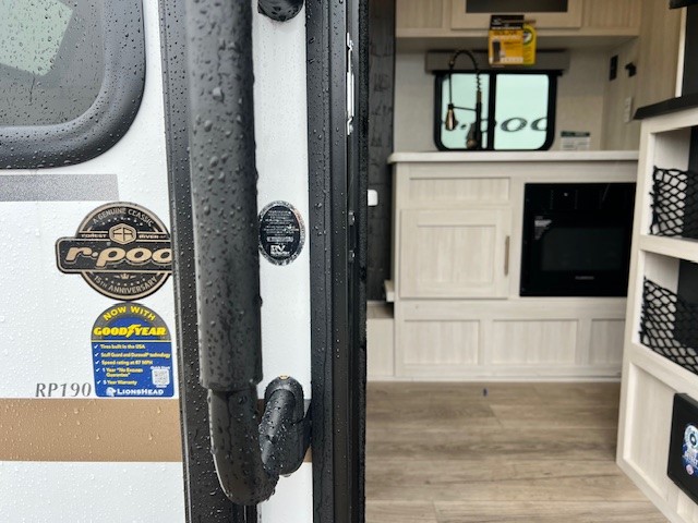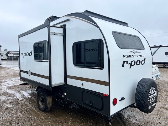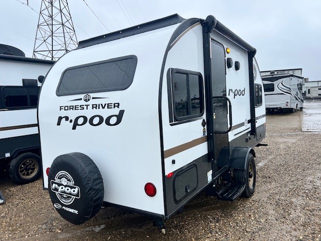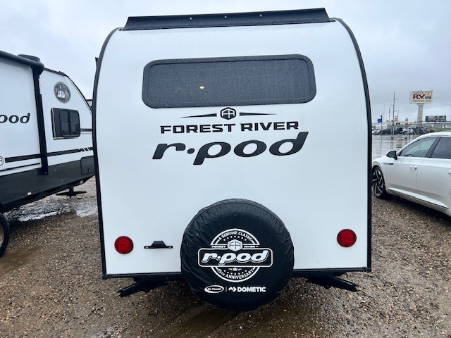 With any R-Pod travel trailer by Forest River, you will enjoy affordable luxury at the lowest tow weight in its class! There is a sealed underbelly with forced heat, a curved dual-pane acrylic front window with a bug screen and night shade, plus a large roof mounted solar panel for off-grid capabilities. The 15K A/C unit will keep you comfortable during the summer camping months, and the tankless water heater will provide endless hot showers after hiking, biking, swimming and more! Each model also includes a black glass friction hinge entrance door, roof ladder prep, exterior motion lighting, plus a hot and cold exterior spray port to wash off sand from the beach. Inside, you'll enjoy seamless Surf-X kitchen countertops, blackout roller shades, and a central vacuum system for hassle-free cleaning!