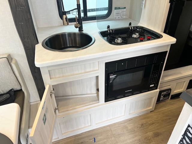 For the couple who is ready to camp anytime and anywhere, you will love how easy it is to travel with this travel trailer. You can easily set up the single slide to give you more room to move about. Within this slide, you will find the kitchen amenities, which include a two-burner cooktop, convection microwave and a 12V black glass refrigerator. You can enjoy your meals at the U-shaped dinette, and this furniture can double as a sleeping space, if needed. Along the front is a queen bed where you can rest up for another day of fun and adventure. With all of the exterior storage, you can bring along all of your necessary camping items and more!