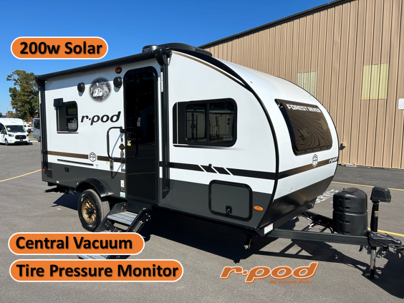 With any R-Pod travel trailer by Forest River, you will enjoy affordable luxury at the lowest tow weight in its class! There is a sealed underbelly with forced heat, a curved dual-pane acrylic front window with a bug screen and night shade, plus a large roof mounted solar panel for off-grid capabilities. The 15K A/C unit will keep you comfortable during the summer camping months, and the tankless water heater will provide endless hot showers after hiking, biking, swimming and more! Each model also includes a black glass friction hinge entrance door, roof ladder prep, exterior motion lighting, plus a hot and cold exterior spray port to wash off sand from the beach. Inside, you'll enjoy seamless Surf-X kitchen countertops, blackout roller shades, and a central vacuum system for hassle-free cleaning!