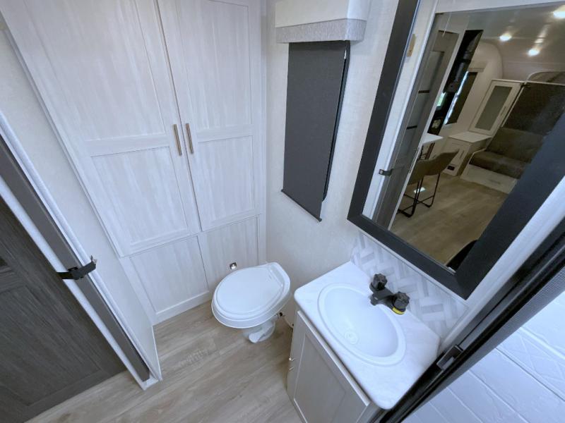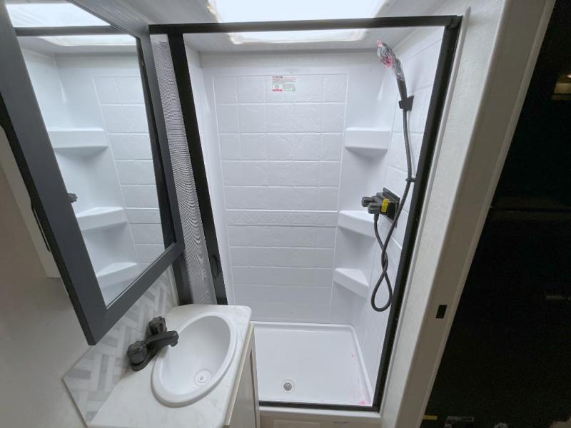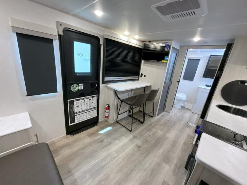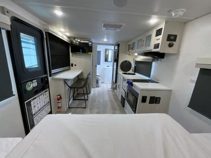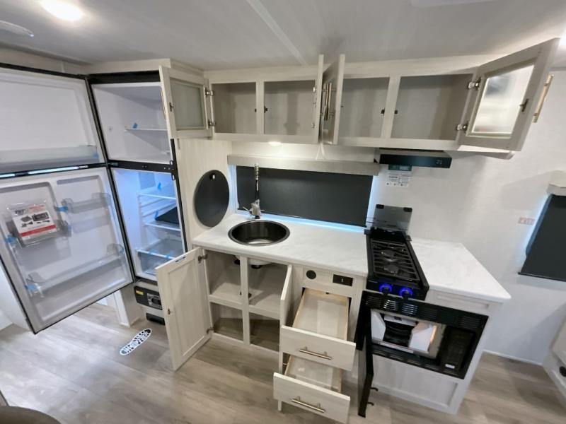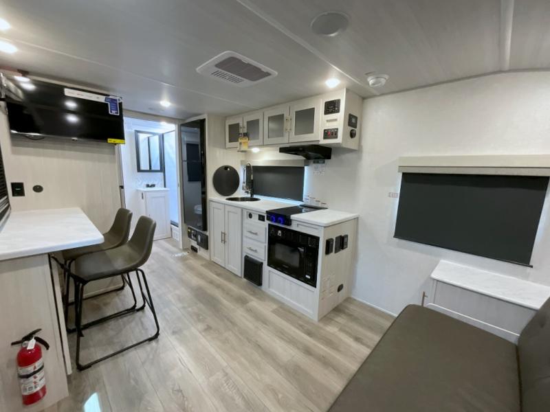 This versatile travel trailer is perfect for two adventure-seeking campers! You will love having a queen-size Murphy bed up front since you can fold it away during the day and relax on the sofa. There are also dual wardrobes to keep your clothes out of the way plus dual end end tables to set your coffee or book on. A full kitchen includes a convection microwave, 12V black glass refrigerator, and a counter with two chairs where you can dine each day. You will also love the flip-up window above the table, along with a 12V TV to keep you entertained, plus a pantry to keep food stocked. Head to the full rear bath that includes a large linen closet, a shower, and a night light for added convenience. The exterior is just as accommodating with its large roof mounted solar panel, rear accessory hitch, slam latch cargo doors, and more. This model also includes the Hood River Edition that comes with Mud Legend all terrain tires with TPMS, a MaxxAir vent cover, and 12V tank heaters!