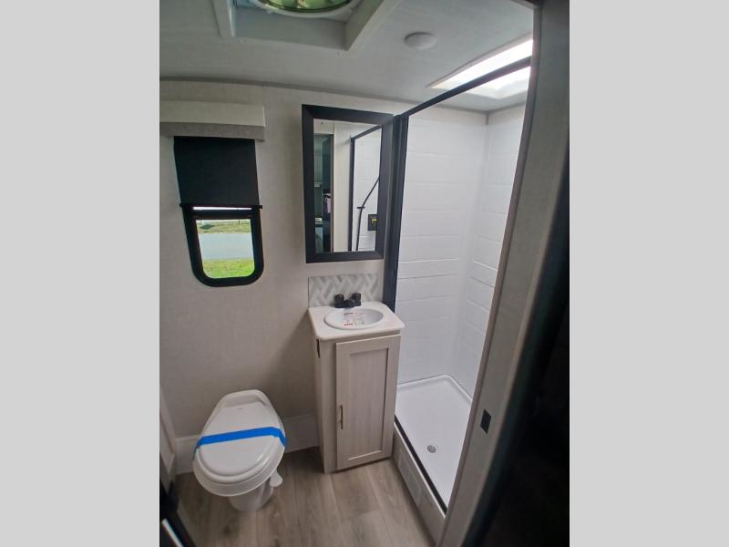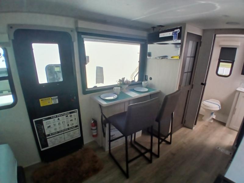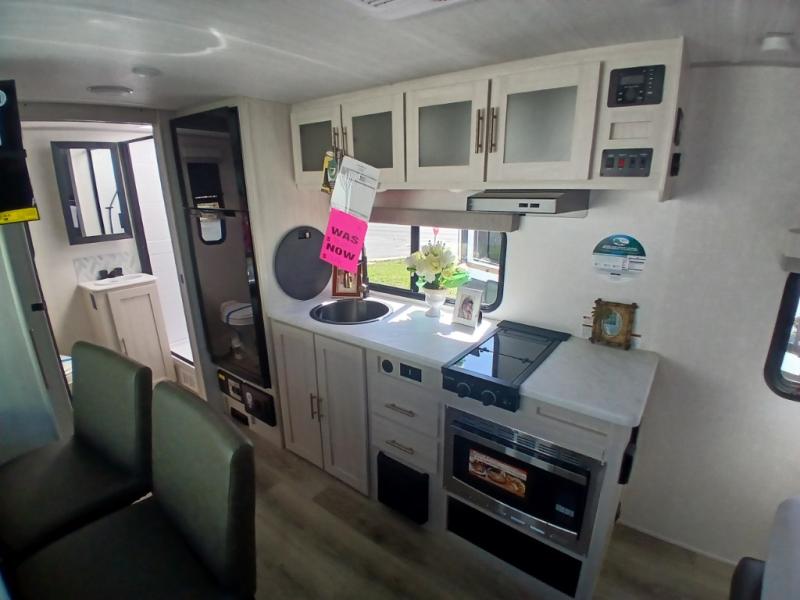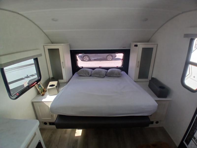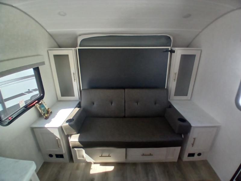 This versatile travel trailer is perfect for two adventure-seeking campers! You will love having a queen-size Murphy bed up front since you can fold it away during the day and relax on the sofa. There are also dual wardrobes to keep your clothes out of the way plus dual end end tables to set your coffee or book on. A full kitchen includes a convection microwave, 12V black glass refrigerator, and a counter with two chairs where you can dine each day. You will also love the flip-up window above the table, along with a 12V TV to keep you entertained, plus a pantry to keep food stocked. Head to the full rear bath that includes a large linen closet, a shower, and a night light for added convenience. The exterior is just as accommodating with its large roof mounted solar panel, rear accessory hitch, slam latch cargo doors, and more!