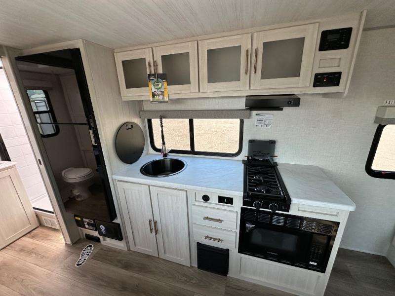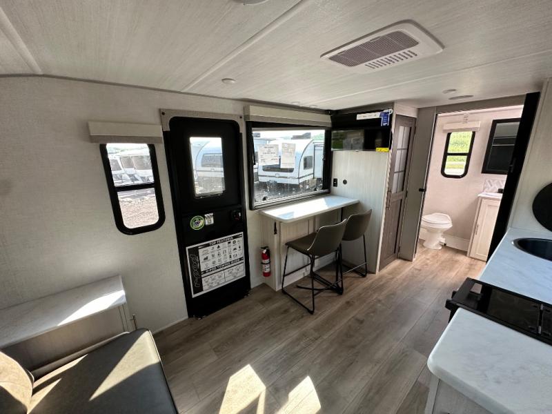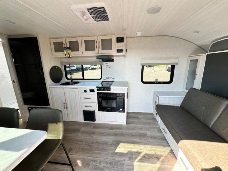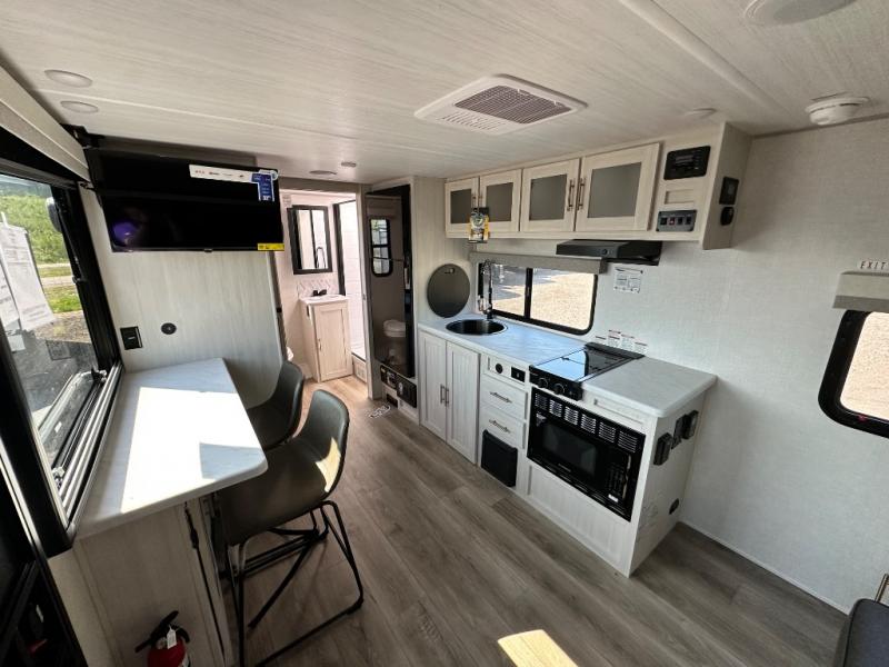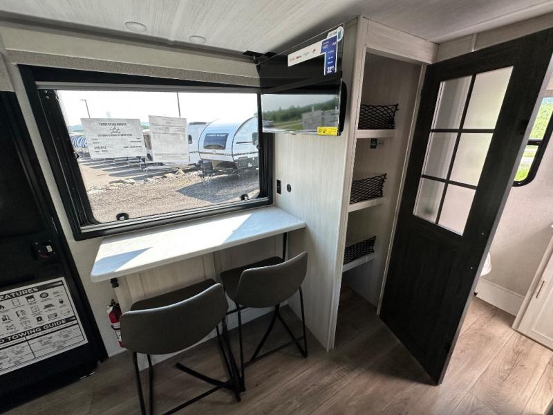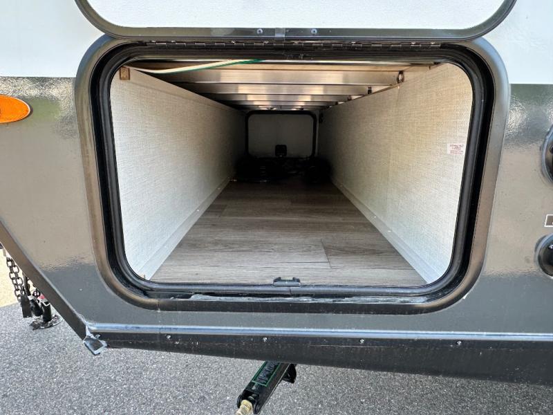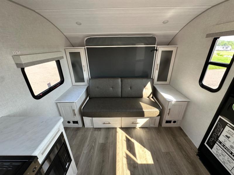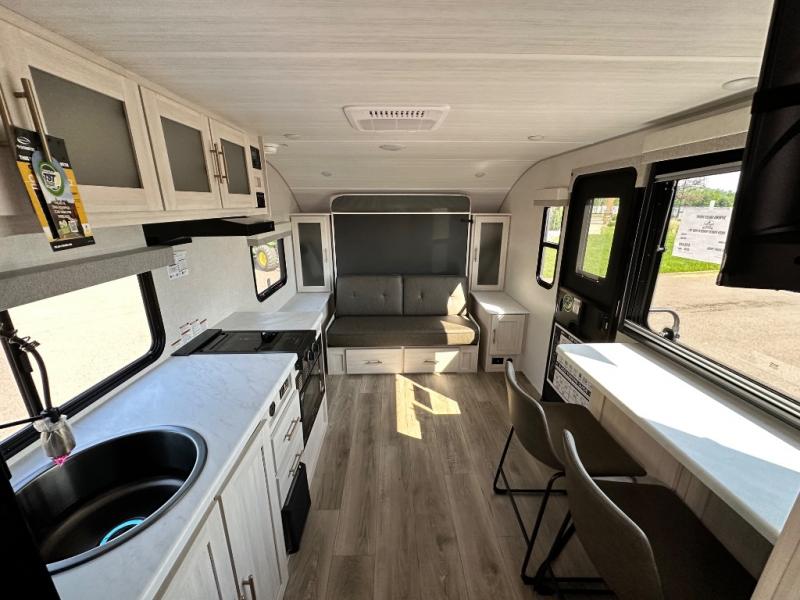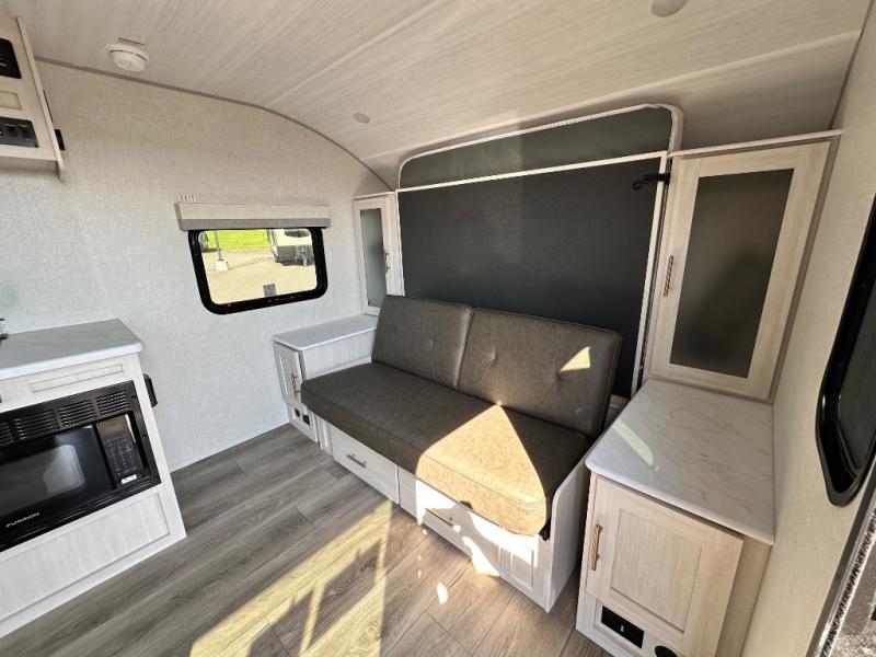 This versatile travel trailer is perfect for two adventure-seeking campers! You will love having a queen-size Murphy bed up front since you can fold it away during the day and relax on the sofa. There are also dual wardrobes to keep your clothes out of the way plus dual end end tables to set your coffee or book on. A full kitchen includes a convection microwave, 12V black glass refrigerator, and a counter with two chairs where you can dine each day. You will also love the flip-up window above the table, along with a 12V TV to keep you entertained, plus a pantry to keep food stocked. Head to the full rear bath that includes a large linen closet, a shower, and a night light for added convenience. The exterior is just as accommodating with its large roof mounted solar panel, rear accessory hitch, slam latch cargo doors, and more!