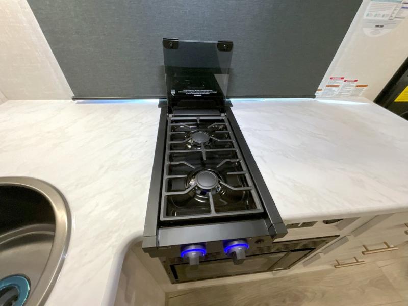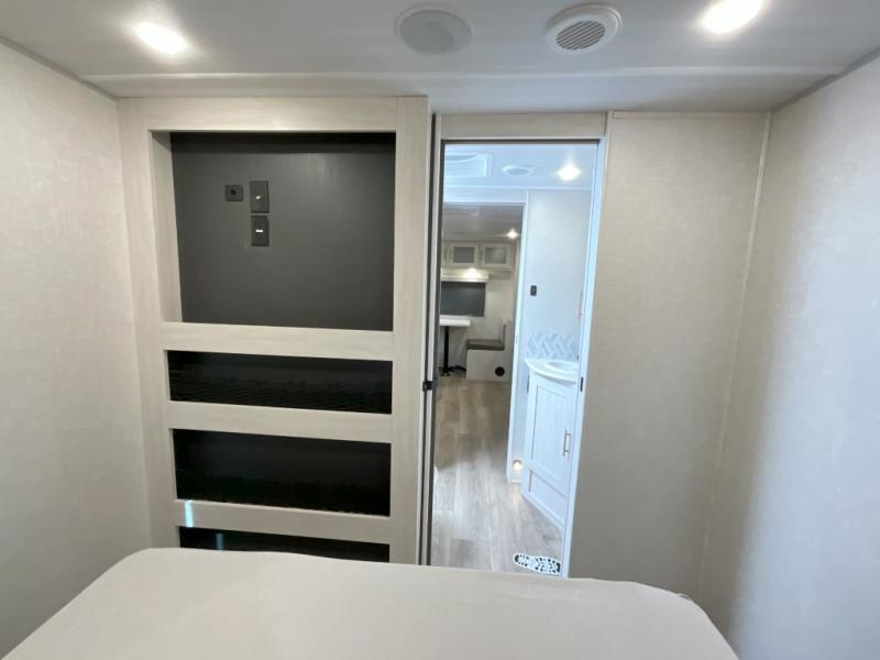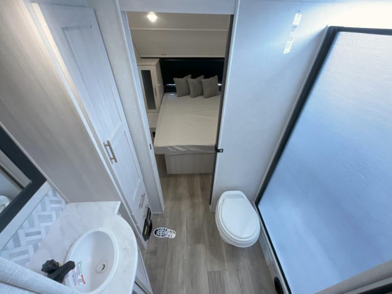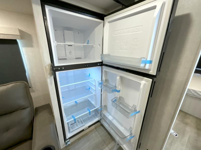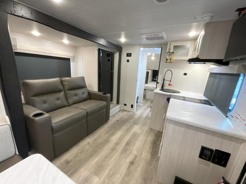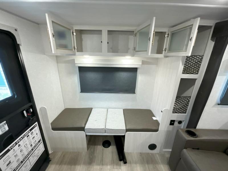 Whether you spend your days at the lake or in the woods, you'll be met with comfort in this spacious travel trailer. There is a rear dinette where you can enjoy your meals together, a 56" theater seat across from a 12V TV, and a slide out for added space. The walk-through bath includes a night light for easy nighttime use, and the front master bedroom includes a queen bed just like at home. There are also dual wardrobes and end tables plus an entertainment center if you want to add a TV. Outside, you'll find a rear accessory hitch, upgraded tires with TPMS, a 14' awning, and a slam latch cargo doors to keep your gear secure.