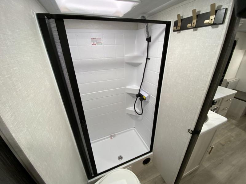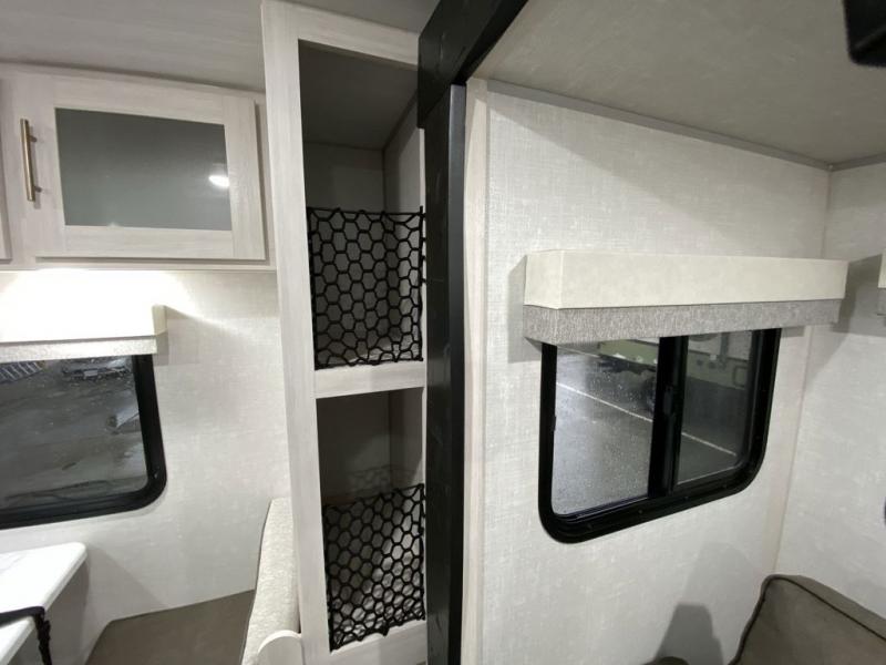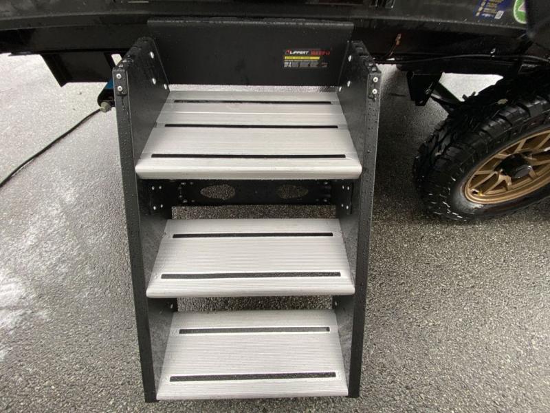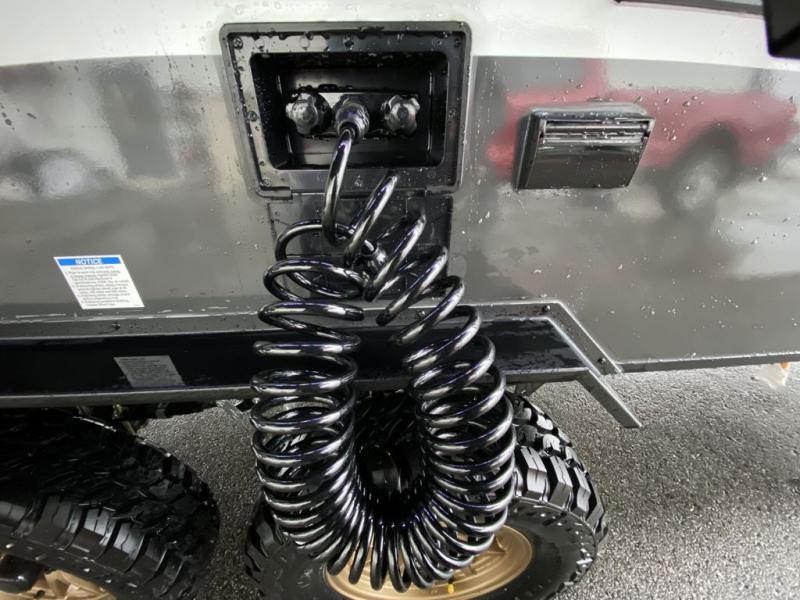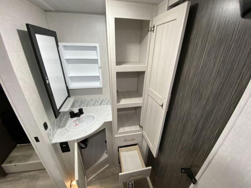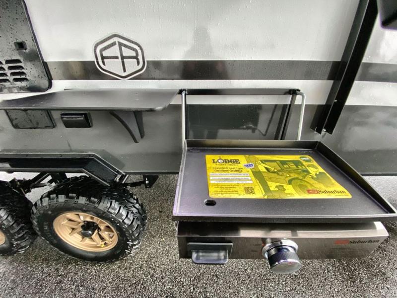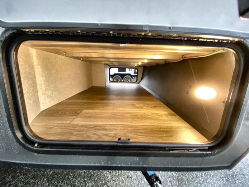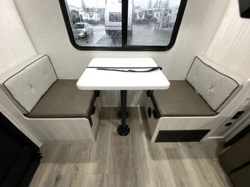 Whether you spend your days at the lake or in the woods, you'll be met with comfort in this spacious travel trailer. There is a rear dinette where you can enjoy your meals together, a 56" theater seat across from a 12V TV, and a slide out for added space. The walk-thru bath includes a night light for easy nighttime use, and the front master bedroom includes a queen bed just like at home. There are also dual wardrobes and end tables plus an entertainment center if you want to add a TV. Outside, you'll find a rear accessory hitch, a 14' awning, and a slam latch cargo doors to keep your gear secure. This model also includes the Hood River Edition that comes with Mud Legend all terrain tires with TPMS, advanced ground clearance, a MaxxAir vent cover, and 12V tank heaters!