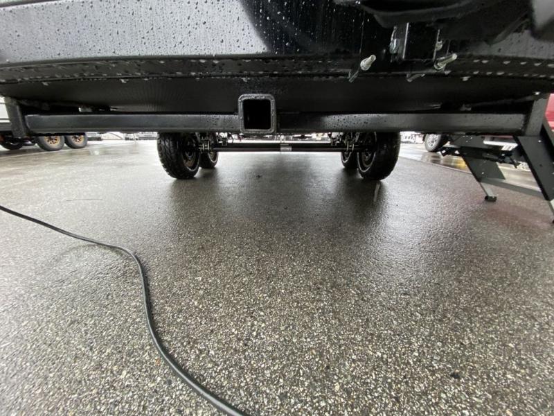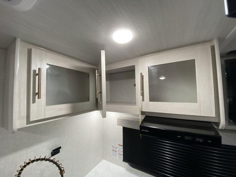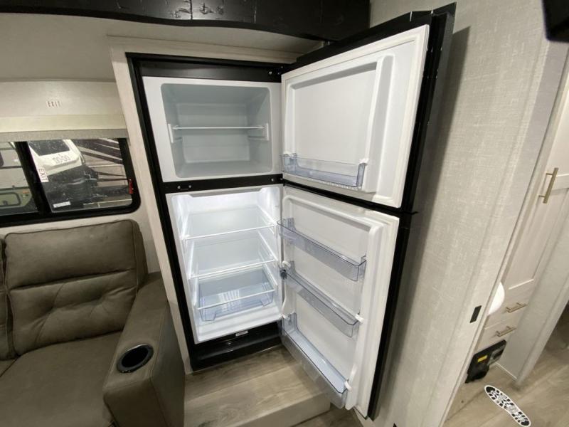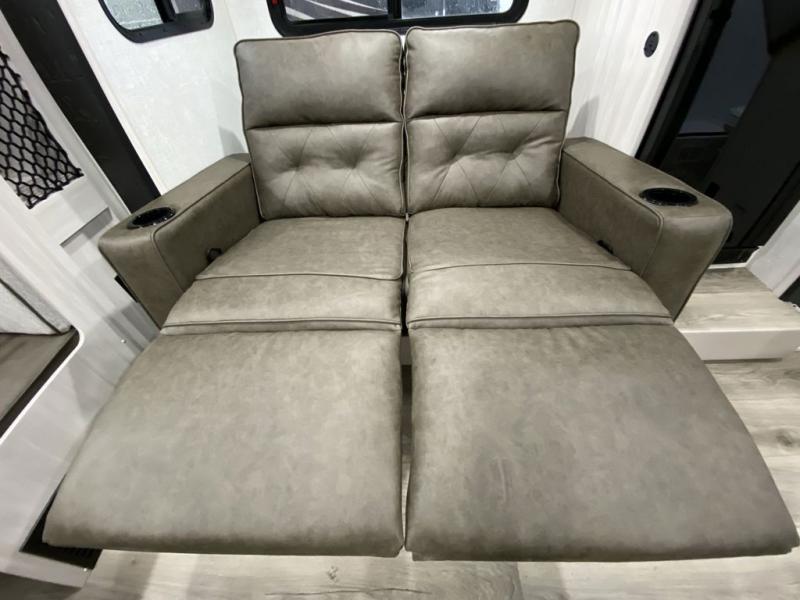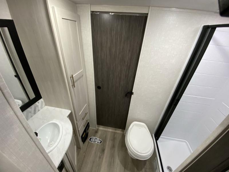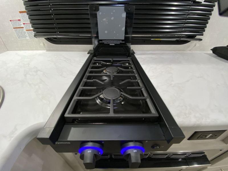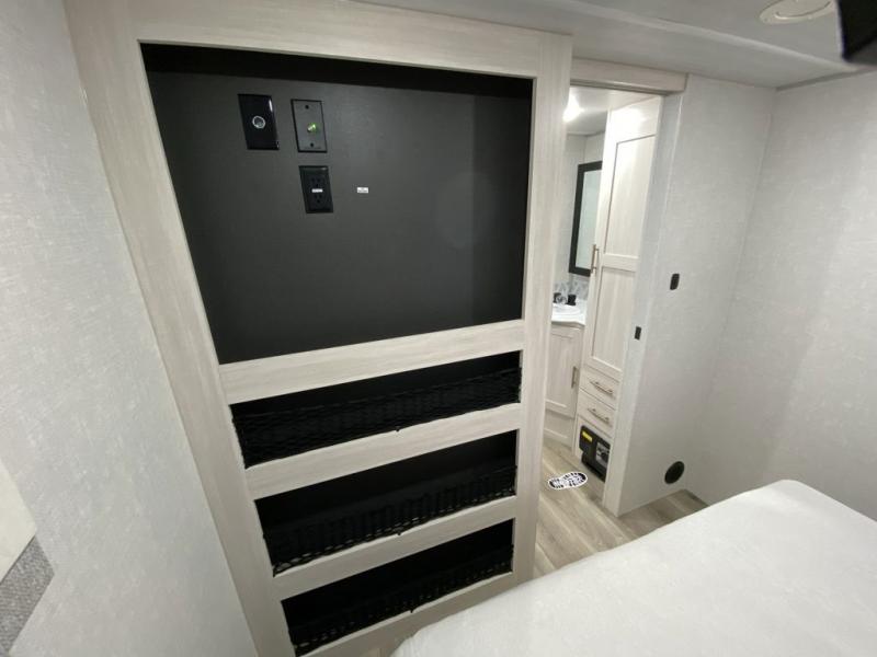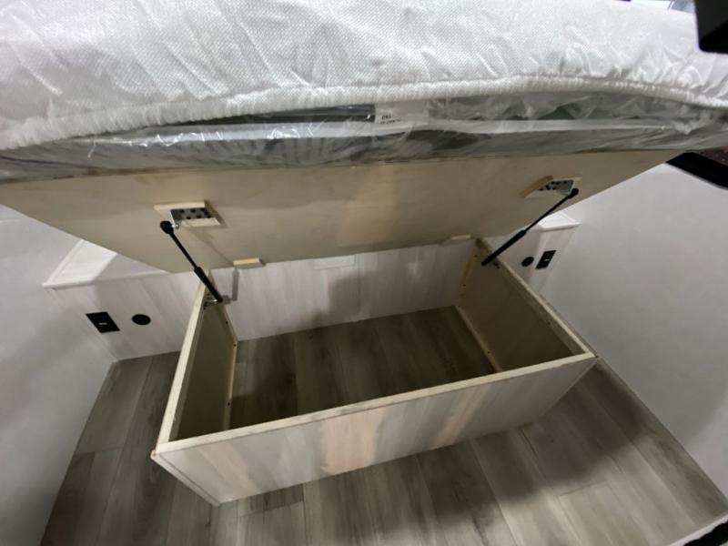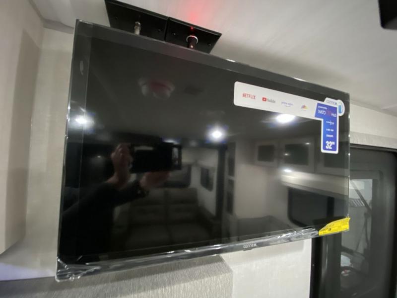 Whether you spend your days at the lake or in the woods, you'll be met with comfort in this spacious travel trailer. There is a rear dinette where you can enjoy your meals together, a 56" theater seat across from a 12V TV, and a slide out for added space. The walk-thru bath includes a night light for easy nighttime use, and the front master bedroom includes a queen bed just like at home. There are also dual wardrobes and end tables plus an entertainment center if you want to add a TV. Outside, you'll find a rear accessory hitch, a 14' awning, and a slam latch cargo doors to keep your gear secure. This model also includes the Hood River Edition that comes with Mud Legend all terrain tires with TPMS, advanced ground clearance, a MaxxAir vent cover, and 12V tank heaters!