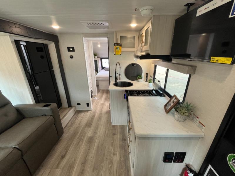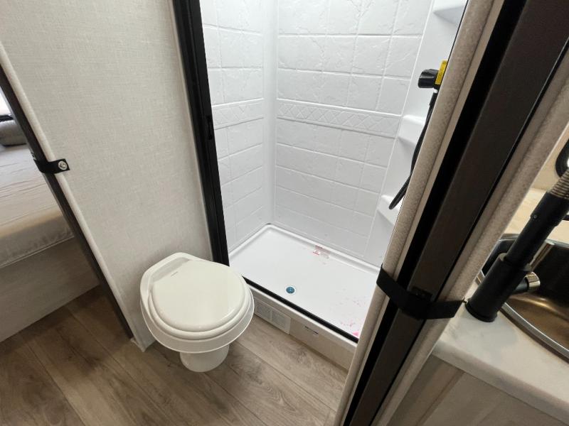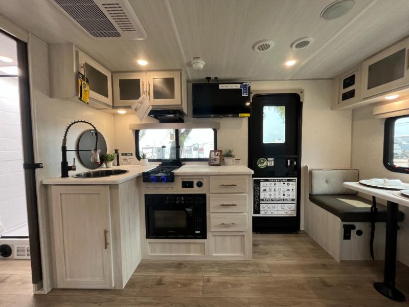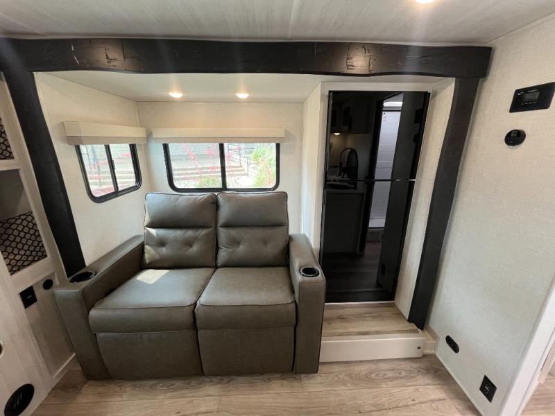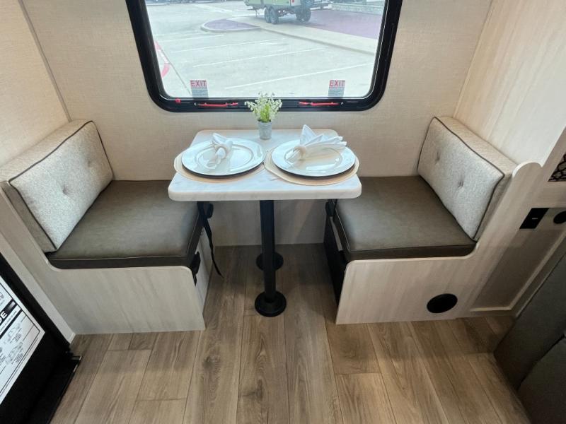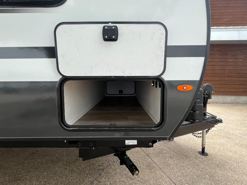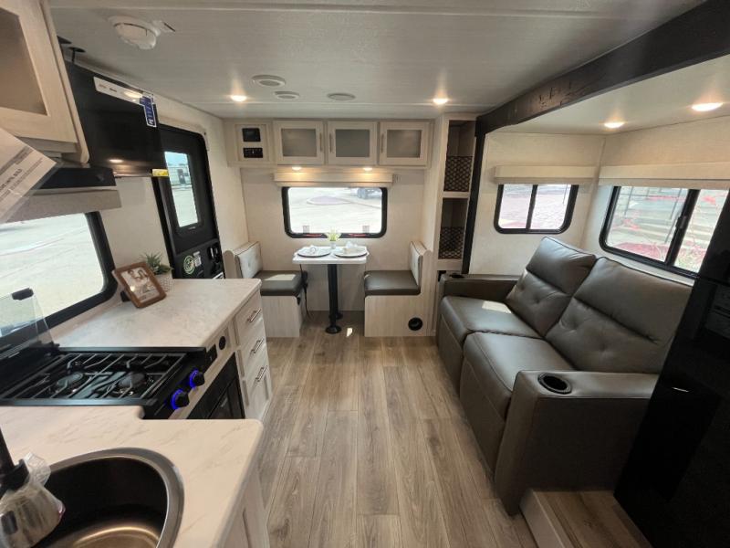 Whether you spend your days at the lake or in the woods, you'll be met with comfort in this spacious travel trailer. There is a rear dinette where you can enjoy your meals together, a 56" theater seat across from a 12V TV, and a slide out for added space. The walk-through bath includes a night light for easy nighttime use, and the front master bedroom includes a queen bed just like at home. There are also dual wardrobes and end tables plus an entertainment center if you want to add a TV. Outside, you'll find a rear accessory hitch, upgraded tires with TPMS, a 14' awning, and a slam latch cargo doors to keep your gear secure.