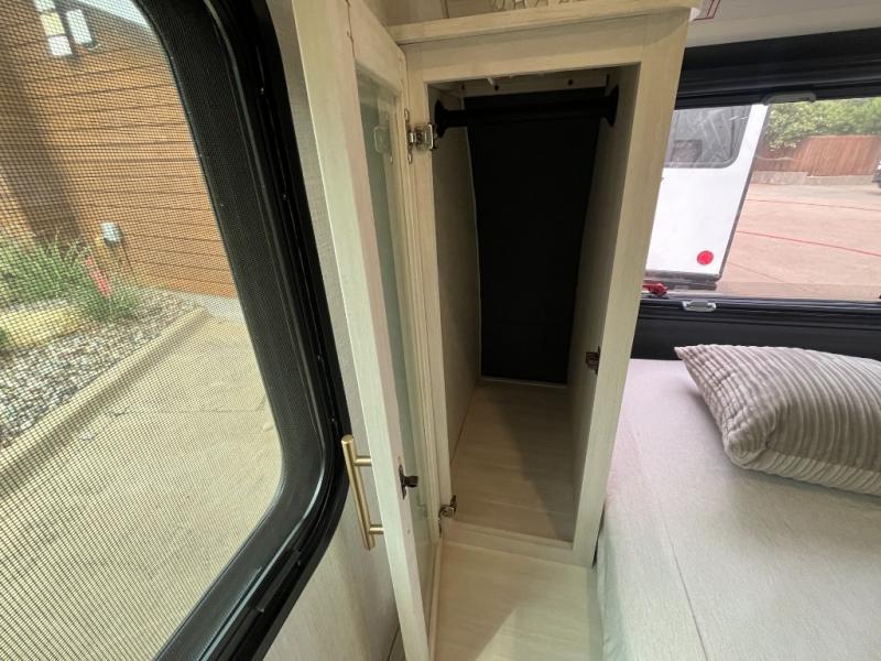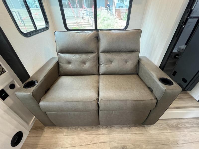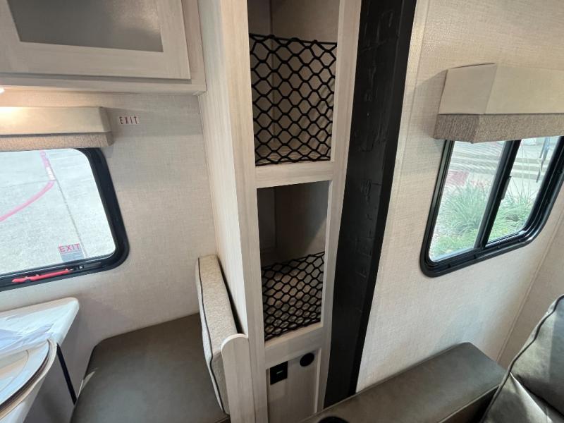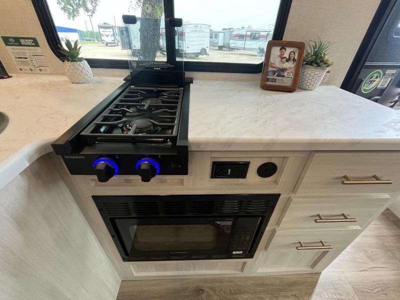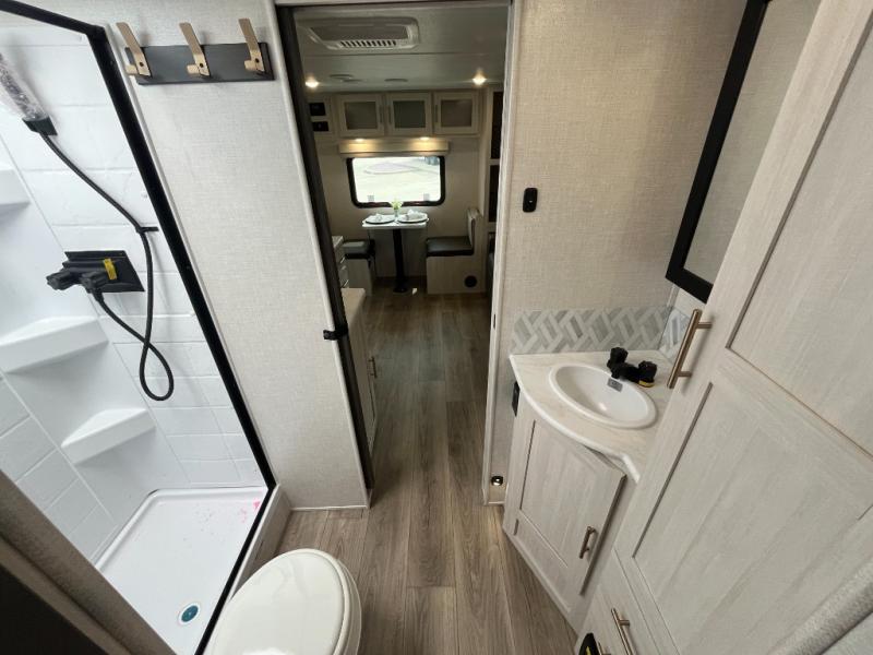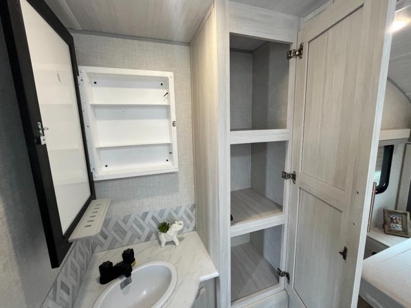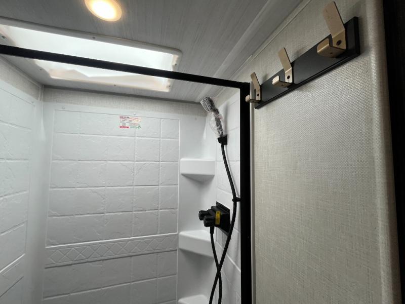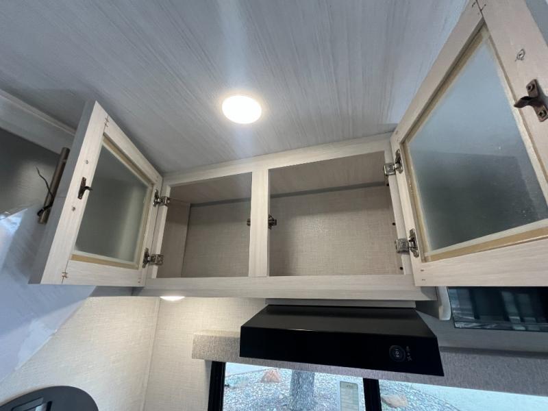 Whether you spend your days at the lake or in the woods, you'll be met with comfort in this spacious travel trailer. There is a rear dinette where you can enjoy your meals together, a 56" theater seat across from a 12V TV, and a slide out for added space. The walk-through bath includes a night light for easy nighttime use, and the front master bedroom includes a queen bed just like at home. There are also dual wardrobes and end tables plus an entertainment center if you want to add a TV. Outside, you'll find a rear accessory hitch, upgraded tires with TPMS, a 14' awning, and a slam latch cargo doors to keep your gear secure.