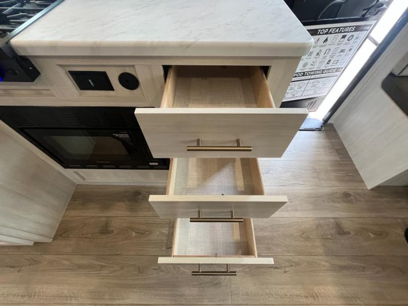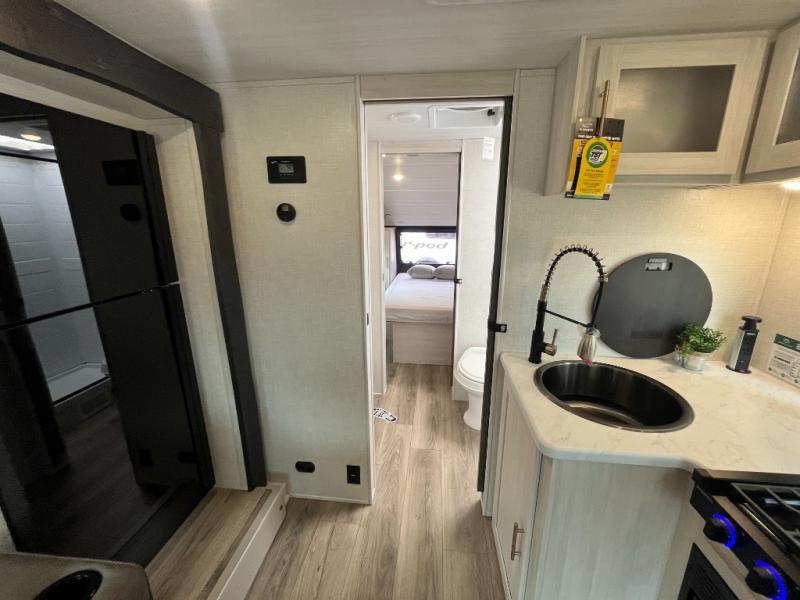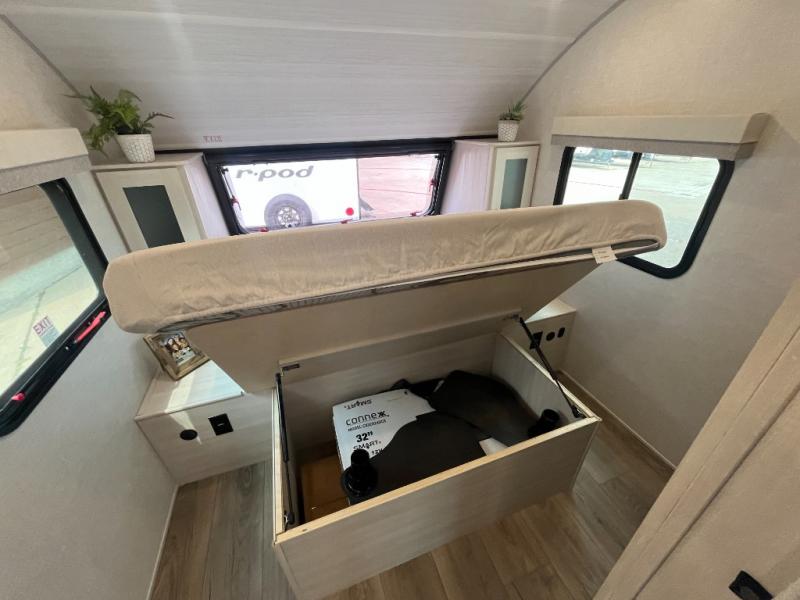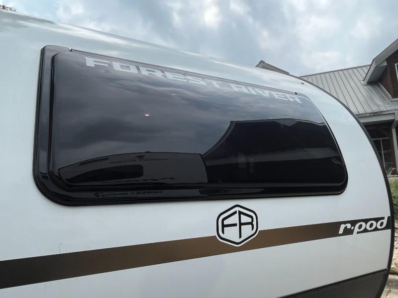 With any R-Pod travel trailer by Forest River, you will enjoy affordable luxury at the lowest tow weight in its class! There is a sealed underbelly with forced heat, a curved dual-pane acrylic front window with a bug screen and night shade, plus a large roof mounted solar panel for off-grid capabilities. The 15K A/C unit will keep you comfortable during the summer camping months, and the tankless water heater will provide endless hot showers after hiking, biking, swimming and more! Each model also includes a black glass friction hinge entrance door, roof ladder prep, exterior motion lighting, plus a hot and cold exterior spray port to wash off sand from the beach. Inside, you'll enjoy seamless Surf-X kitchen countertops, blackout roller shades, and a central vacuum system for hassle-free cleaning!