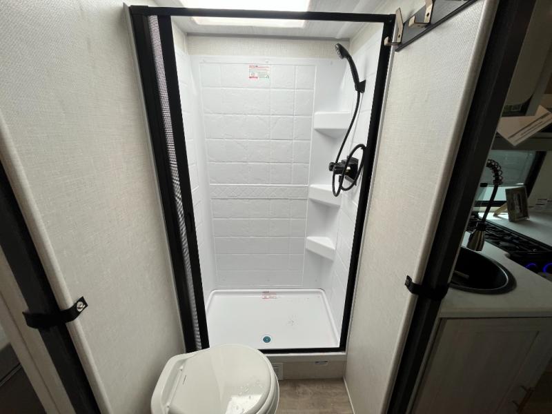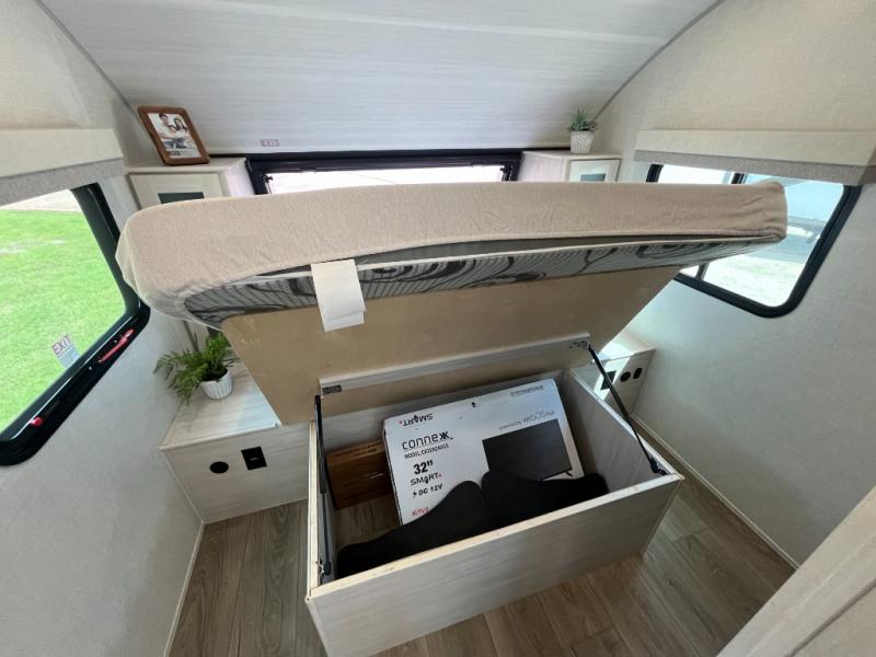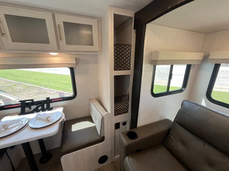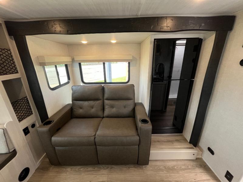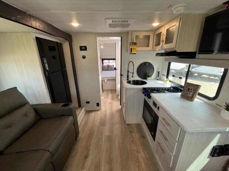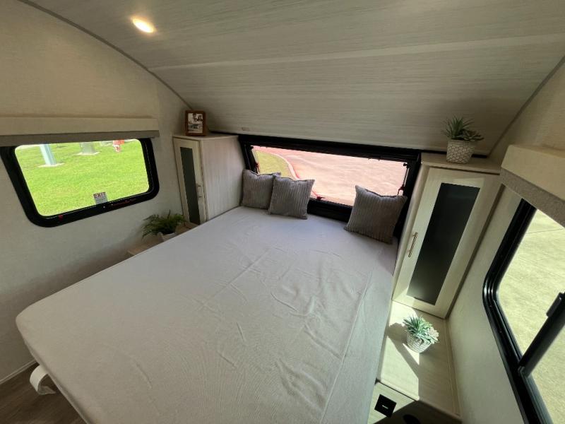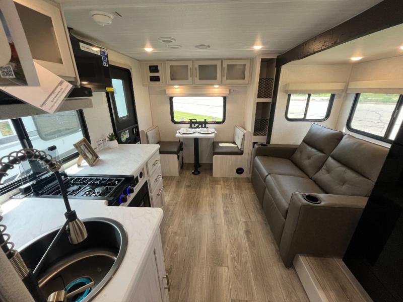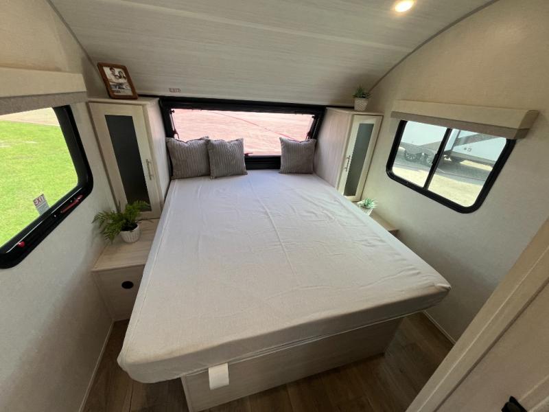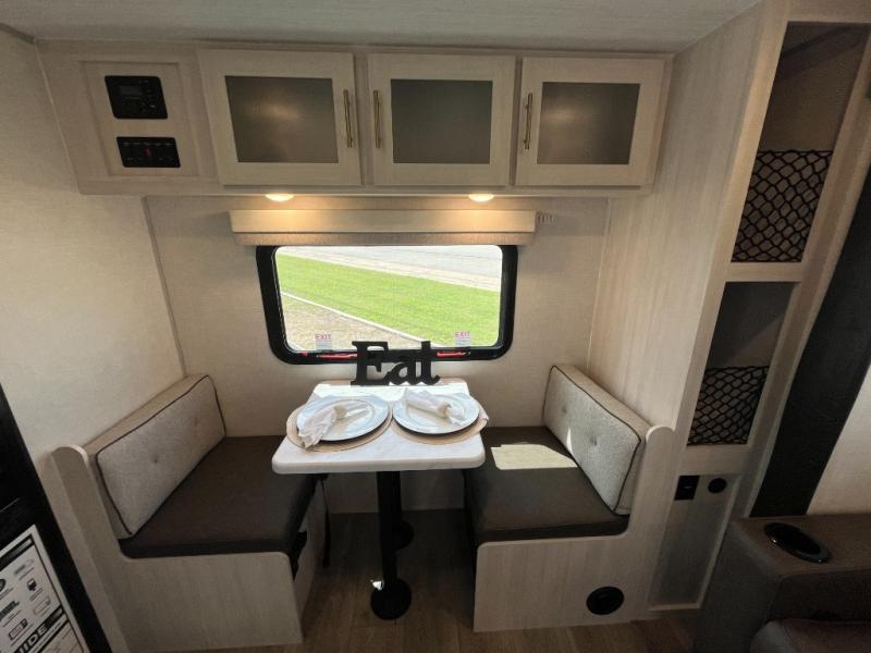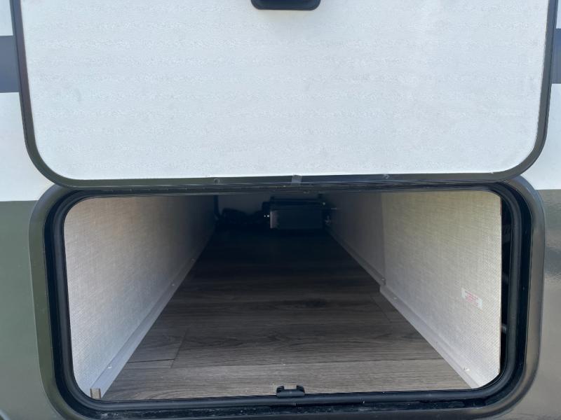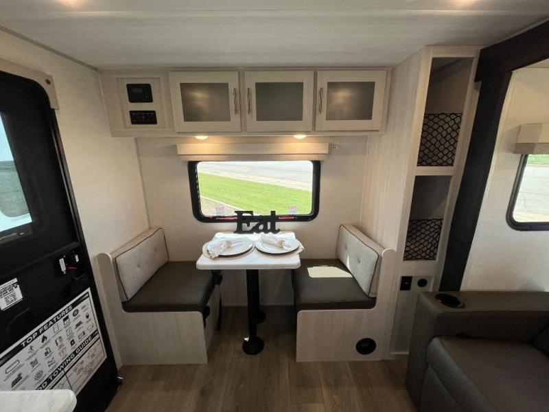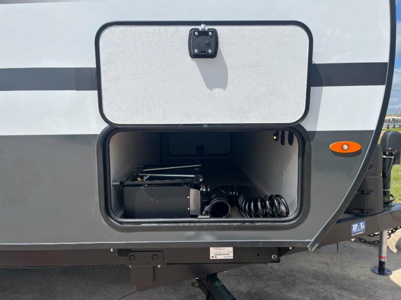 Whether you spend your days at the lake or in the woods, you'll be met with comfort in this spacious travel trailer. There is a rear dinette where you can enjoy your meals together, a 56" theater seat across from a 12V TV, and a slide out for added space. The walk-through bath includes a night light for easy nighttime use, and the front master bedroom includes a queen bed just like at home. There are also dual wardrobes and end tables plus an entertainment center if you want to add a TV. Outside, you'll find a rear accessory hitch, upgraded tires with TPMS, a 14' awning, and a slam latch cargo doors to keep your gear secure.
