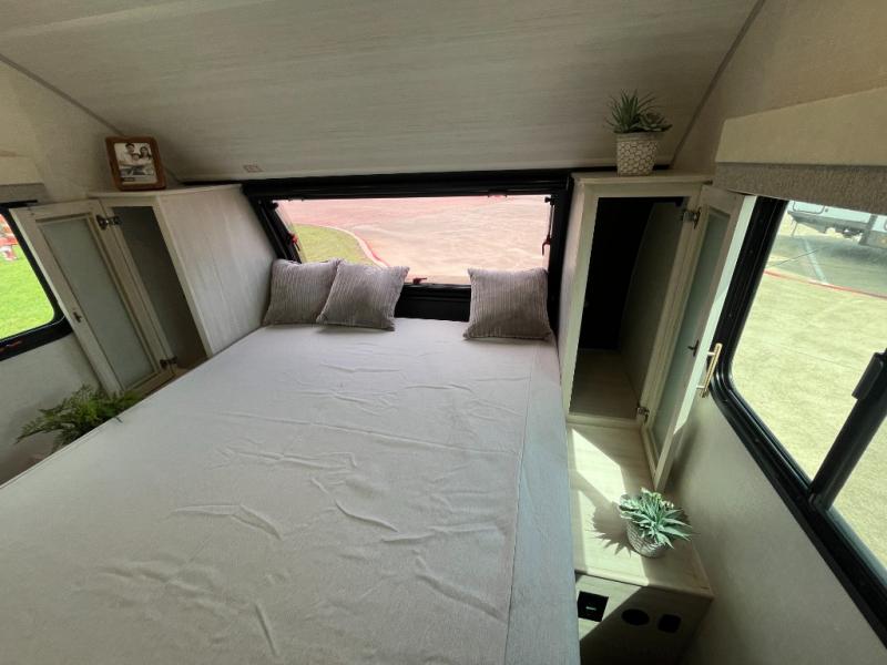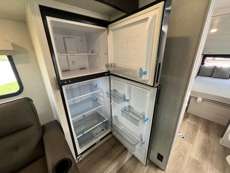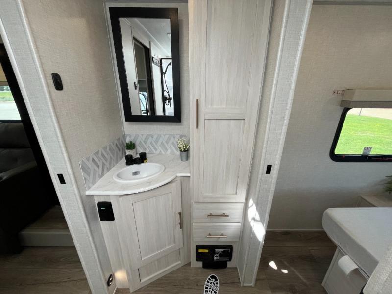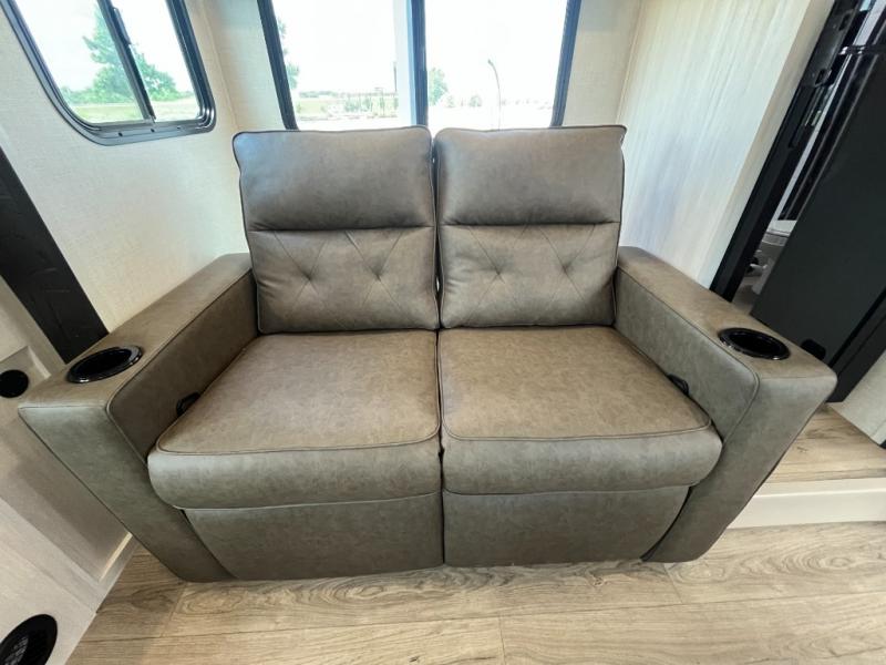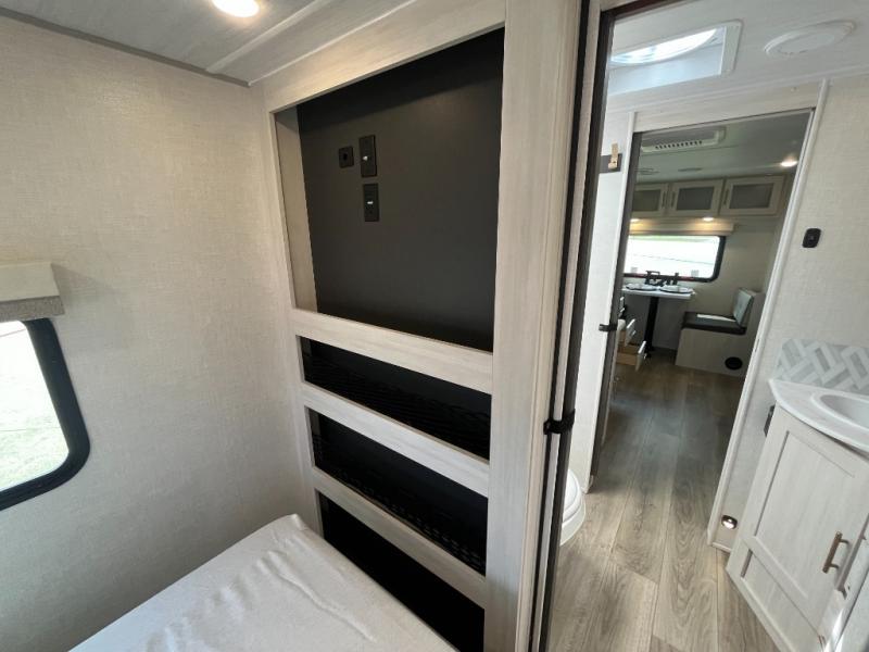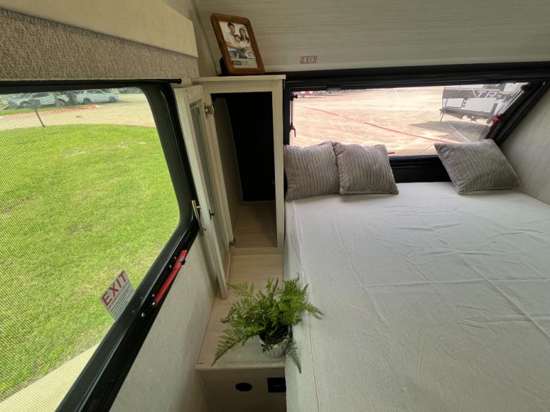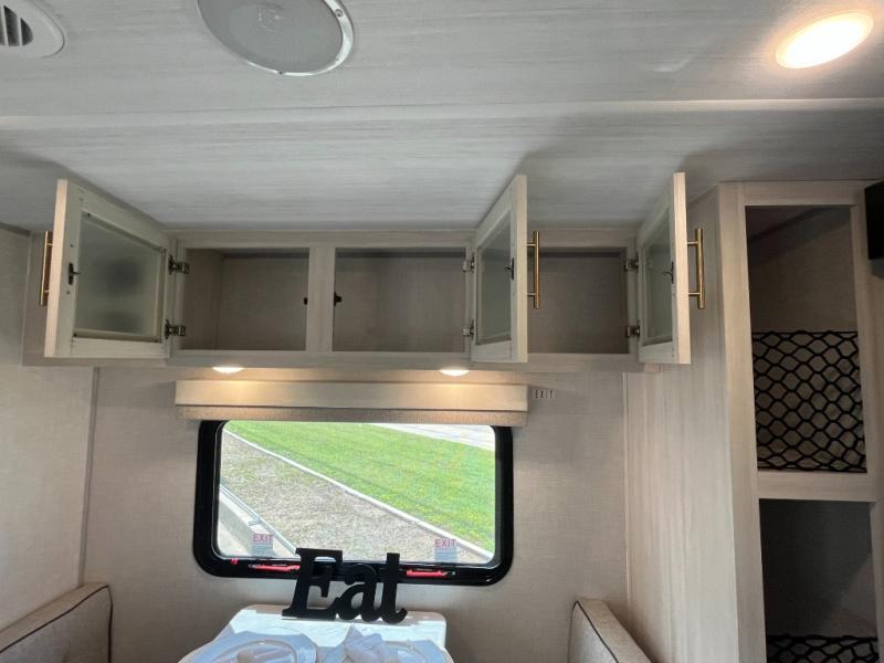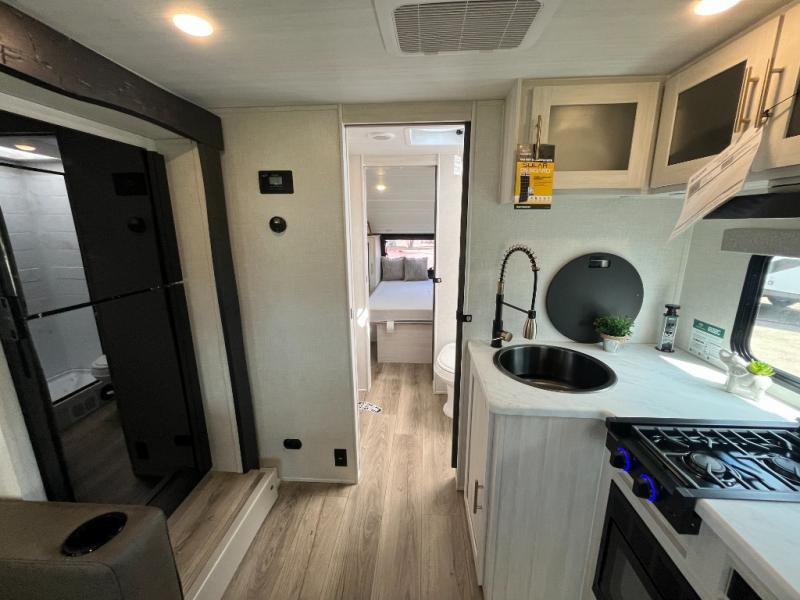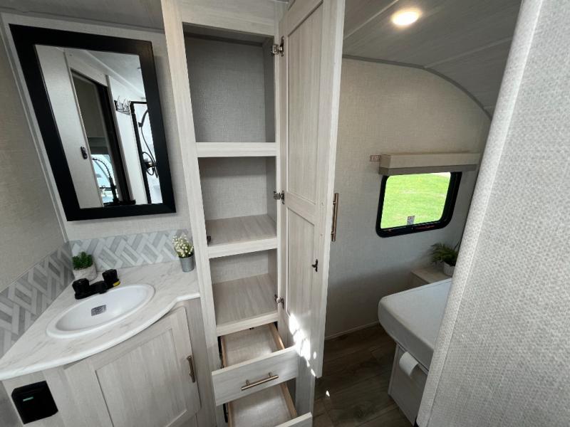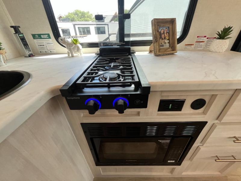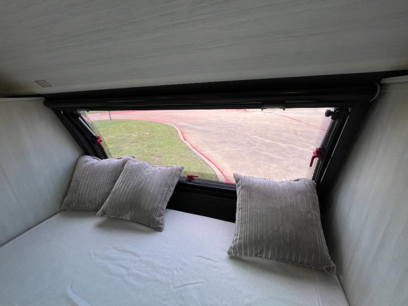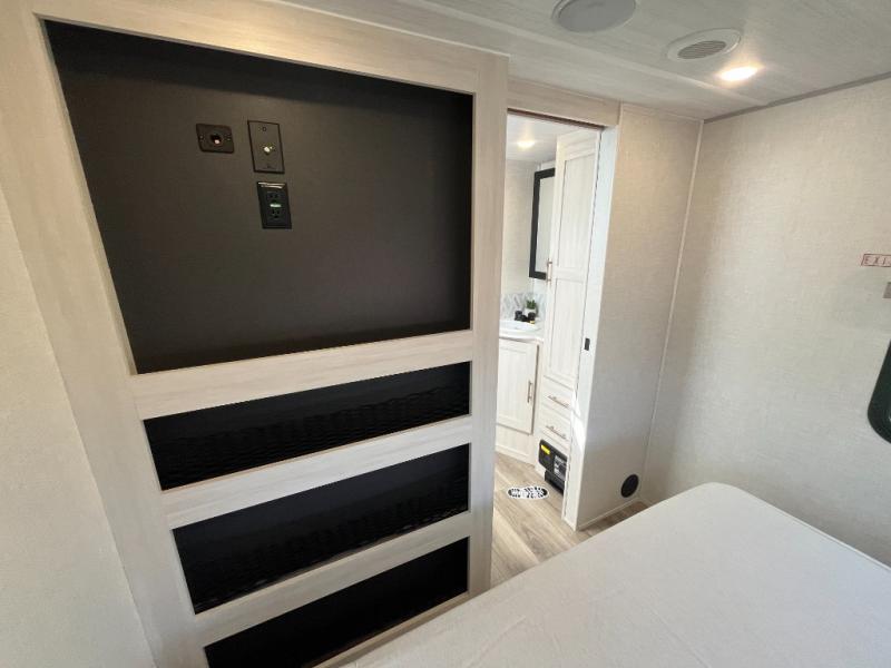 Whether you spend your days at the lake or in the woods, you'll be met with comfort in this spacious travel trailer. There is a rear dinette where you can enjoy your meals together, a 56" theater seat across from a 12V TV, and a slide out for added space. The walk-through bath includes a night light for easy nighttime use, and the front master bedroom includes a queen bed just like at home. There are also dual wardrobes and end tables plus an entertainment center if you want to add a TV. Outside, you'll find a rear accessory hitch, upgraded tires with TPMS, a 14' awning, and a slam latch cargo doors to keep your gear secure.