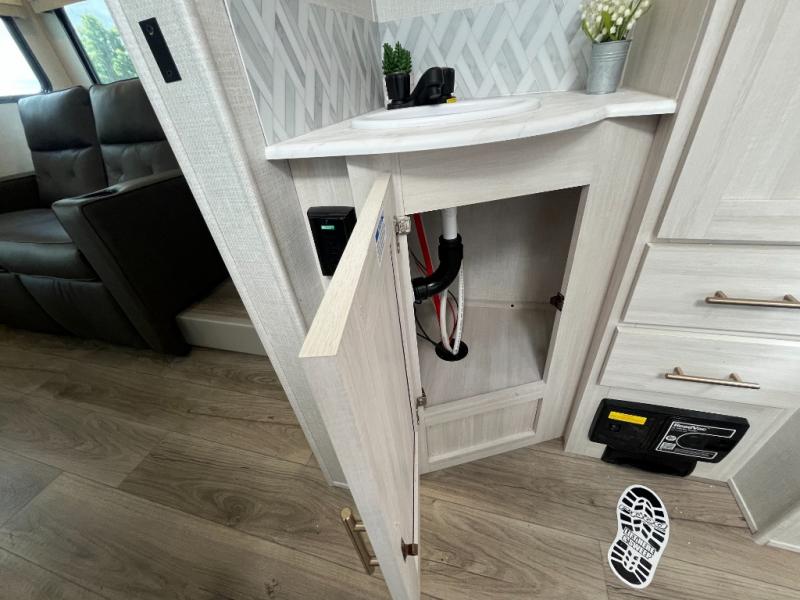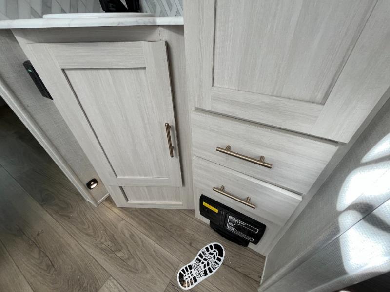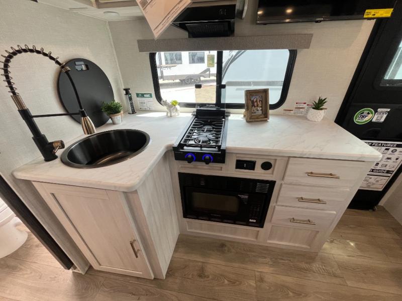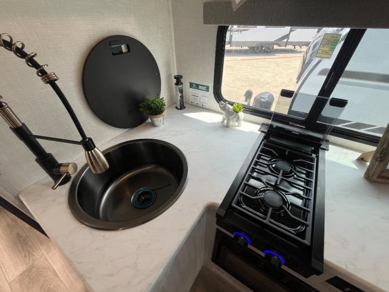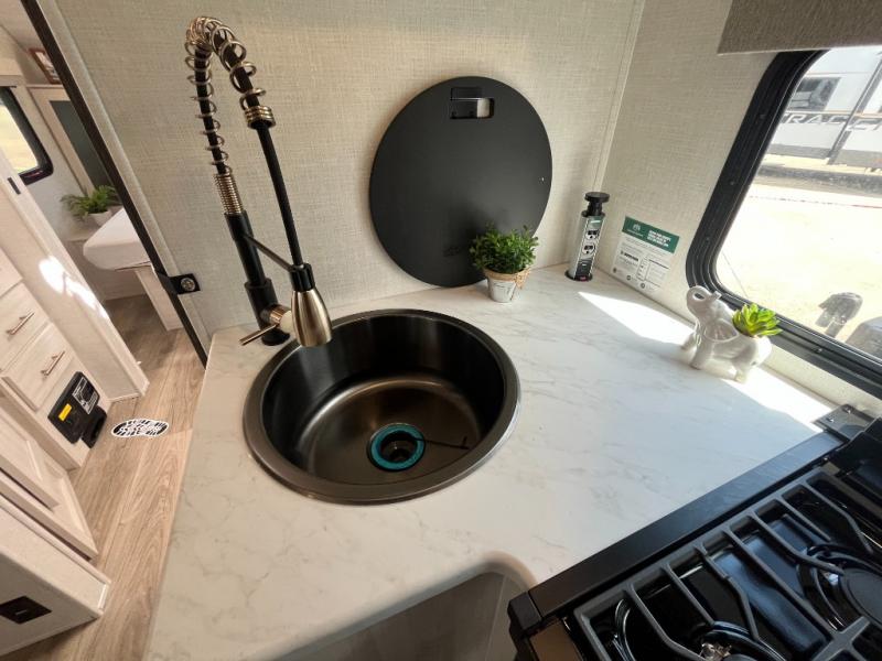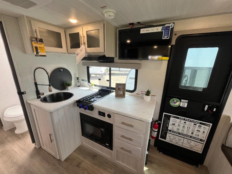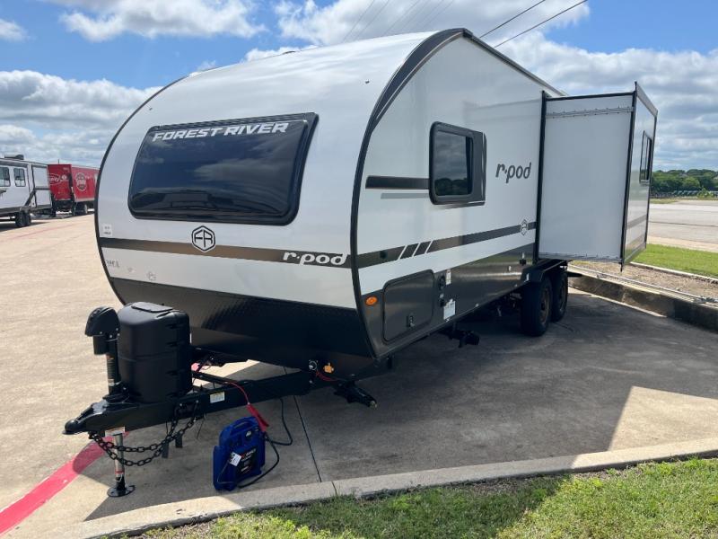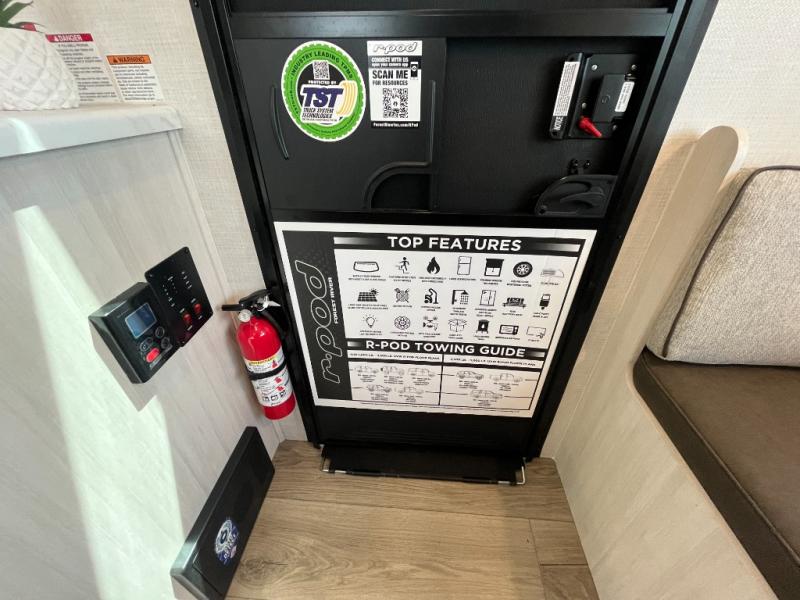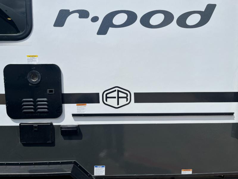 With any R-Pod travel trailer by Forest River, you will enjoy affordable luxury at the lowest tow weight in its class! There is a sealed underbelly with forced heat, a curved dual-pane acrylic front window with a bug screen and night shade, plus a large roof mounted solar panel for off-grid capabilities. The 15K A/C unit will keep you comfortable during the summer camping months, and the tankless water heater will provide endless hot showers after hiking, biking, swimming and more! Each model also includes a black glass friction hinge entrance door, roof ladder prep, exterior motion lighting, plus a hot and cold exterior spray port to wash off sand from the beach. Inside, you'll enjoy seamless Surf-X kitchen countertops, blackout roller shades, and a central vacuum system for hassle-free cleaning!