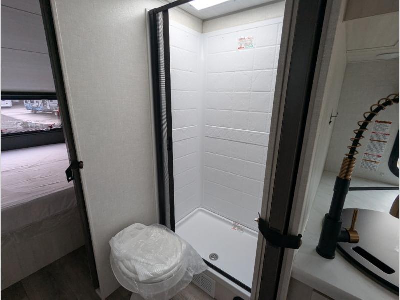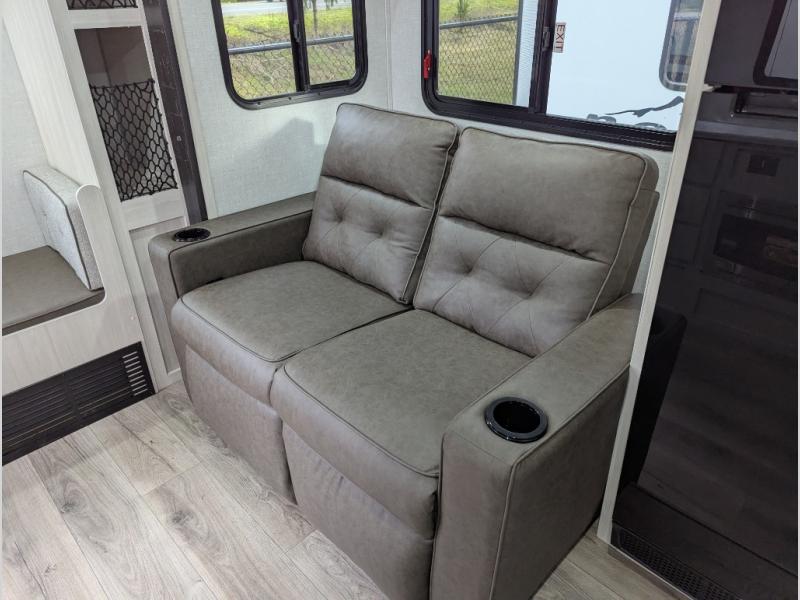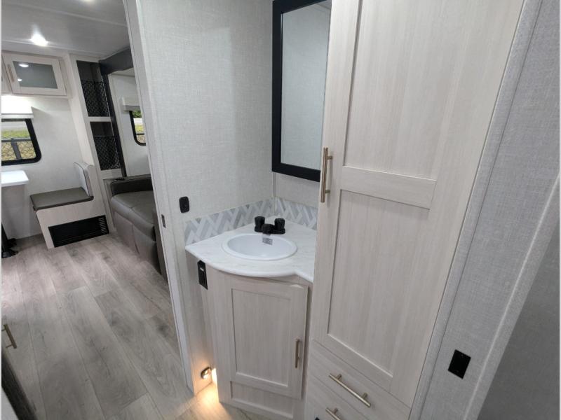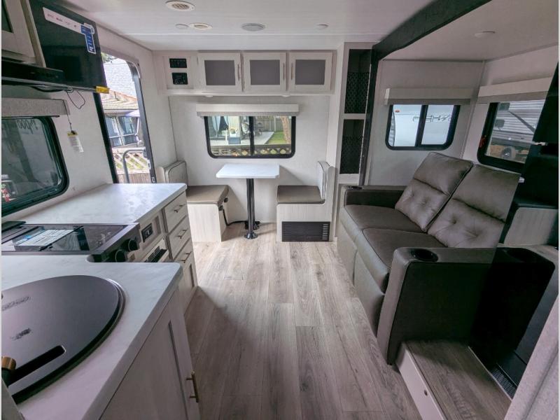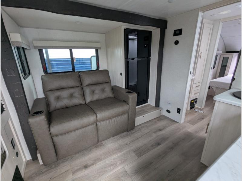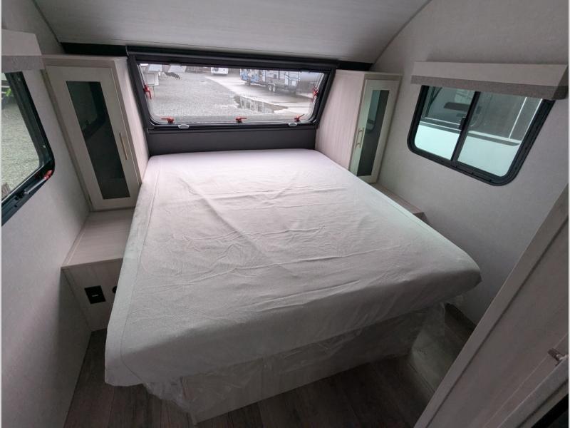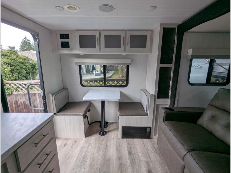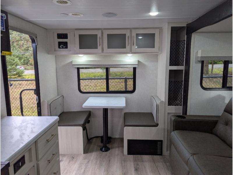 Whether you spend your days at the lake or in the woods, you'll be met with comfort in this spacious travel trailer. There is a rear dinette where you can enjoy your meals together, a 56" theater seat across from a 12V TV, and a slide out for added space. The walk-thru bath includes a night light for easy nighttime use, and the front master bedroom includes a queen bed just like at home. There are also dual wardrobes and end tables plus an entertainment center if you want to add a TV. Outside, you'll find a rear accessory hitch, a 14' awning, and a slam latch cargo doors to keep your gear secure. This model also includes the Hood River Edition that comes with Mud Legend all terrain tires with TPMS, a MaxxAir vent cover, and 12V tank heaters!