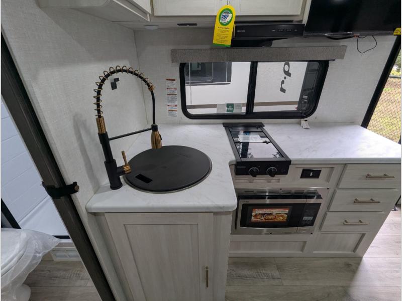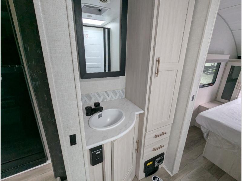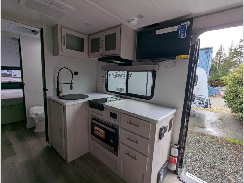 With any R-Pod travel trailer by Forest River, you will enjoy affordable luxury at the lowest tow weight in its class! There is a sealed underbelly with forced heat, a curved dual-pane acrylic front window with a bug screen and night shade, plus a large roof mounted solar panel for off-grid capabilities. The 15K A/C unit will keep you comfortable during the summer camping months, and the tankless water heater will provide endless hot showers after hiking, biking, swimming and more! Each model also includes a black glass friction hinge entrance door, roof ladder prep, exterior motion lighting, plus a hot and cold exterior spray port to wash off sand from the beach. Inside, you'll enjoy seamless Surf-X kitchen countertops, blackout roller shades, and a central vacuum system for hassle-free cleaning!