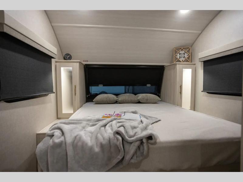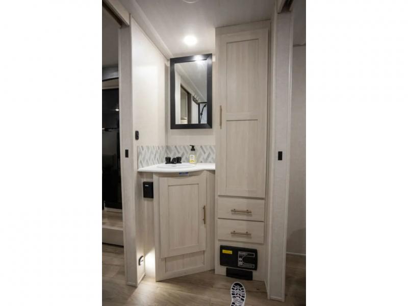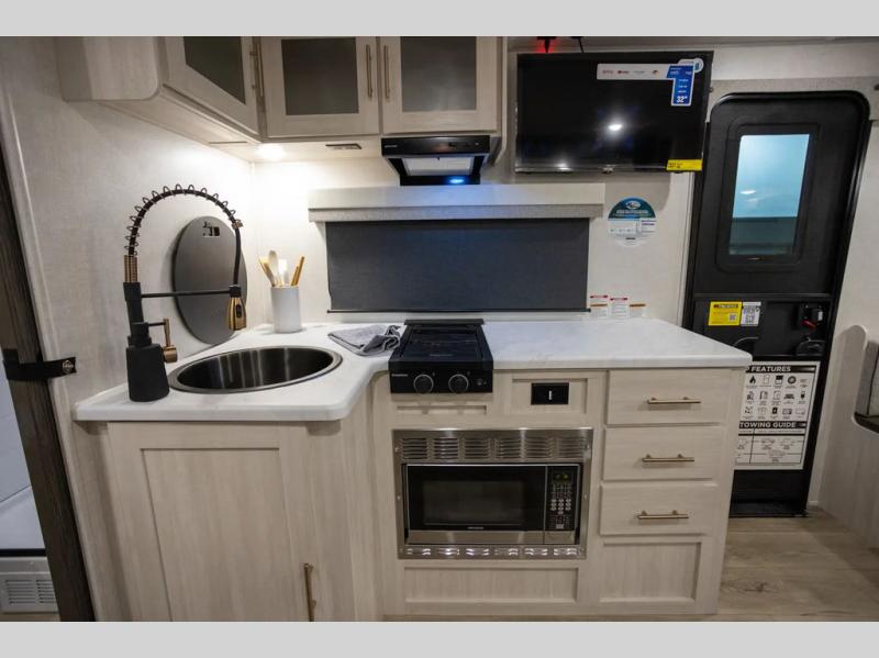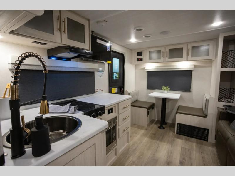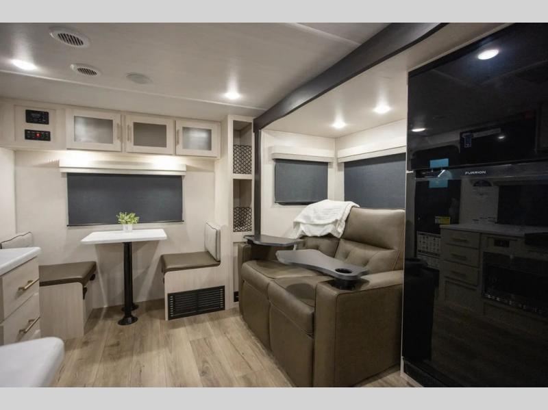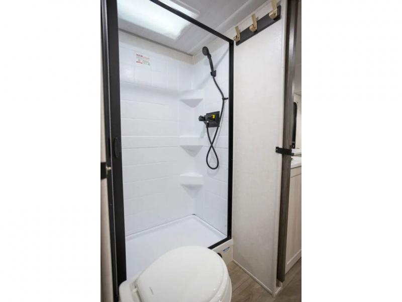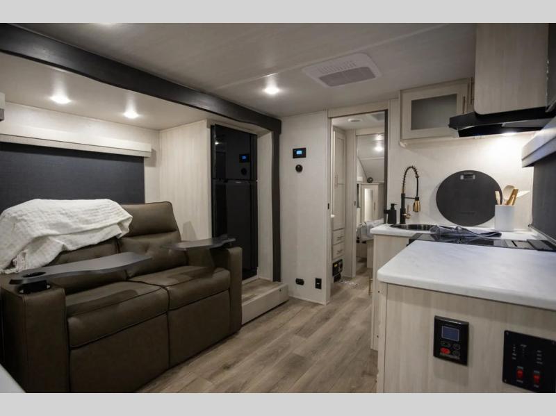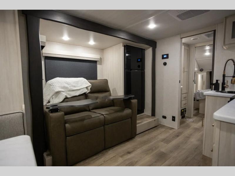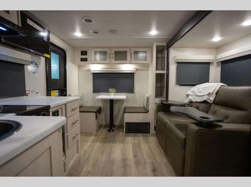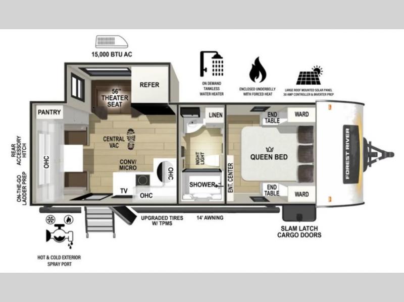 Whether you spend your days at the lake or in the woods, you'll be met with comfort in this spacious travel trailer. There is a rear dinette where you can enjoy your meals together, a 56" theater seat across from a 12V TV, and a slide out for added space. The walk-through bath includes a night light for easy nighttime use, and the front master bedroom includes a queen bed just like at home. There are also dual wardrobes and end tables plus an entertainment center if you want to add a TV. Outside, you'll find a rear accessory hitch, upgraded tires with TPMS, a 14' awning, and a slam latch cargo doors to keep your gear secure.