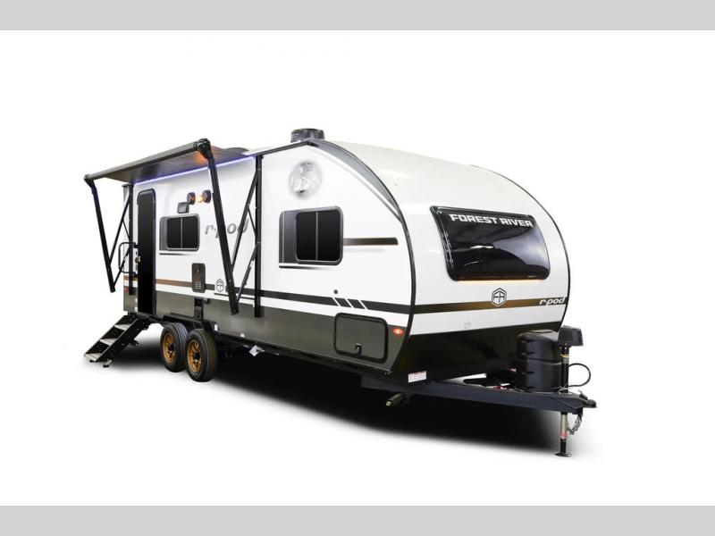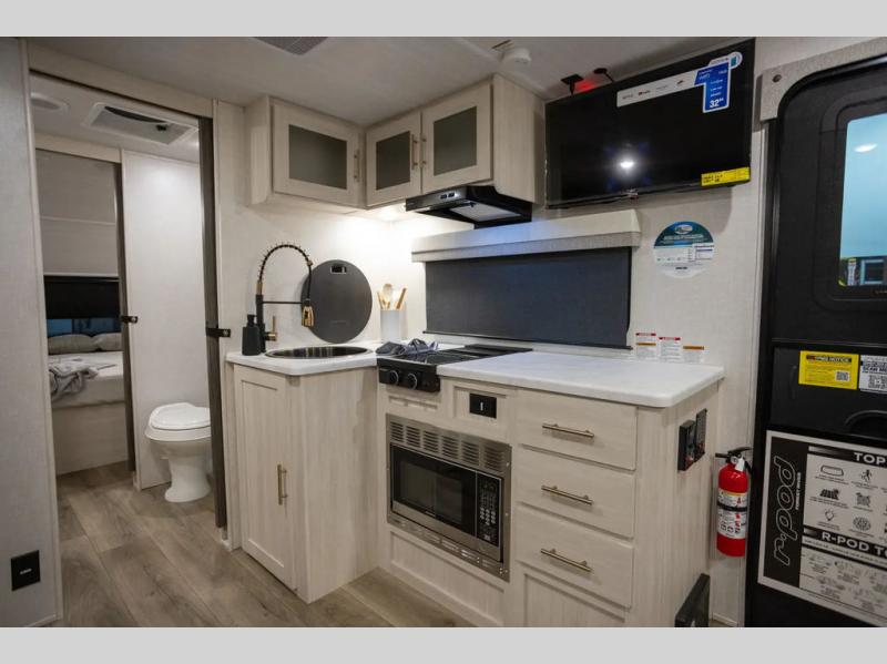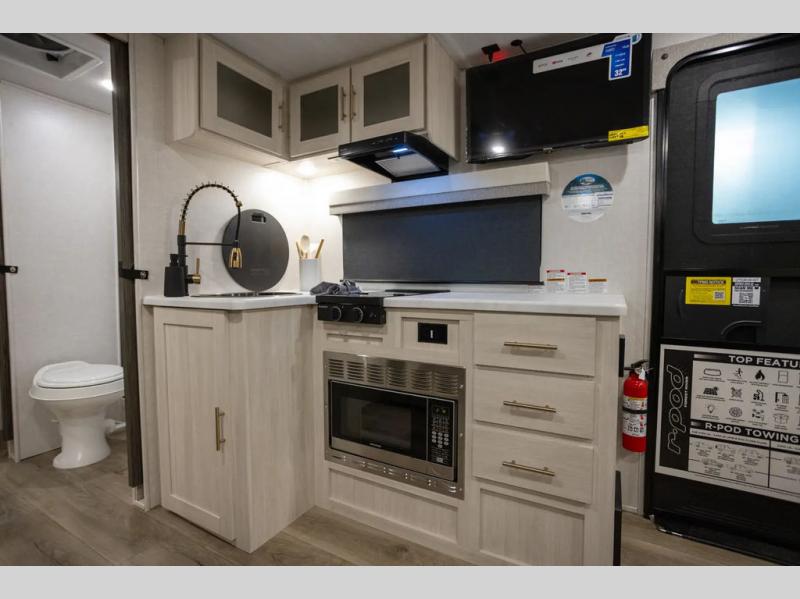 With any R-Pod travel trailer by Forest River, you will enjoy affordable luxury at the lowest tow weight in its class! There is a sealed underbelly with forced heat, a curved dual-pane acrylic front window with a bug screen and night shade, plus a large roof mounted solar panel for off-grid capabilities. The 15K A/C unit will keep you comfortable during the summer camping months, and the tankless water heater will provide endless hot showers after hiking, biking, swimming and more! Each model also includes a black glass friction hinge entrance door, roof ladder prep, exterior motion lighting, plus a hot and cold exterior spray port to wash off sand from the beach. Inside, you'll enjoy seamless Surf-X kitchen countertops, blackout roller shades, and a central vacuum system for hassle-free cleaning!