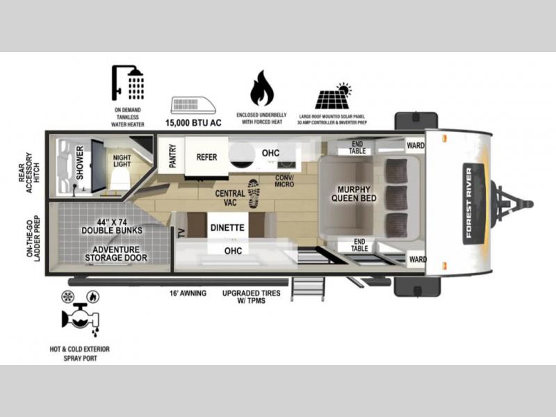With any R-Pod travel trailer by Forest River, you will enjoy affordable luxury at the lowest tow weight in its class! There is a sealed underbelly with forced heat, a curved dual-pane acrylic front window with a bug screen and night shade, plus a large roof mounted solar panel for off-grid capabilities. The 15K A/C unit will keep you comfortable during the summer camping months, and the tankless water heater will provide endless hot showers after hiking, biking, swimming and more! Each model also includes a black glass friction hinge entrance door, roof ladder prep, exterior motion lighting, plus a hot and cold exterior spray port to wash off sand from the beach. Inside, you'll enjoy seamless Surf-X kitchen countertops, blackout roller shades, and a central vacuum system for hassle-free cleaning!