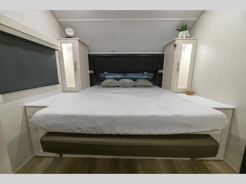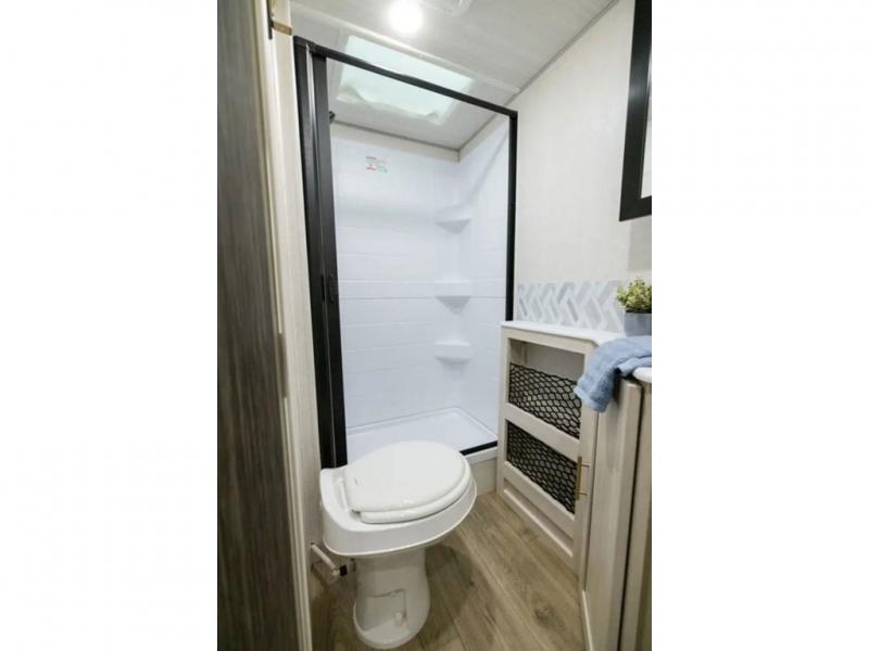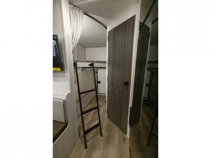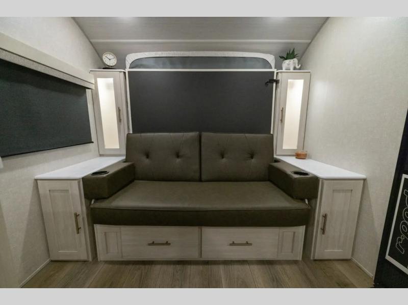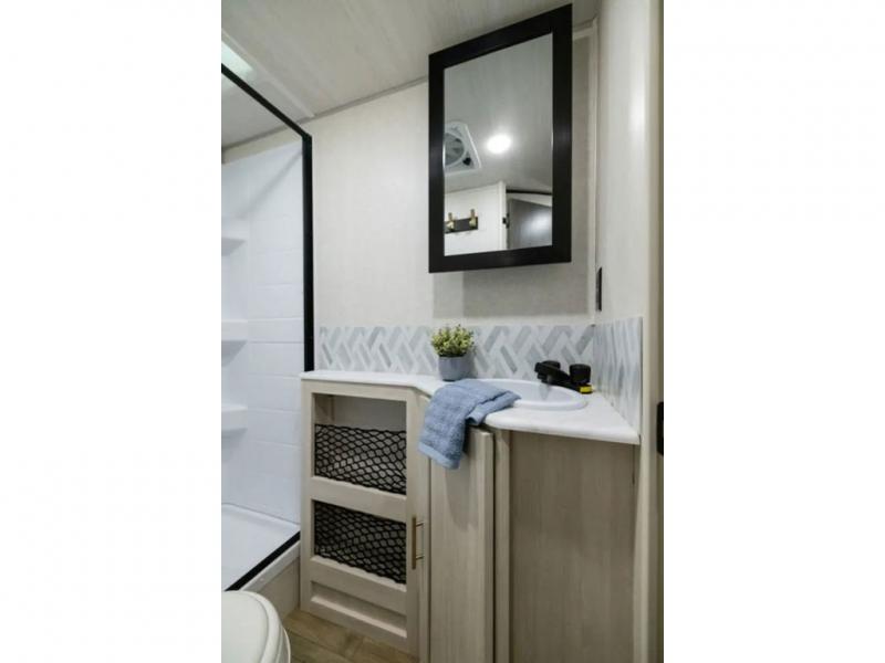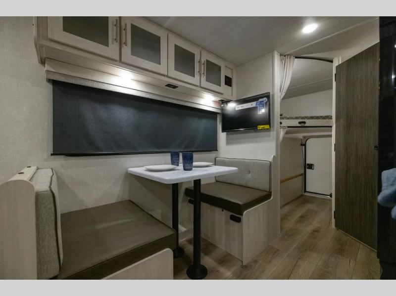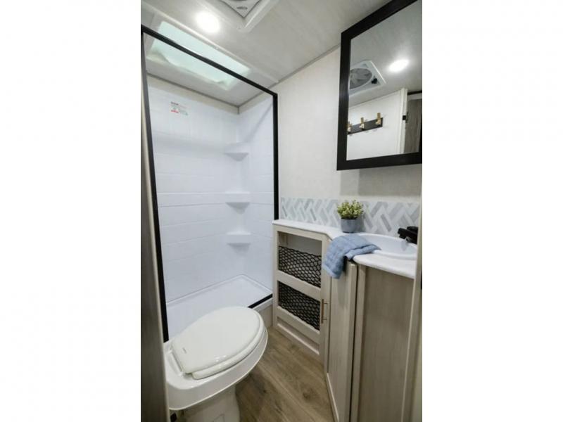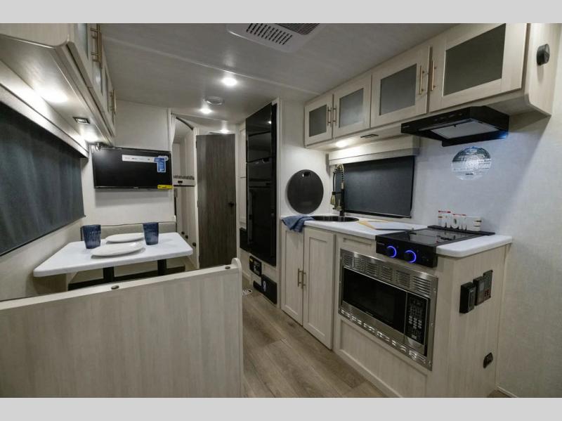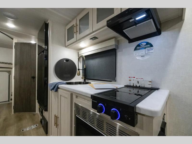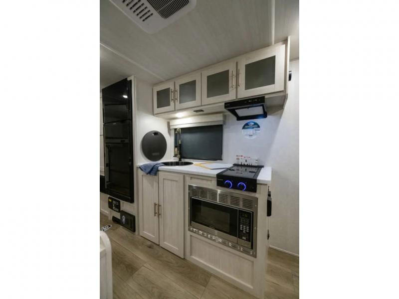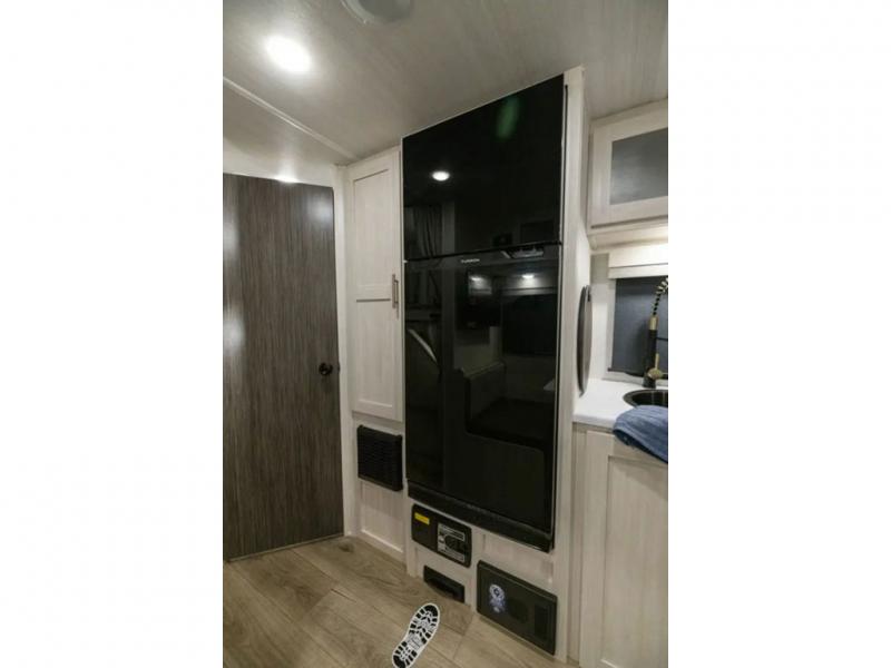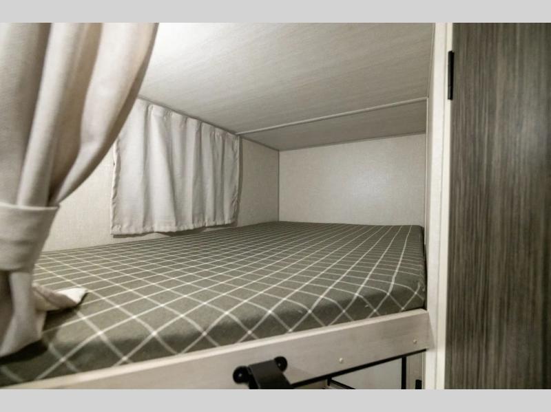 This travel trailer offers a great flexible floorplan. The living area sofa hides a queen-size Murphy bed which can be folded down at night, giving you full use of the room during the day. At the rear is a pair of double-size bunks which provide a spacious private sleeping area for children or guests. The booth dinette can also be used for an additional bed as needed. An efficient kitchen includes a convection microwave and cooktop to cook meals each day, along with a 12V black glass refrigerator and pantry for food storage.