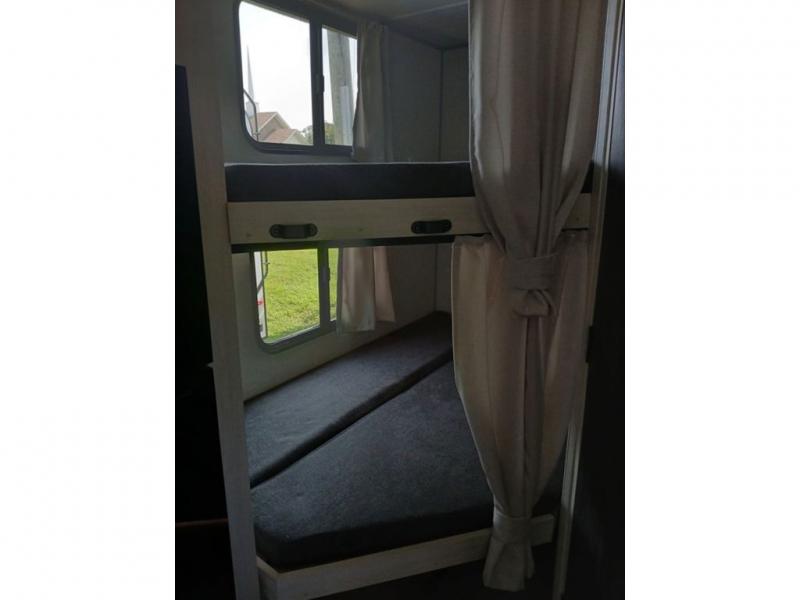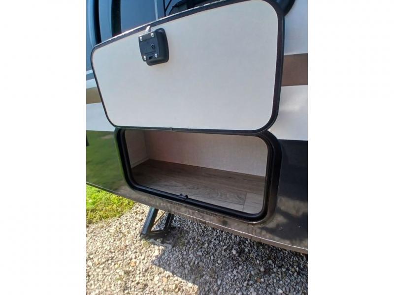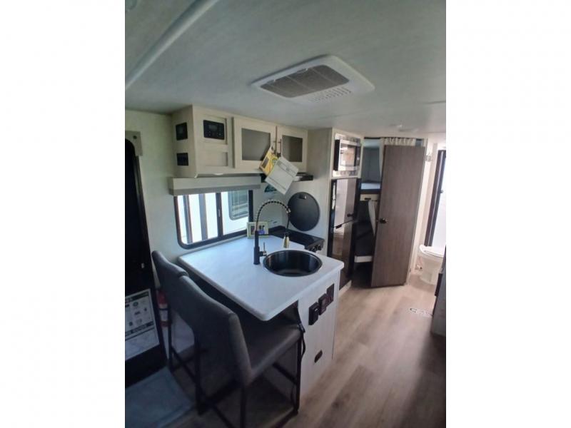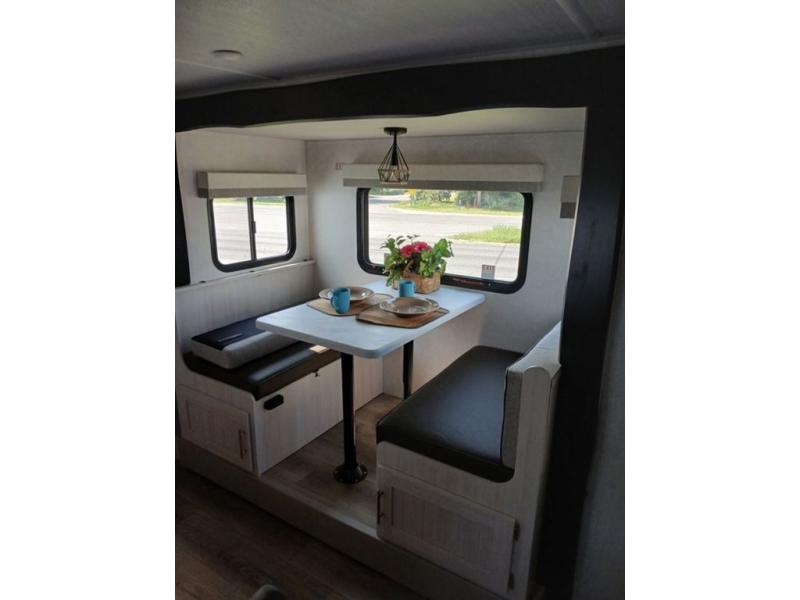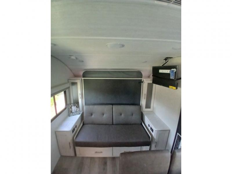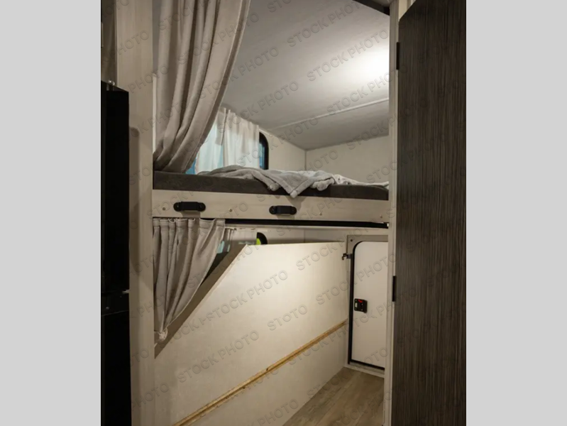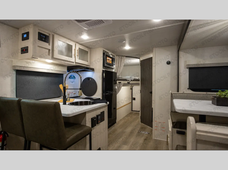This travel trailer offers a great flexible floorplan. The living area sofa hides a queen-size Murphy bed which can be folded down at night, giving you full use of the room during the day. At the rear is a pair of double-size bunks which provide a spacious private sleeping area for children or guests. The booth dinette can also be used for an additional bed as needed. An efficient kitchen includes a bar top with high chairs plus a convection microwave and cooktop to cook meals each day.