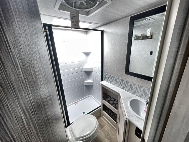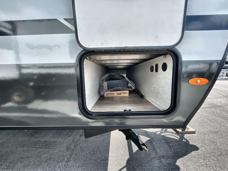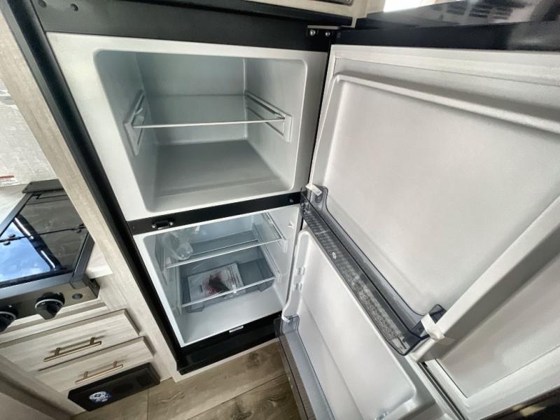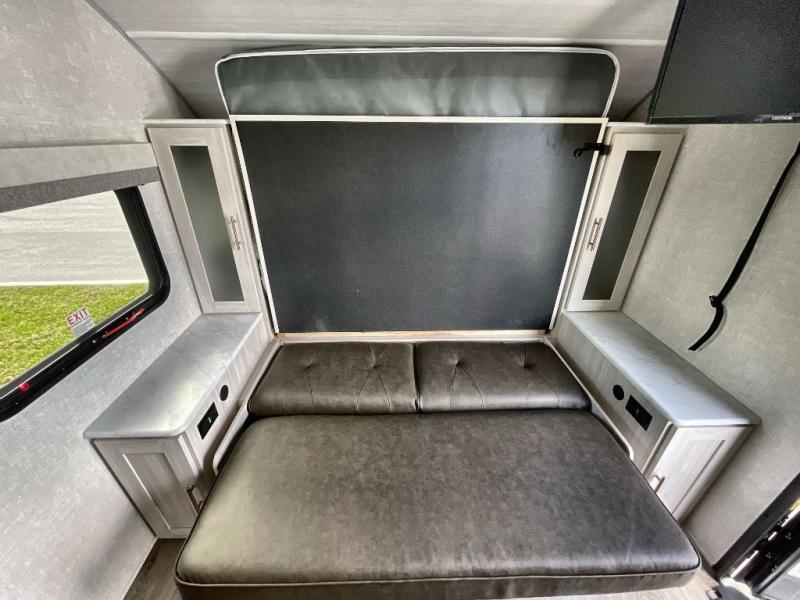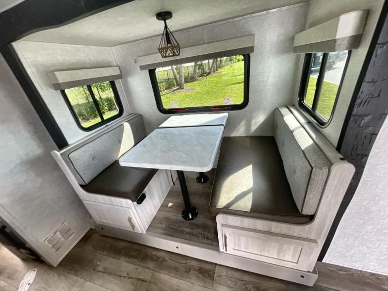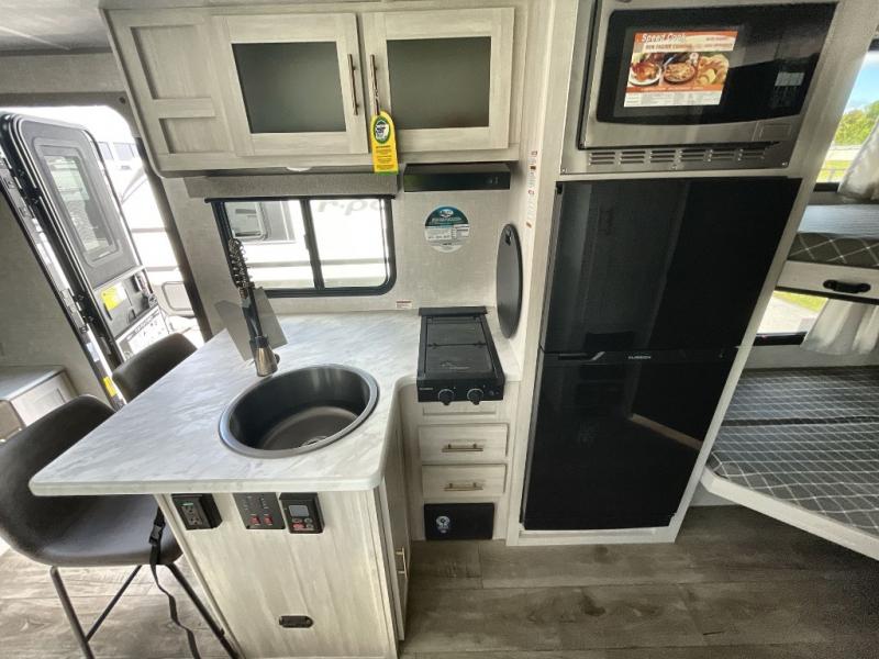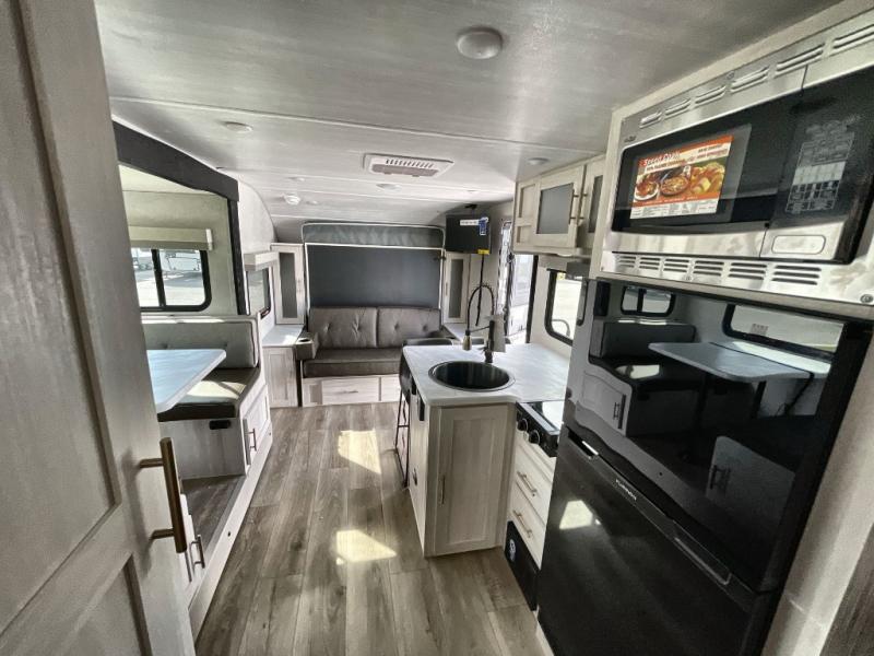 This travel trailer offers a great flexible floorplan. The living area sofa hides a queen-size Murphy bed which can be folded down at night, giving you full use of the room during the day. At the rear is a pair of double-size bunks which provide a spacious private sleeping area for children or guests. The booth dinette can also be used for an additional bed as needed. An efficient kitchen includes a bar top with high chairs plus a convection microwave and cooktop to cook meals each day.