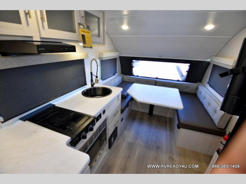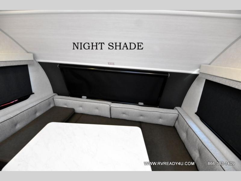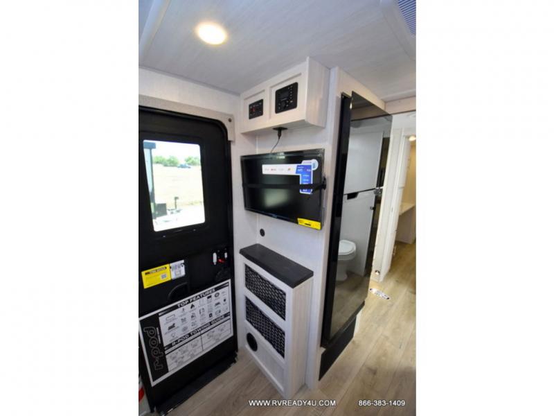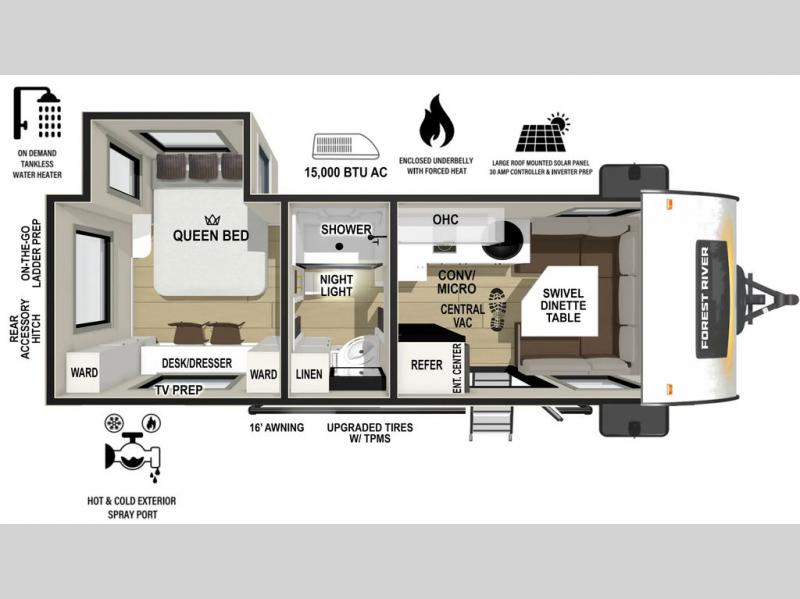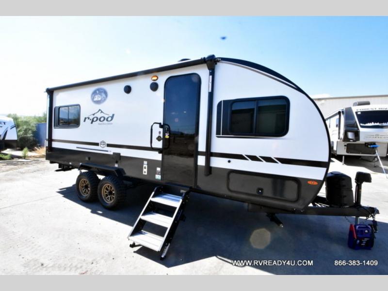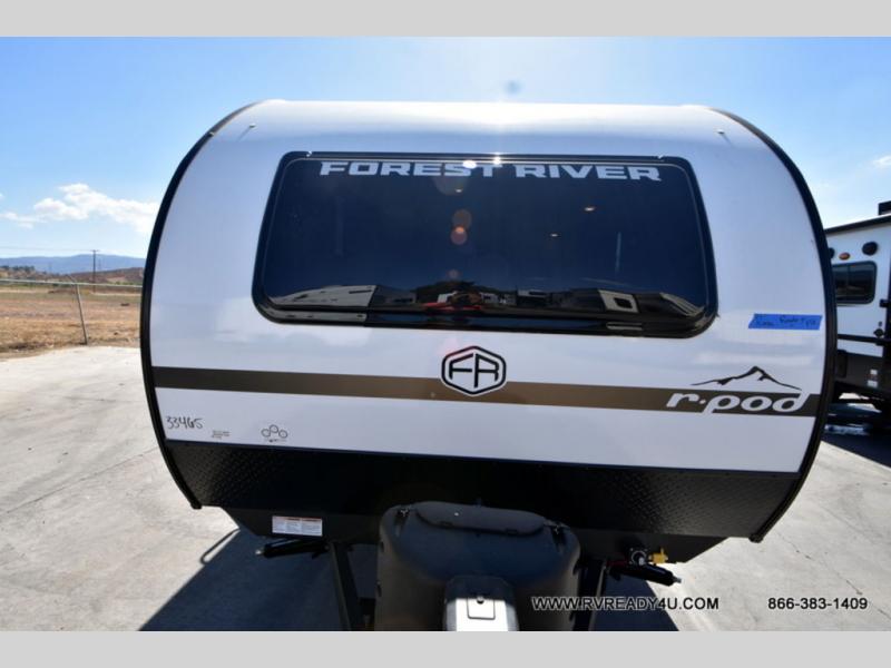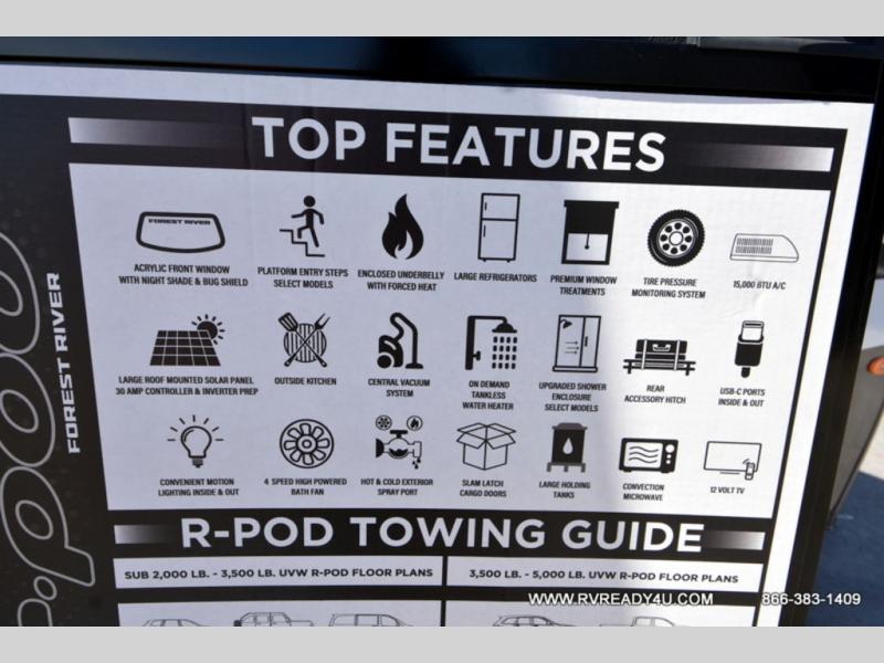 With any R-Pod travel trailer by Forest River, you will enjoy affordable luxury at the lowest tow weight in its class! There is a sealed underbelly with forced heat, a curved dual-pane acrylic front window with a bug screen and night shade, plus a large roof mounted solar panel for off-grid capabilities. The 15K A/C unit will keep you comfortable during the summer camping months, and the tankless water heater will provide endless hot showers after hiking, biking, swimming and more! Each model also includes a black glass friction hinge entrance door, roof ladder prep, exterior motion lighting, plus a hot and cold exterior spray port to wash off sand from the beach. Inside, you'll enjoy seamless Surf-X kitchen countertops, blackout roller shades, and a central vacuum system for hassle-free cleaning!