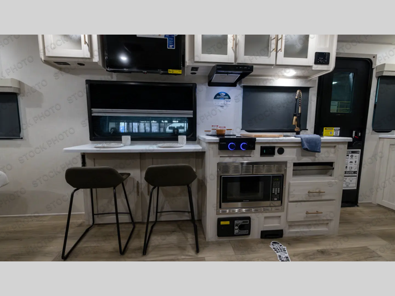 A front bedroom with a walk-around queen bed, a full bath, and a theater seat slide out are a few of the features that you are sure to want in your next RV! You can rest comfortably each night, plus all your clothing can be stored in the dual wardrobes to keep everything tidy. If you're needing more sleeping space, just choose the optional tri-fold sofa or optional booth dinette in place of the theater seat! The chef of your group can make meals on the two burner cooktop or in the convection microwave, and there is a 12V black glass refrigerator for perishables. And the bar top with two seats and the flip-up window provide a great view outdoors as you dine together.