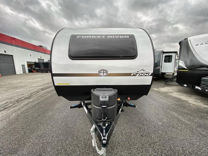 With any R-Pod travel trailer by Forest River, you will enjoy affordable luxury at the lowest tow weight in its class! There is a sealed underbelly with forced heat, a curved dual-pane acrylic front window with a bug screen and night shade, plus a large roof mounted solar panel for off-grid capabilities. The 15K A/C unit will keep you comfortable during the summer camping months, and the tankless water heater will provide endless hot showers after hiking, biking, swimming and more! Each model also includes a black glass friction hinge entrance door, roof ladder prep, exterior motion lighting, plus a hot and cold exterior spray port to wash off sand from the beach. Inside, you'll enjoy seamless Surf-X kitchen countertops, blackout roller shades, and a central vacuum system for hassle-free cleaning!