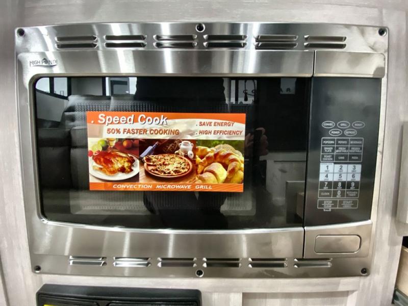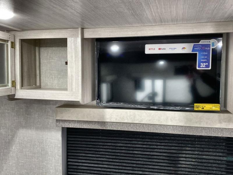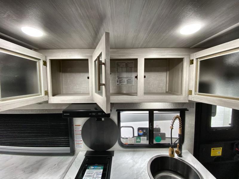 A front bedroom with a walk-around queen bed, a full bath, and a theater seat slide out are a few of the features that you are sure to want in your next RV! You can rest comfortably each night, plus all your clothing can be stored in the dual wardrobes to keep everything tidy. If you're needing more sleeping space, just choose the optional tri-fold sofa or optional booth dinette in place of the theater seat! The chef of your group can make meals on the two burner cooktop or in the convection microwave, and there is a 12V black glass refrigerator for perishables. And the bar top with two seats and the flip-up window provide a great view outdoors as you dine together.