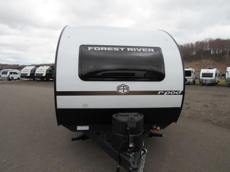 With any R-Pod travel trailer by Forest River, you will enjoy affordable luxury at the lowest tow weight in its class! There is a sealed underbelly with forced heat, a curved dual-pane acrylic front window with a bug screen and night shade, plus a large roof mounted solar panel for off-grid capabilities. The 15K A/C unit will keep you comfortable during the summer camping months, and the tankless water heater will provide endless hot showers after hiking, biking, swimming and more! Each model also includes a black glass friction hinge entrance door, roof ladder prep, exterior motion lighting, plus a hot and cold exterior spray port to wash off sand from the beach. Inside, you'll enjoy seamless Surf-X kitchen countertops, blackout roller shades, and a central vacuum system for hassle-free cleaning!